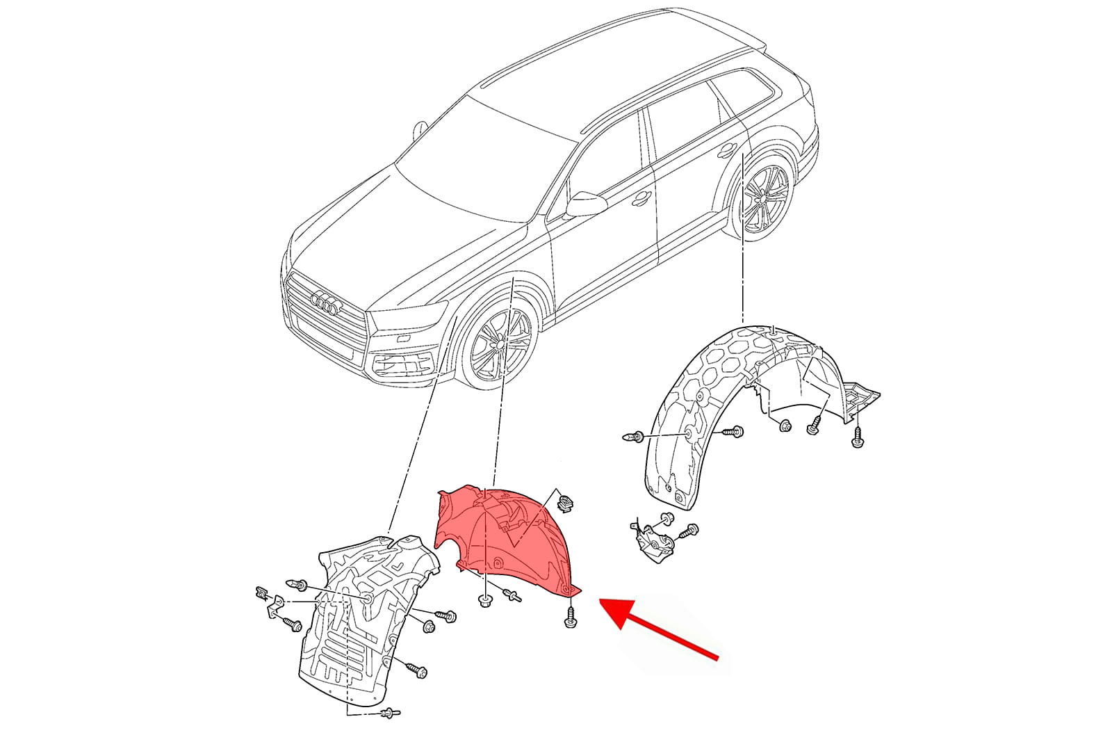 Wewnętrzne nadkole materiałowe przednie lewe (część tylna), dla AUDI Q7 (4M) 2015-2020 (wersja przed faceliftingiem).