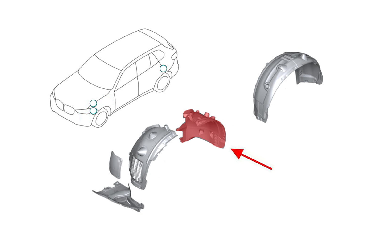 Wewnętrzne nadkole materiałowe przednie lewe (część tylna), do BMW X5 (G05) 2018+.