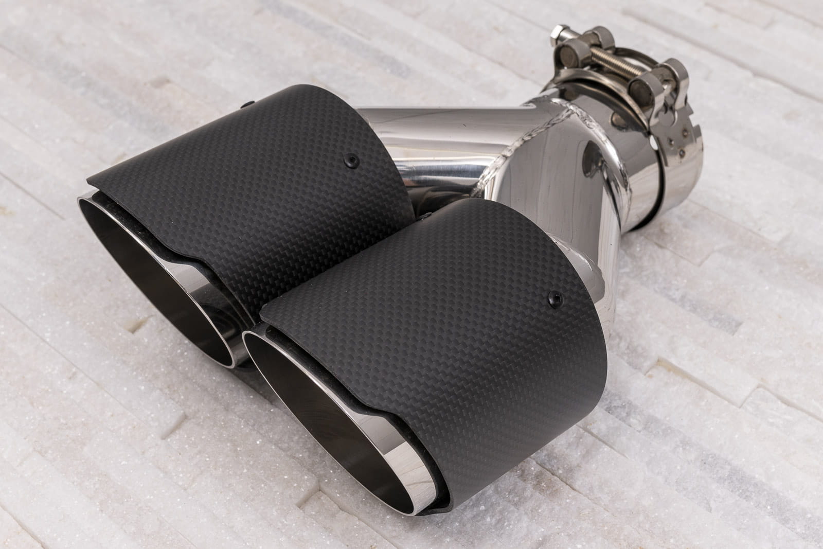 Montaż odbywa się poprzez nałożenie elementu na oryginalną rurę wydechu oraz dokręcenie znajdujących się w zestawie śrub, mocujących końcówkę na stałe. Zalecamy montaż profesjonalny.