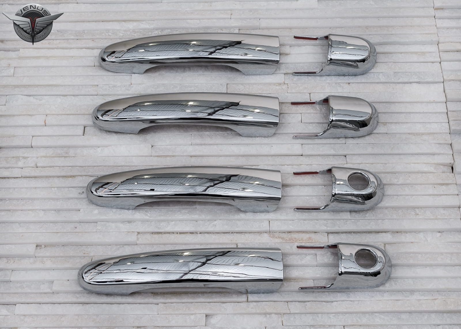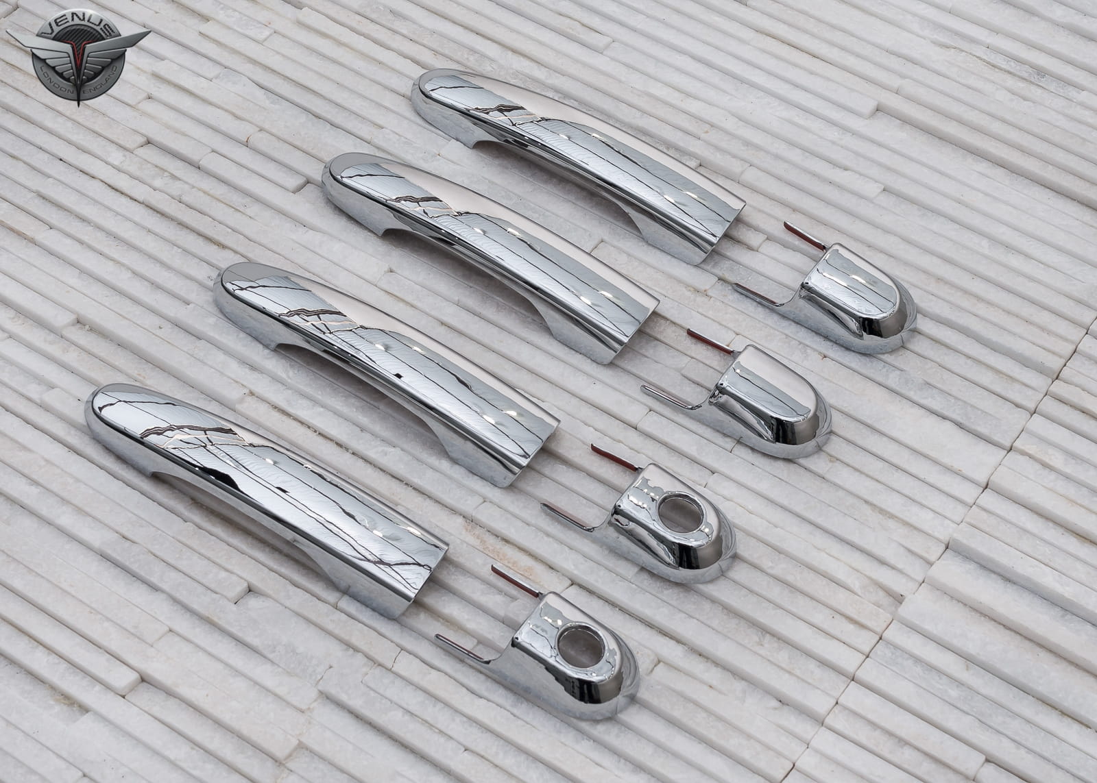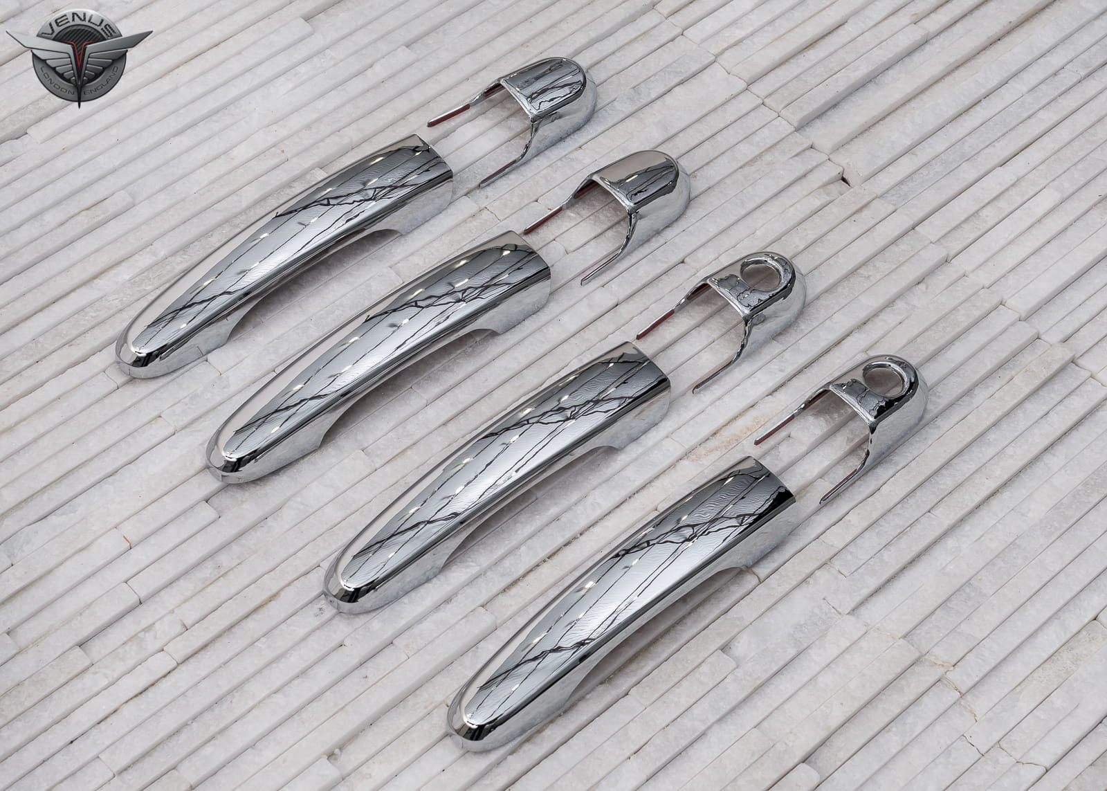 Dekoracyjne, chromowane nakładki na klamki to dodatek, który uzupełnia stylizację samochodu nutą sportowej elegancji. Idealnie dopasowane do linii samochodu, odmieniają wizerunek klamek czyniąc z nich prawdziwą ozdobę samochodu. Produkt wykonany z wysokiej jakości chromowanego tworzywa ABS.