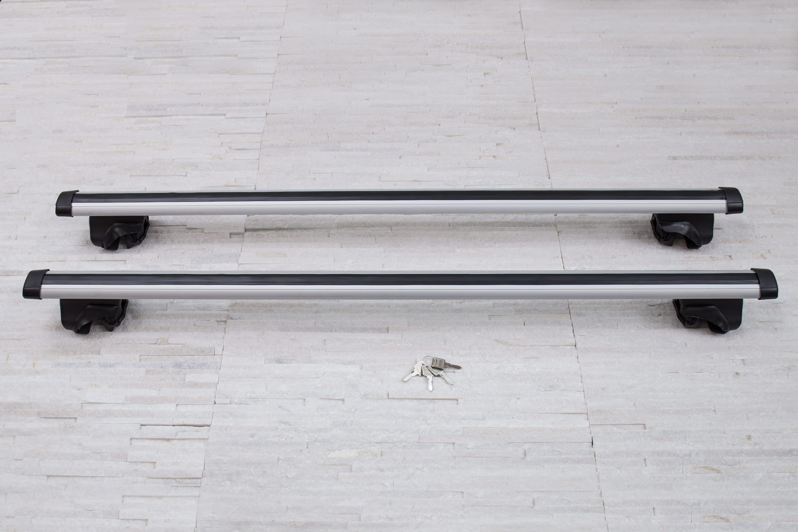 W komplecie znajdują się: dwie belki aluminiowe i cztery zaciski i system zabezpieczenia z kluczykami.