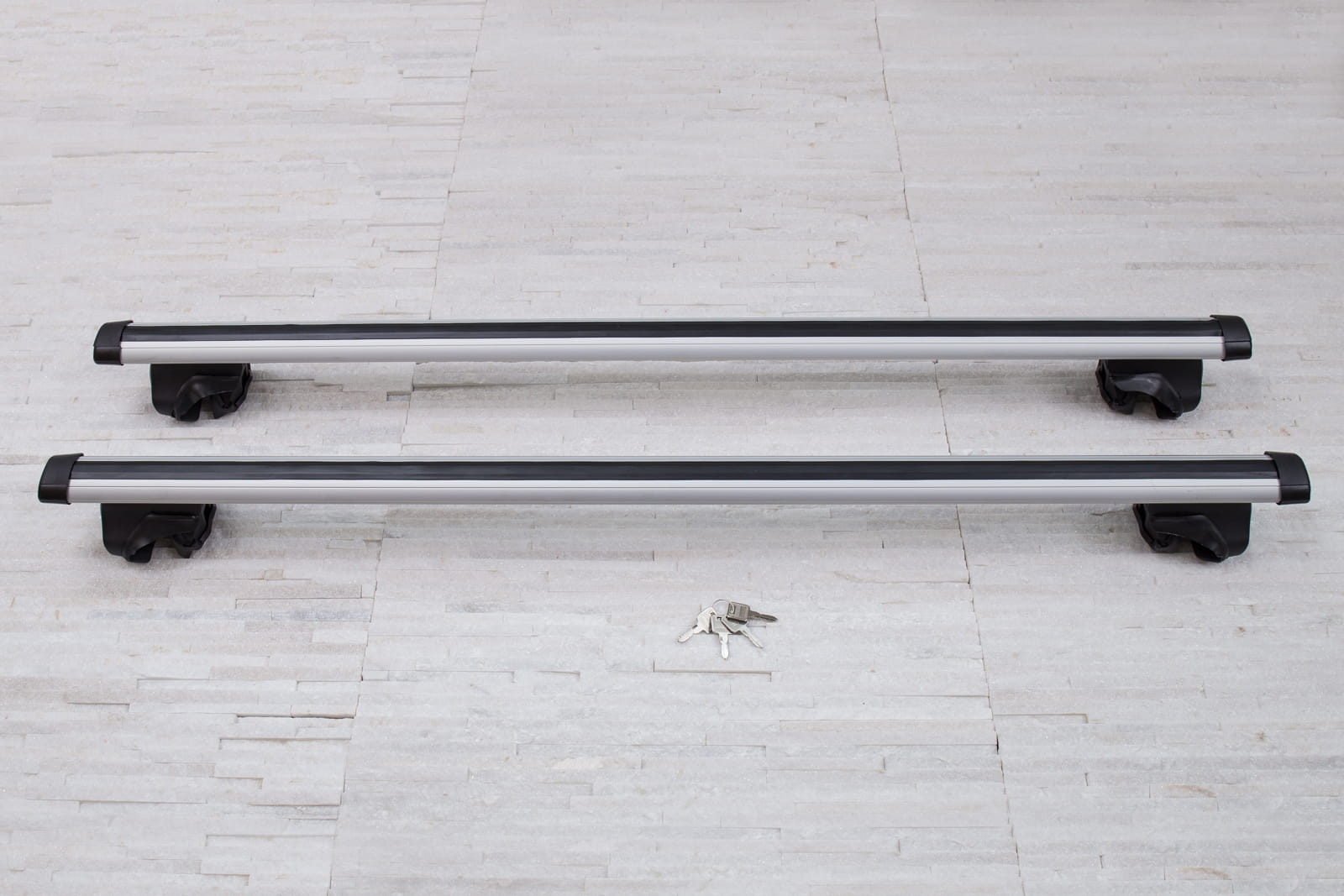 W komplecie znajdują się: dwie belki aluminiowe i cztery zaciski i system zabezpieczenia z kluczykami.