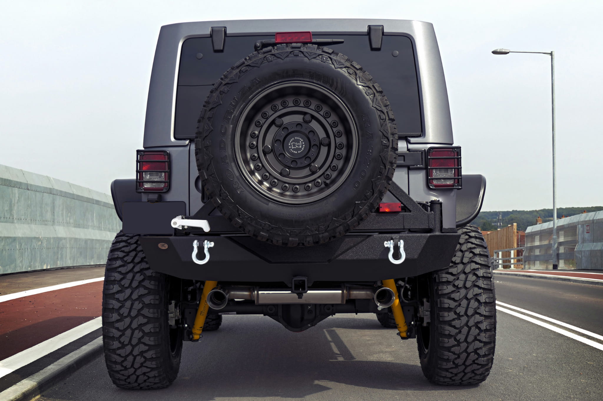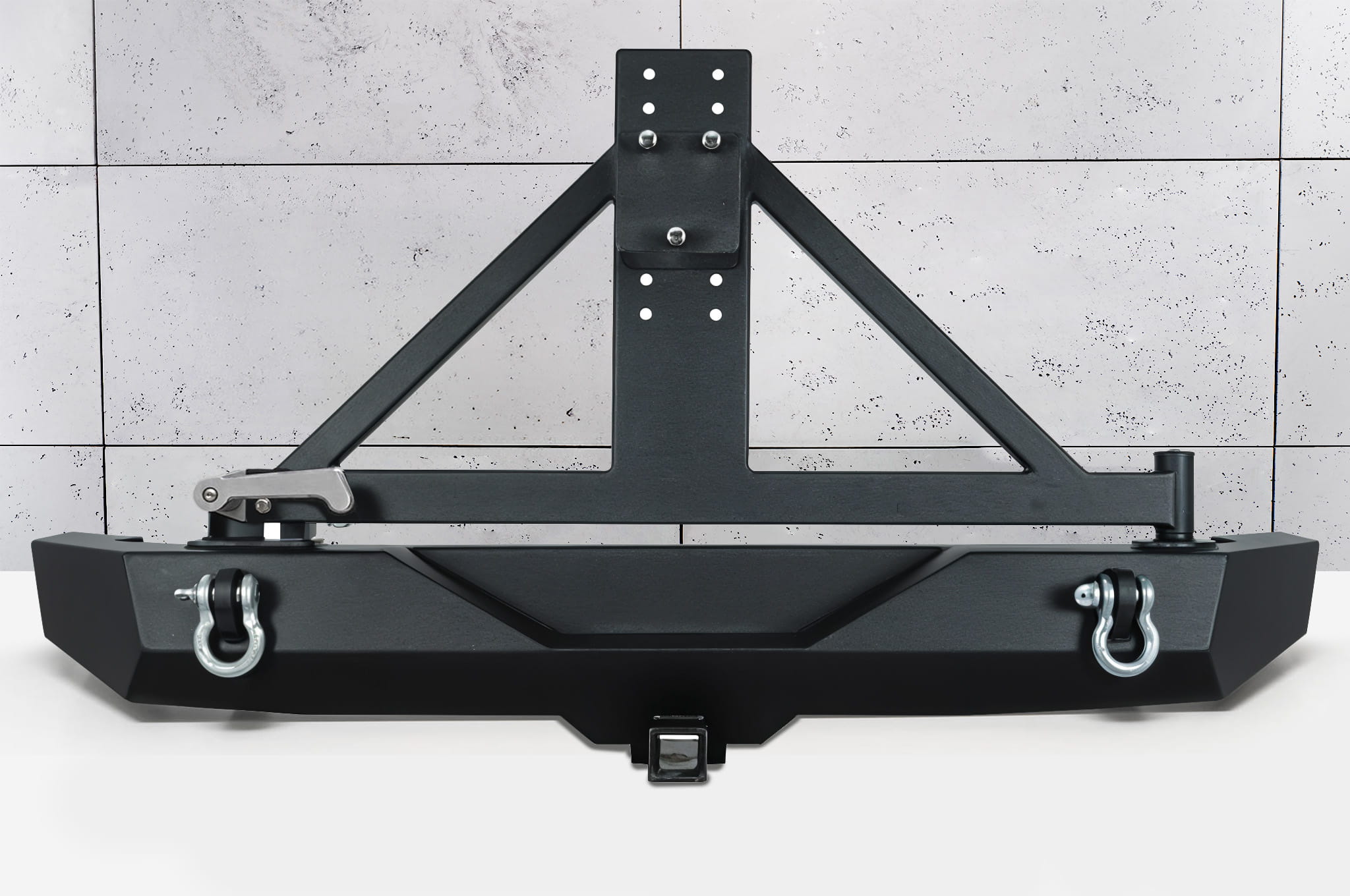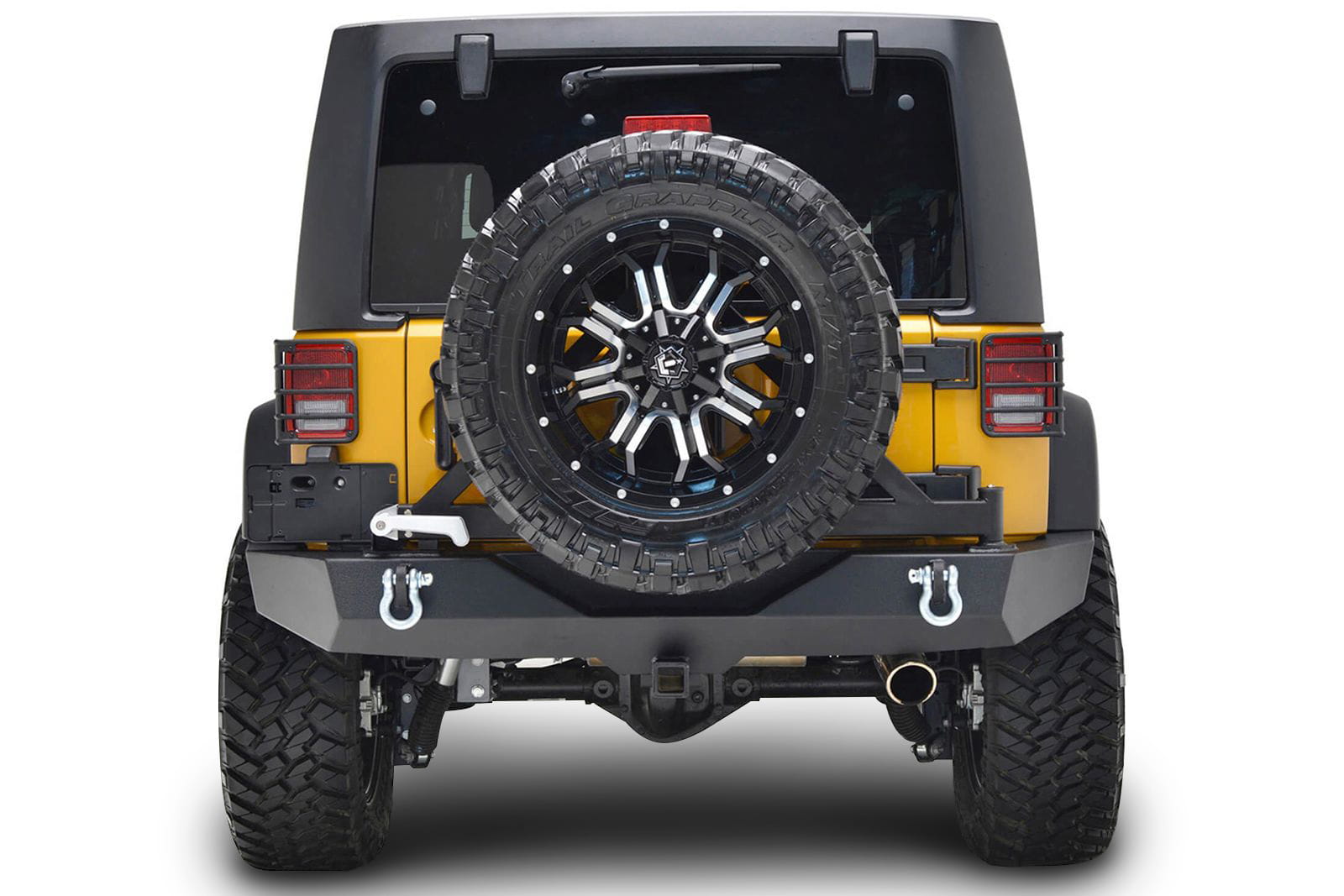 Zderzak tylny z mocowaniem koła zapasowego. Produkt został zaprojektowany przez kalifornijską firmę Paramont Automotive specjalnie dla Jeep Wrangler JK 2007-2018. Zarówno zderzak, jak i ramię koła wykonane zostały ze stali o grubości 5 mm walcowanej na zimno, którą dodatkowo zabezpieczono w dwustopniowym procesie malowania proszkowego z użyciem epoksydowej wstępnej powłoki, co stworzyło solidną, czarną strukturę "TIGER textured".