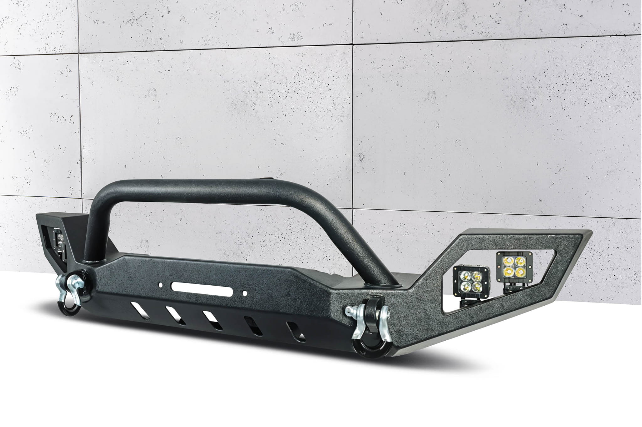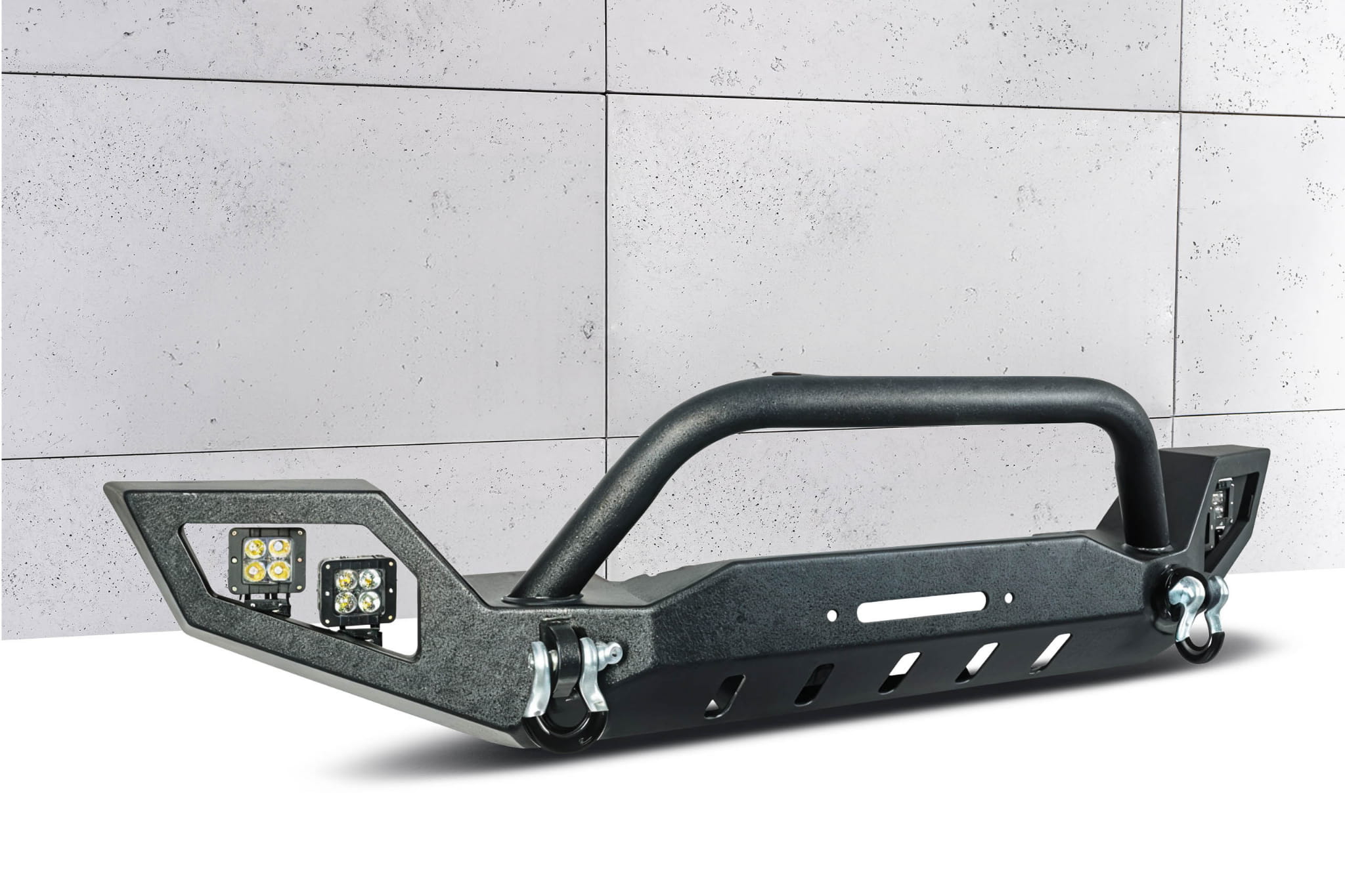 Rura zderzaka osłaniająca przedni grill Wranglera wyposażona jest w dwa uchwyty do montażu dodatkowego oświetlenia. Zderzak posiada także silne mocowania na szekle, które znajdują się w komplecie, a także miejsce na instalacje wyciągarki do 5500 kg pod linę syntetyczną. Posiada dodatkowe, podwójne oświetlenie off-road. Wszystko to sprawia, że niniejszy model zderzaka doskonale sprawdza się w warunkach jazdy off-roadowej, ale także wzbogaca stylizację samochodu, podkreślając sportową duszę Jeepa.