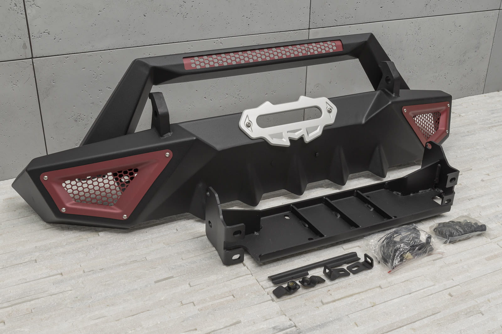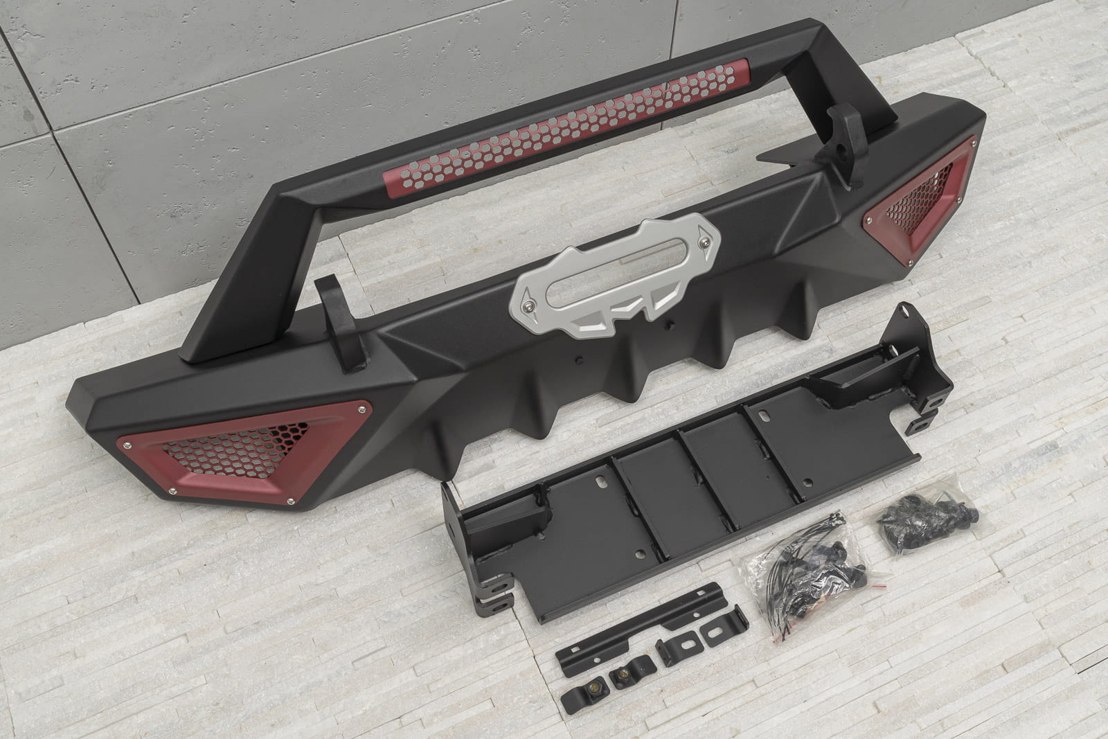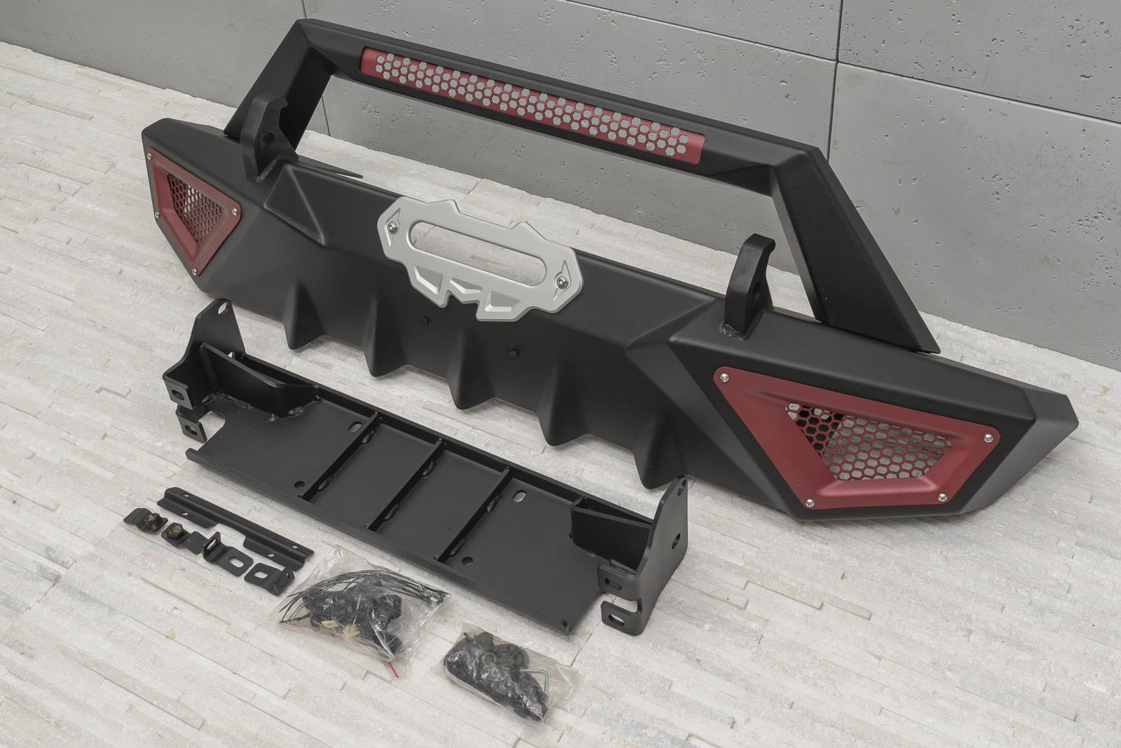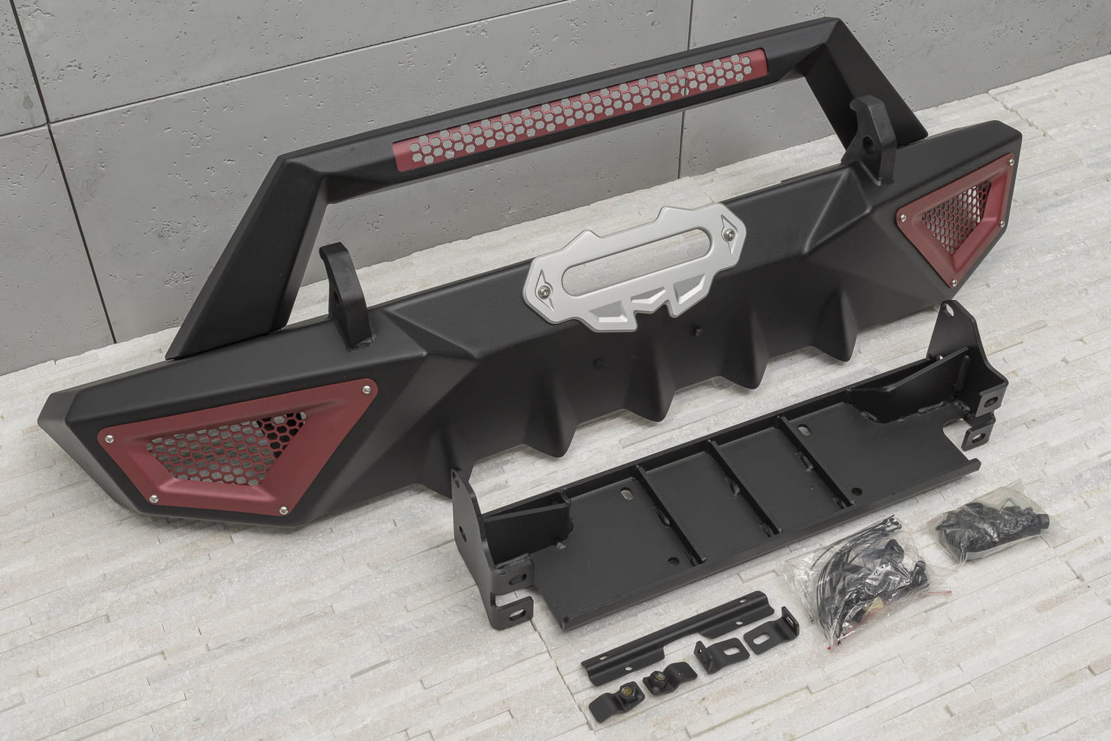 Przedni zderzak z pałąkiem, przeznaczony dla Jeep Wrangler JL 2018+. Stylowy zderzak nie tylko zabezpiecza front Wranglera, ale także uzupełnia stylizację samochodu oryginalnym, sportowym designem. Istnieje możliwość podłączenia wyciągarki do 5500 kg z liną syntetyczną, dla której jest przygotowane specjalne miejsce. Zderzak wyposażony jest również w uchwyty pod szekle. Pałąk zderzaka osłania przedni grill Wranglera.