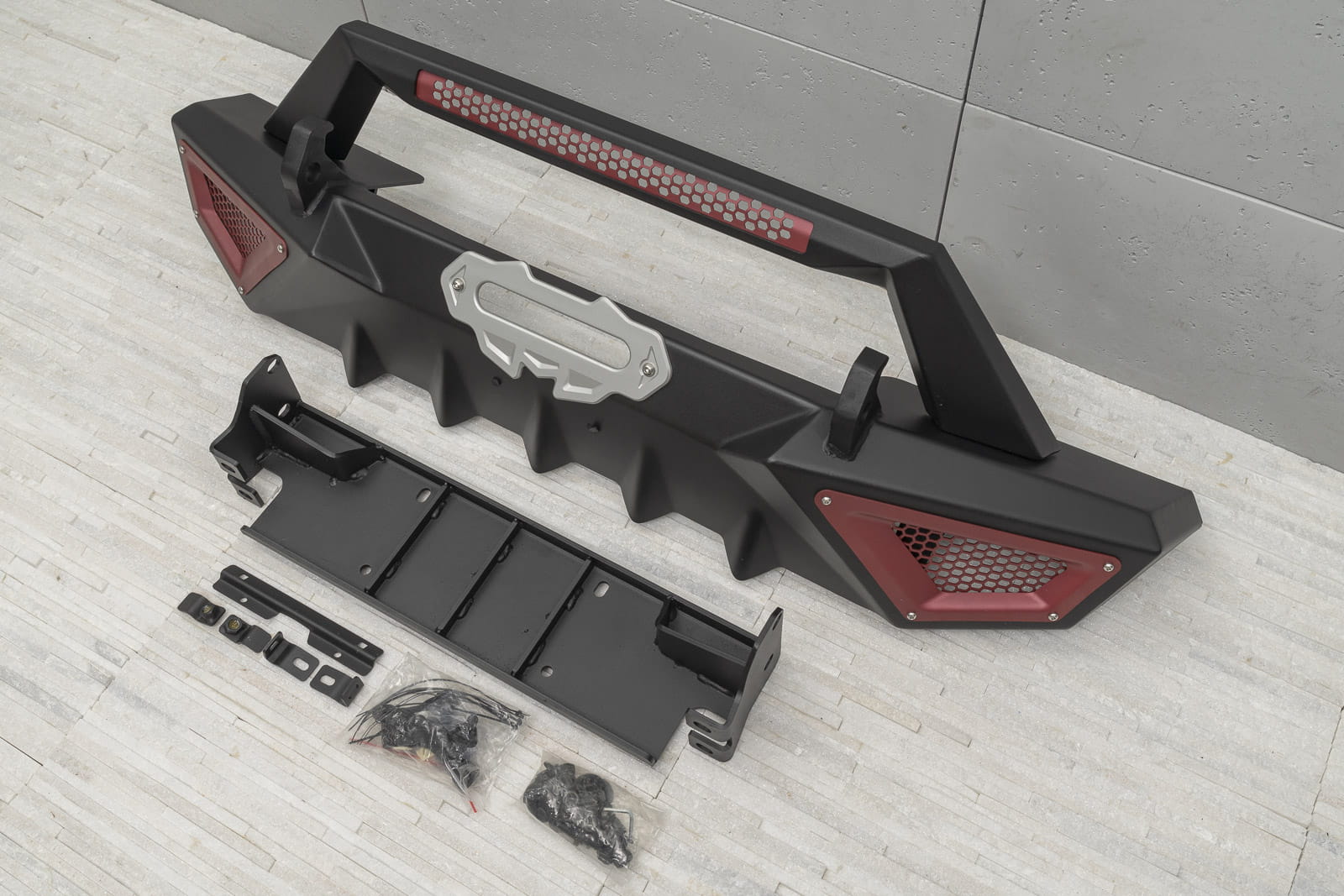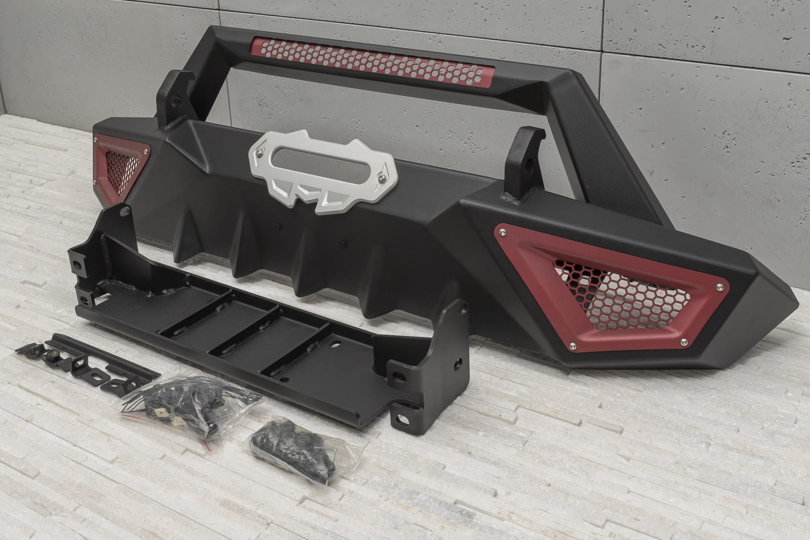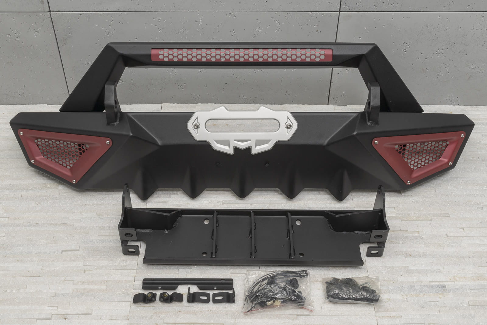 Przedni zderzak z pałąkiem, przeznaczony dla Jeep Wrangler JL 2018+. Stylowy zderzak nie tylko zabezpiecza front Wranglera, ale także uzupełnia stylizację samochodu oryginalnym, sportowym designem. Istnieje możliwość podłączenia wyciągarki do 5500 kg z liną syntetyczną, dla której jest przygotowane specjalne miejsce. Zderzak wyposażony jest również w uchwyty pod szekle. Pałąk zderzaka osłania przedni grill Wranglera.