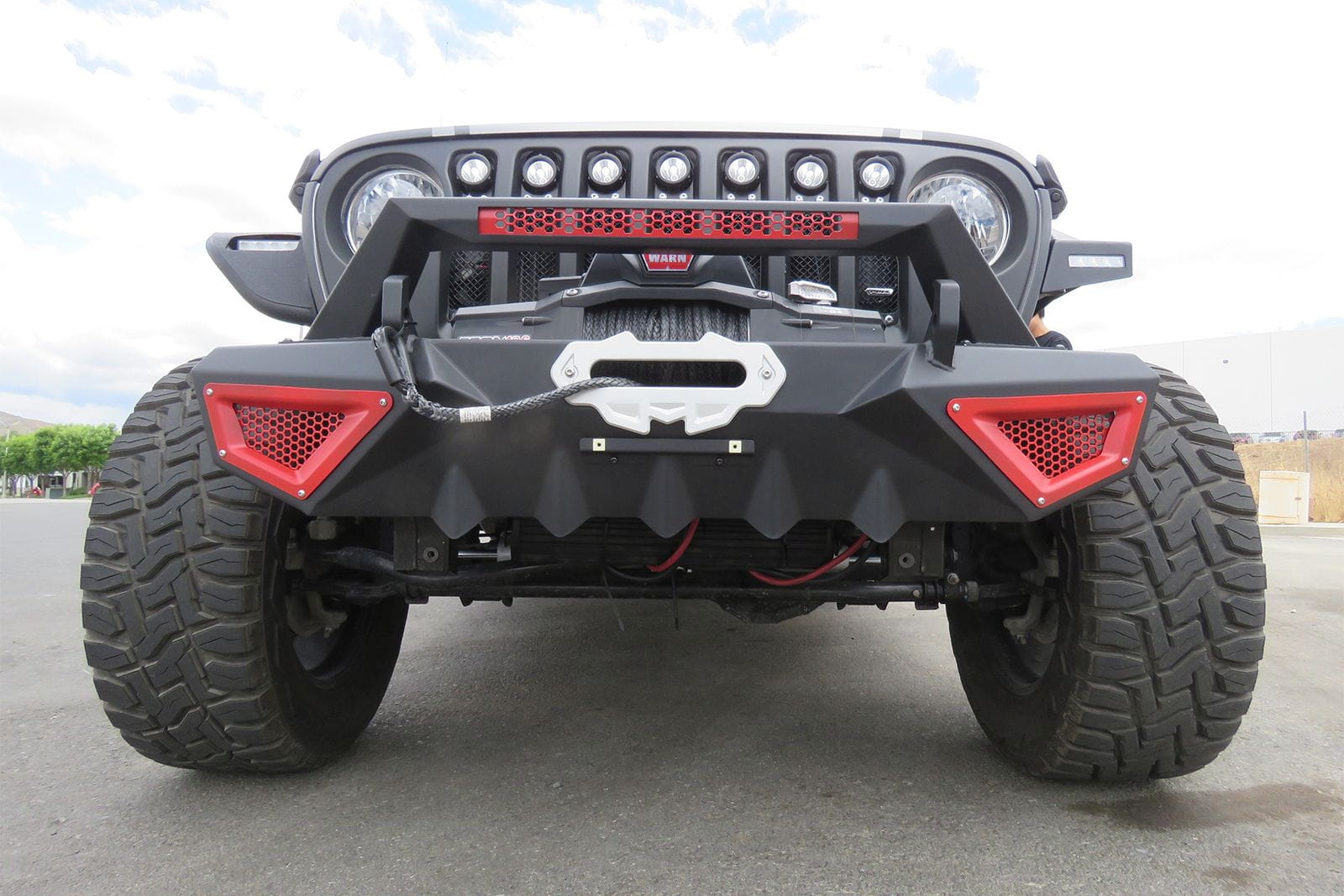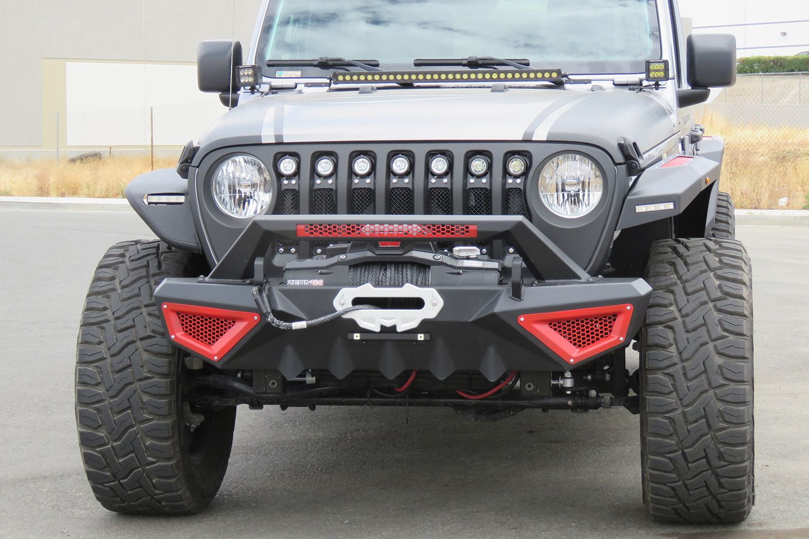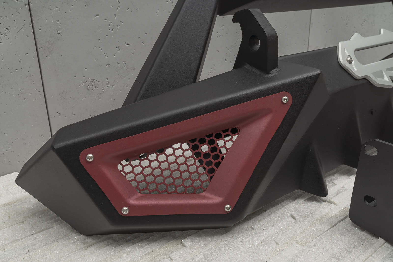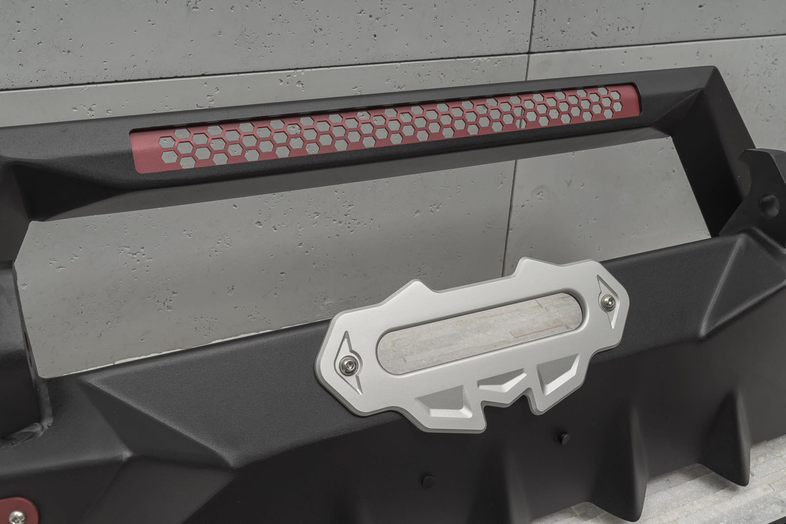 Przedni zderzak z pałąkiem, przeznaczony dla Jeep Wrangler JL 2018+. Stylowy zderzak nie tylko zabezpiecza front Wranglera, ale także uzupełnia stylizację samochodu oryginalnym, sportowym designem. Istnieje możliwość podłączenia wyciągarki do 5500 kg z liną syntetyczną, dla której jest przygotowane specjalne miejsce. Zderzak wyposażony jest również w uchwyty pod szekle. Pałąk zderzaka osłania przedni grill Wranglera.