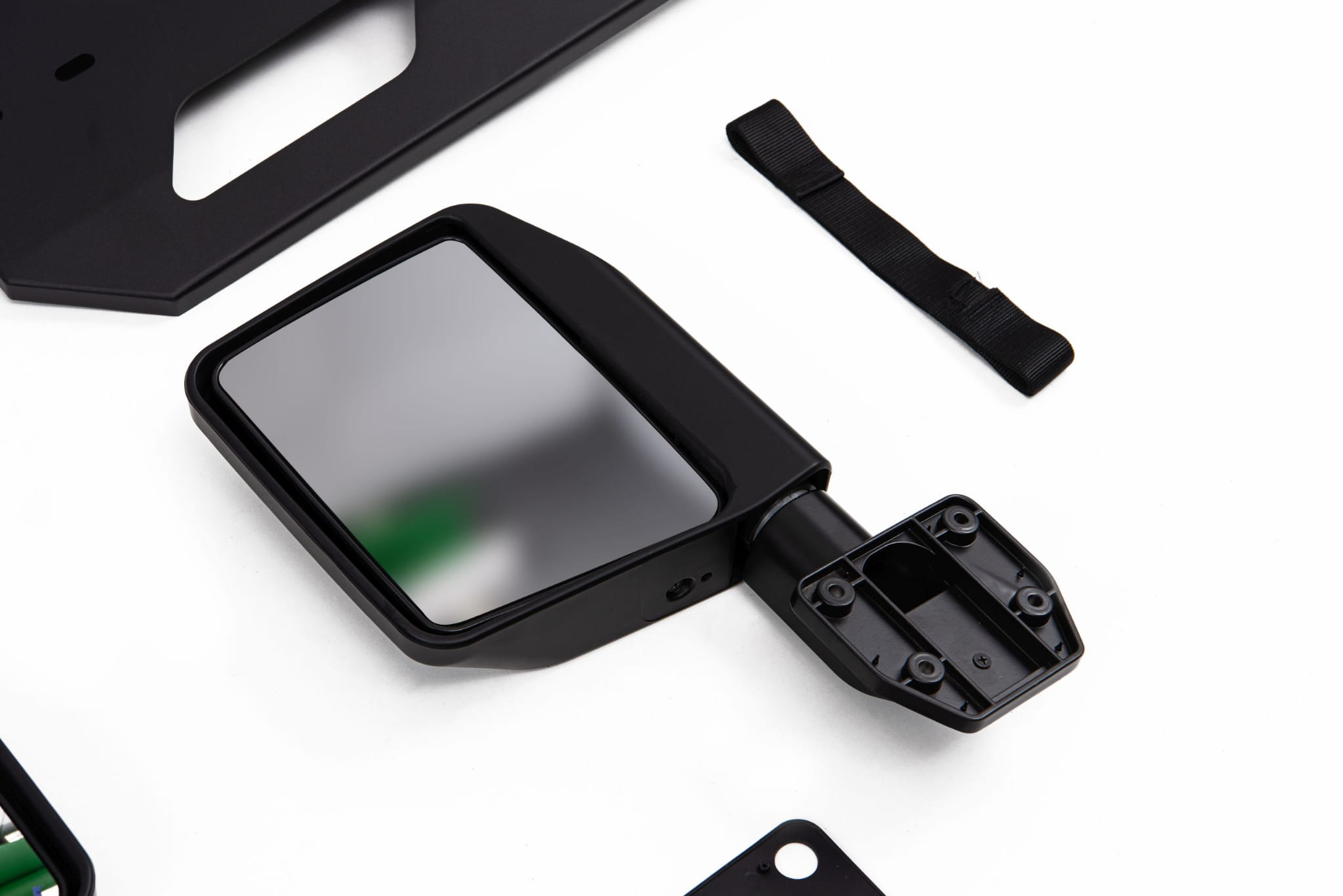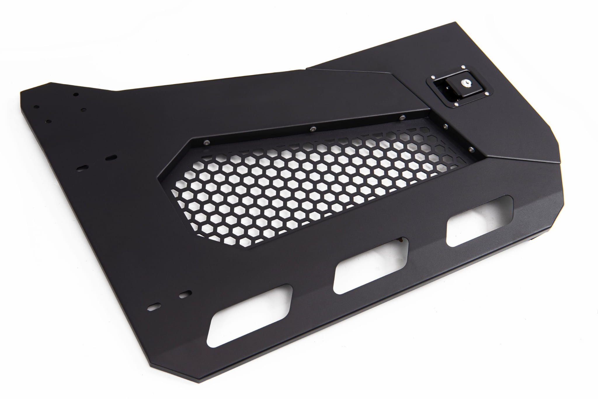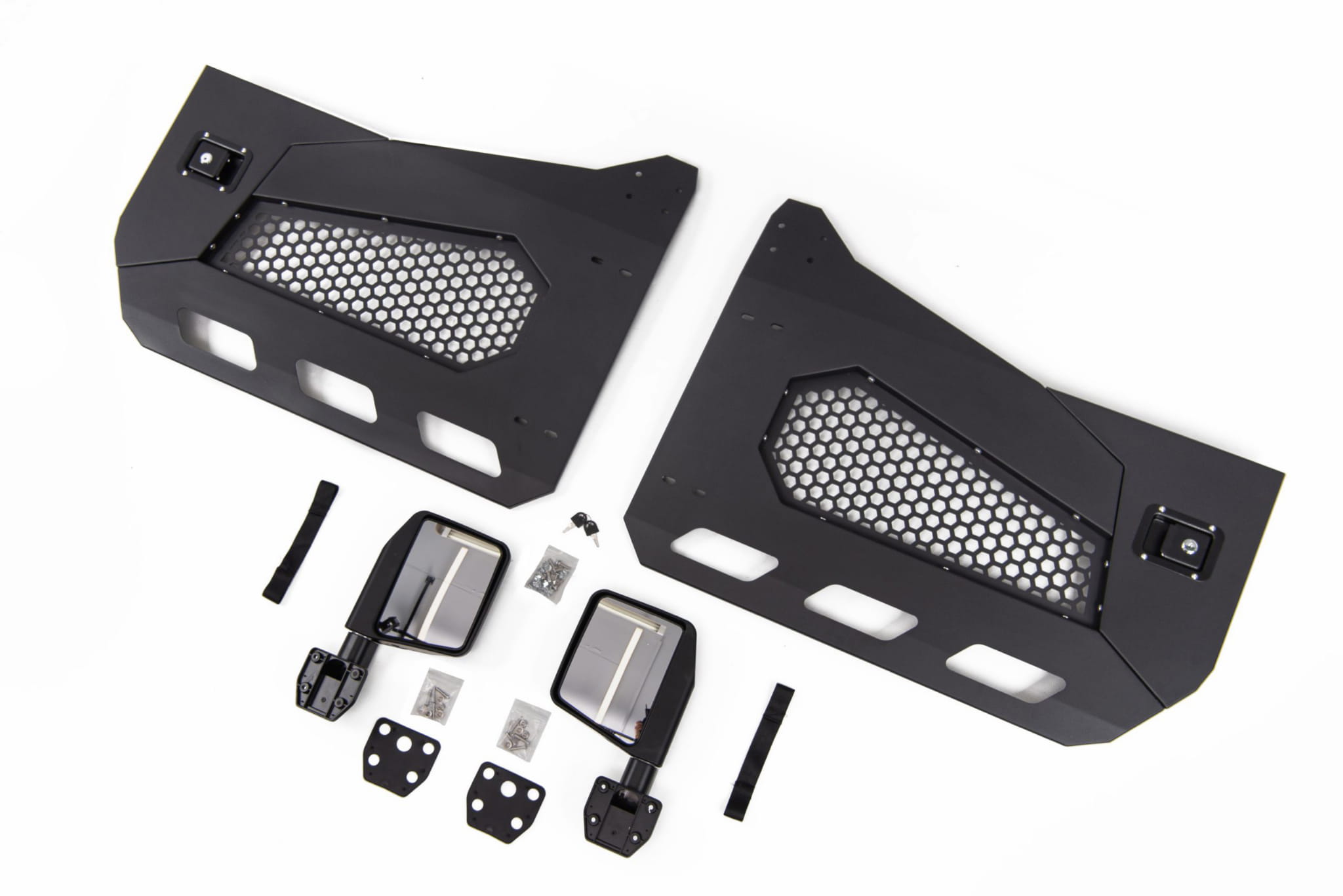 Drzwi wykonane są ze stali i pokryte są czarną farbą strukturalną. W komplecie z klamkami zamykanymi na kluczyk i kompletem lusterek. Wyróżniają się niewielką wagą i dużą wytrzymałością - grubość płyty stalowej to 5 mm!!! Doskonale spiszą się w terenie chroniąc wnętrze auta przed błotem i wodą jednocześnie dając swobodę kontroli trasy.