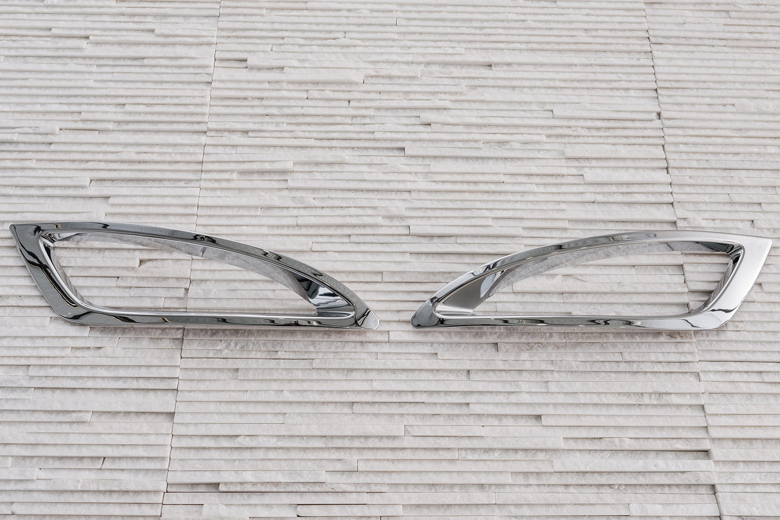 Produkt wykonany jest z wysokiej jakości chromowanego tworzywa ABS. W zestawie znajduje się komplet dwóch nakładek na przednie lampy przeciwmgielne.