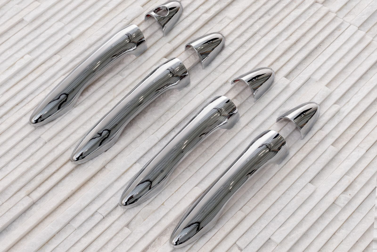 Zestaw zawiera komplet czterech nakładek na klamki. Montowane są za pomocą taśmy dwustronnie klejącej Scotch 3M, zaaplikowanej na wewnętrznej stronie elementów. Nakłada się je na powierzchnię odtłuszczoną przy pomocy benzyny ekstrakcyjnej lub spirytusu, w temperaturach dodatnich od 18 st.C. Zalecamy montaż profesjonalny.
