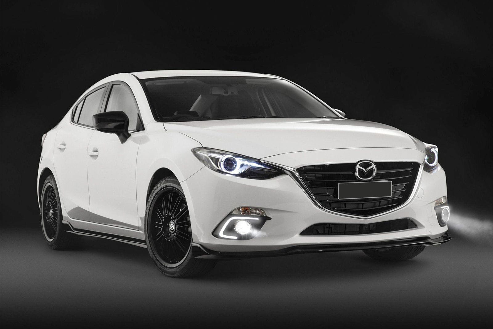 Komplet tuningowych świateł do jazdy dziennej z funkcją kierunkowskazu dedykowany do modelu, dedykowany do modelu MAZDA 3 III (BM) 2014-2016 (wersja przed liftingiem). Światła pasują zarówno do wersji z, jak i bez przednich halogenów.