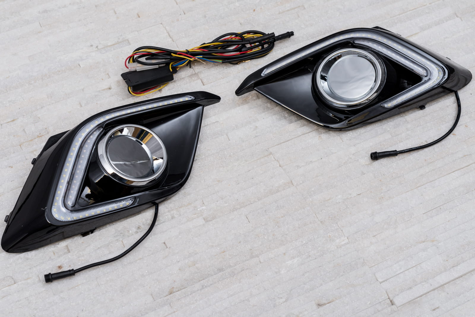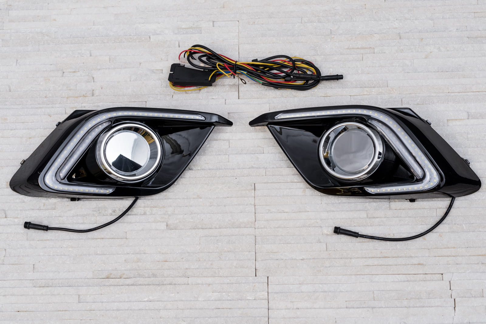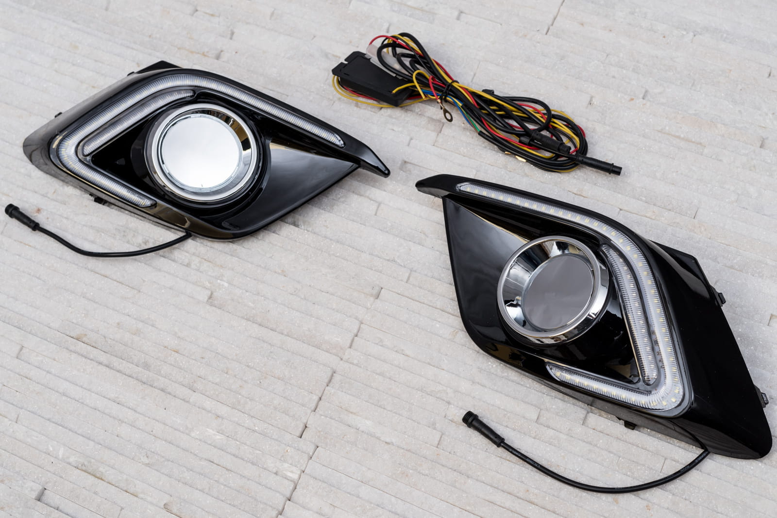 Elementy świateł wykonane zostały z wysokiej jakości tworzyw. W komplecie znajdują się dwie lampy wraz z okablowaniem i jednostką sterującą.