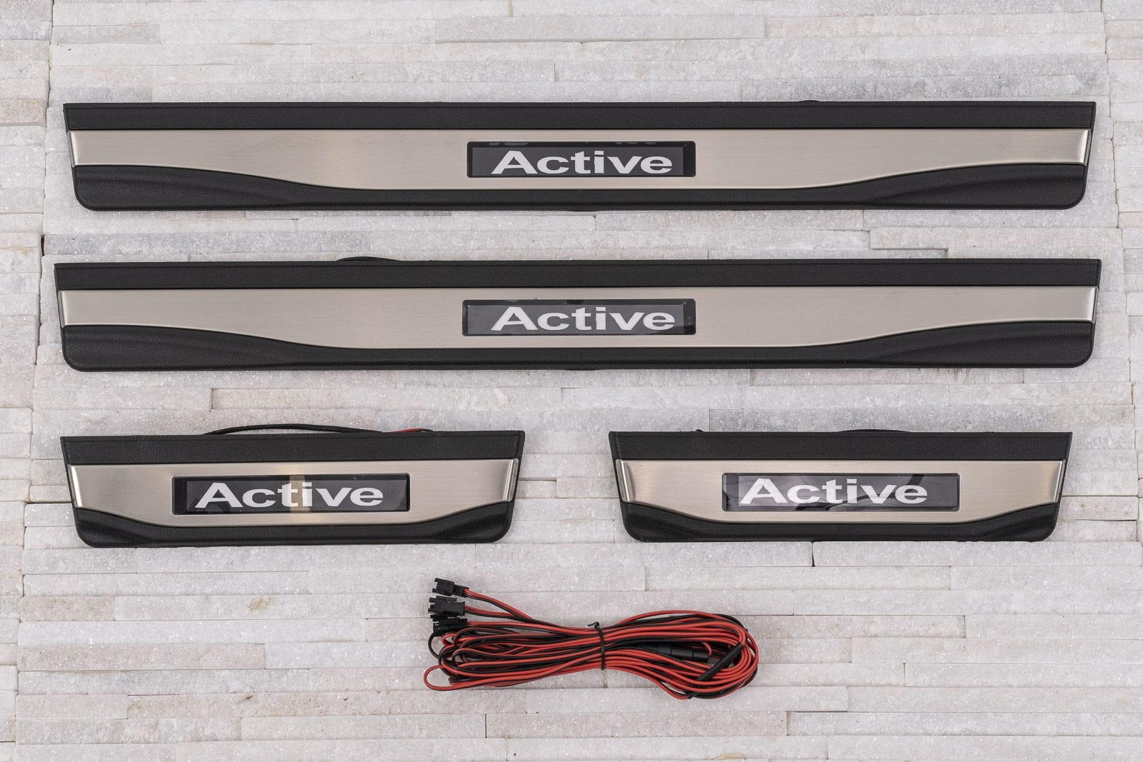 Listwy progowe wewnętrzne LED zaprojektowane dla MAZDA 3 IV (BP) 2019+. Listwy montowane są na lakierowane części progów wewnętrznych. Uzupełniają linię wewnętrzną drzwi, nadają okolicy progów sportowy i elegancki wygląd. Model ten przykuwa uwagę ozdobnym, podświetlanym na niebiesko napisem ACTIVE. Dzięki wbudowanemu oświetleniu LED, element nie tylko podkreśla nowoczesny styl samochodu, ale także rozświetla okolice progu, ułatwiając tym samym wsiadanie i wysiadanie. Oprócz walorów stylizacyjnych, listwy odgrywają rolę ochronną, zabezpieczając progi przed zarysowaniem i uszkodzeniami, jakie mogą powstać przy wsiadaniu oraz wysiadaniu z auta. Elementy wykonane są z trwałej stali nierdzewnej. Ich efekt stylizacyjny podkreśla połączenie dwóch efektów wykończenia stali - szczotkowanej oraz czarnego tworzywa motoryzacyjnego ABS.