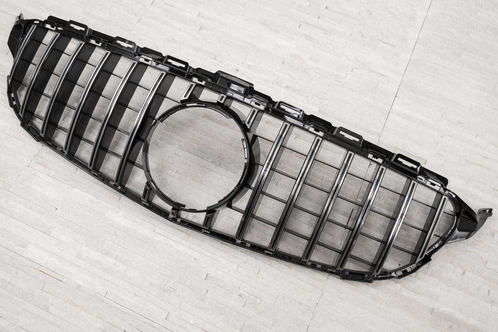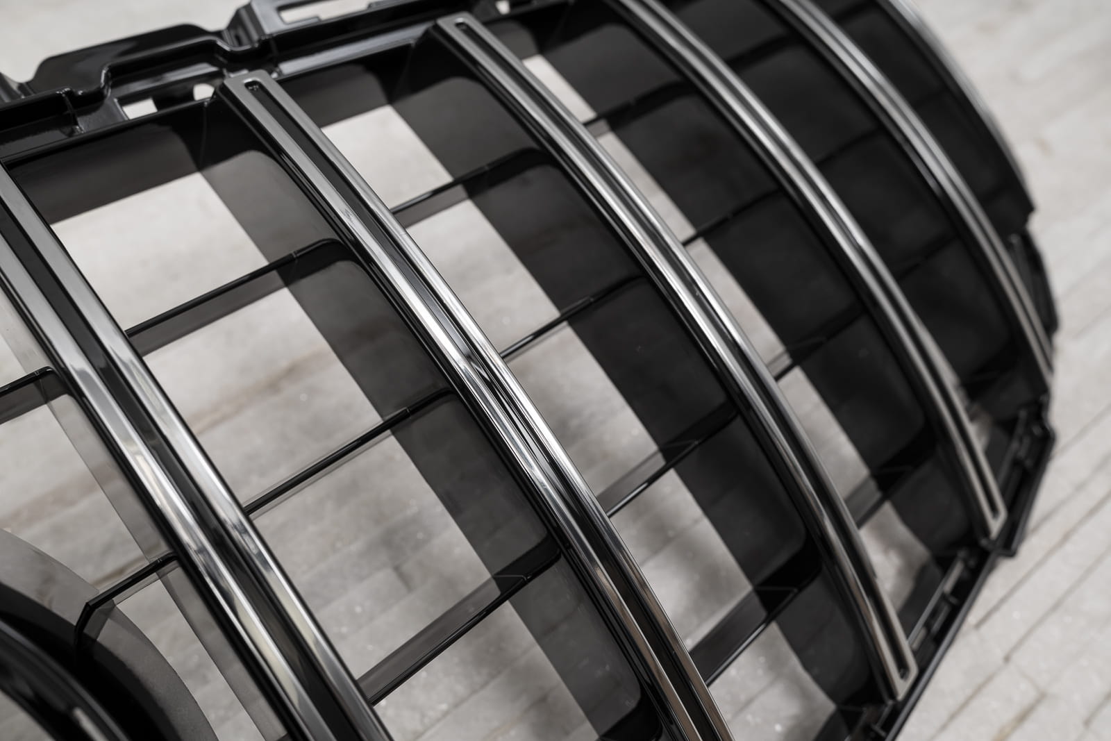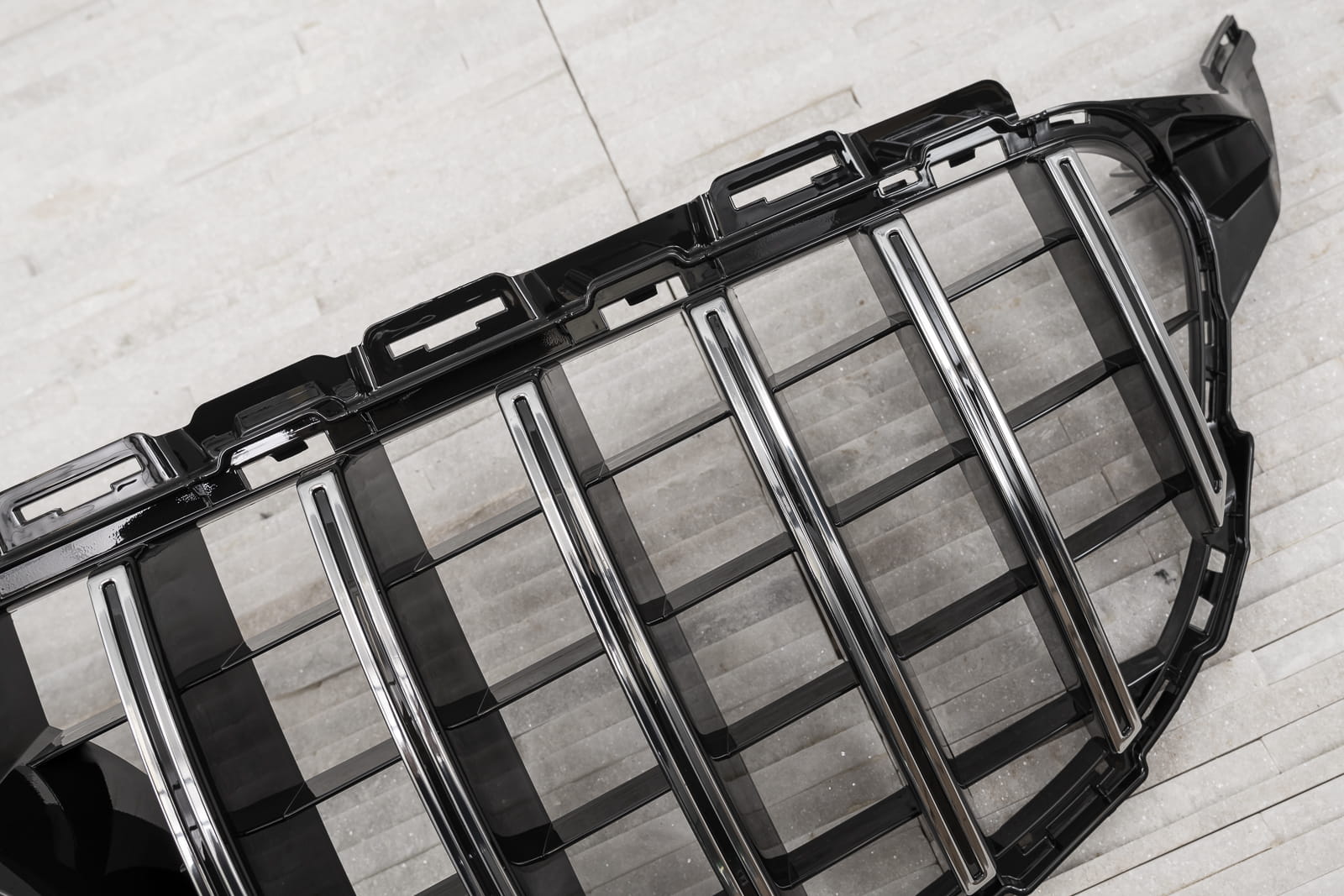 Dedykowany grill zaprojektowany został w stylu charakterystycznym dla samochodów z segmentu GT. Kratka grilla ozdobiona została szerokimi, chromowanymi poprzeczkami, które nieodzownie przywodzą na myśl budzące respekt, pełne mocy samochody z najwyższej półki. Element zachwyca sportowym charakterem, a połysk chromowanych elementów dodaje mu elegancji - dzięki czemu doskonale współgra z imponującym designem Mercedesa.