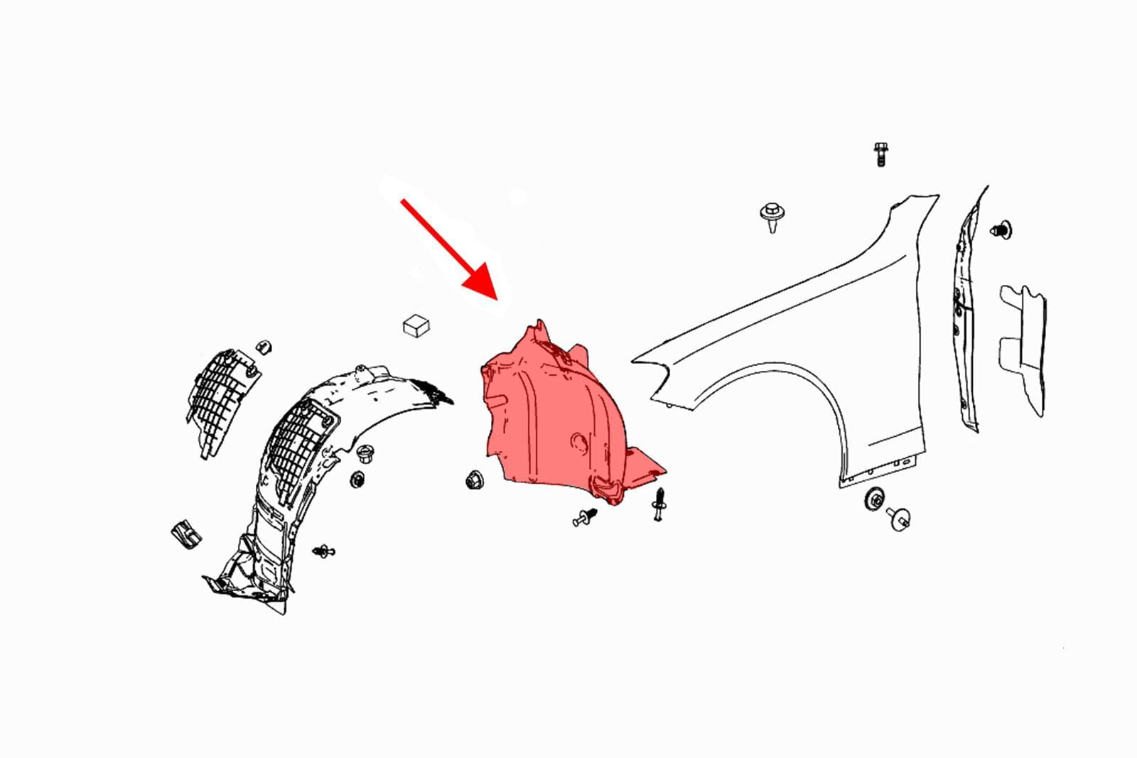 Wewnętrzne nadkole przednie lewe (część tylna), dla MERCEDES C-CLASS (W205) 2014-2018 (wersja przed faceliftingiem). Pasuje również do wersji AMG, z wyjątkiem C205 Coupe z pakietem Sport/AMG.