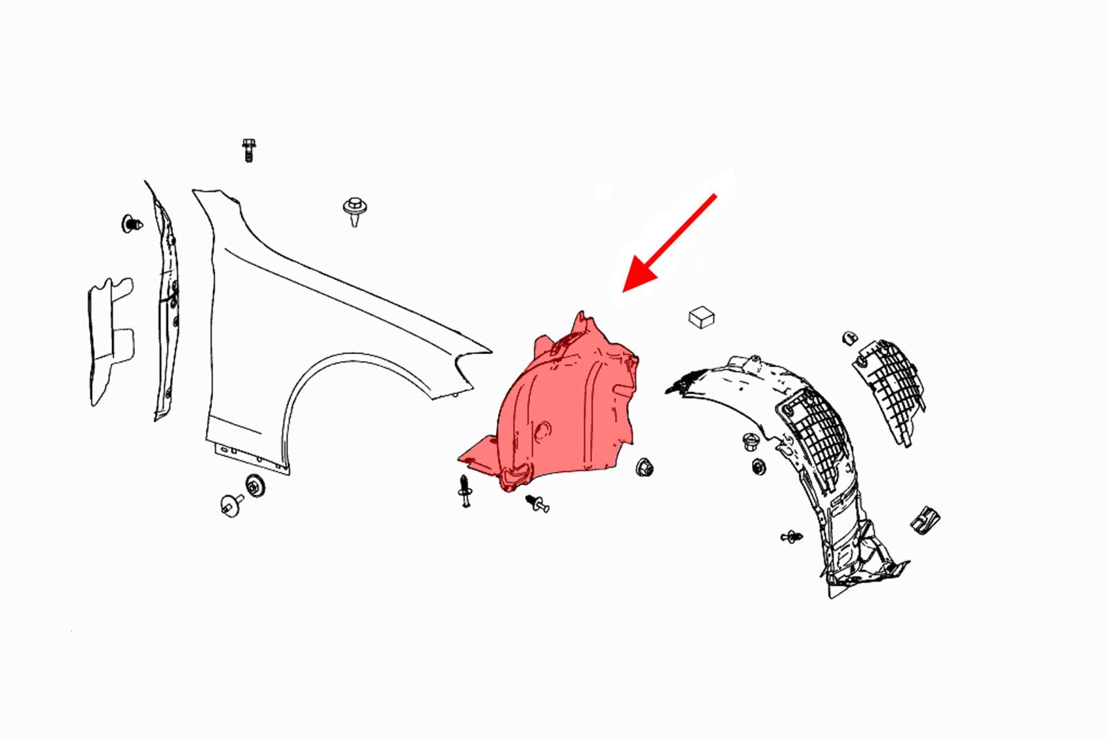 Wewnętrzne nadkole przednie prawe (część tylna), dla MERCEDES KLASY C (W205) 2014-2018 (wersja przed faceliftingiem). Pasuje również do wersji AMG. Nie pasuje do W205 w wersji sedan z pakietem Sport.