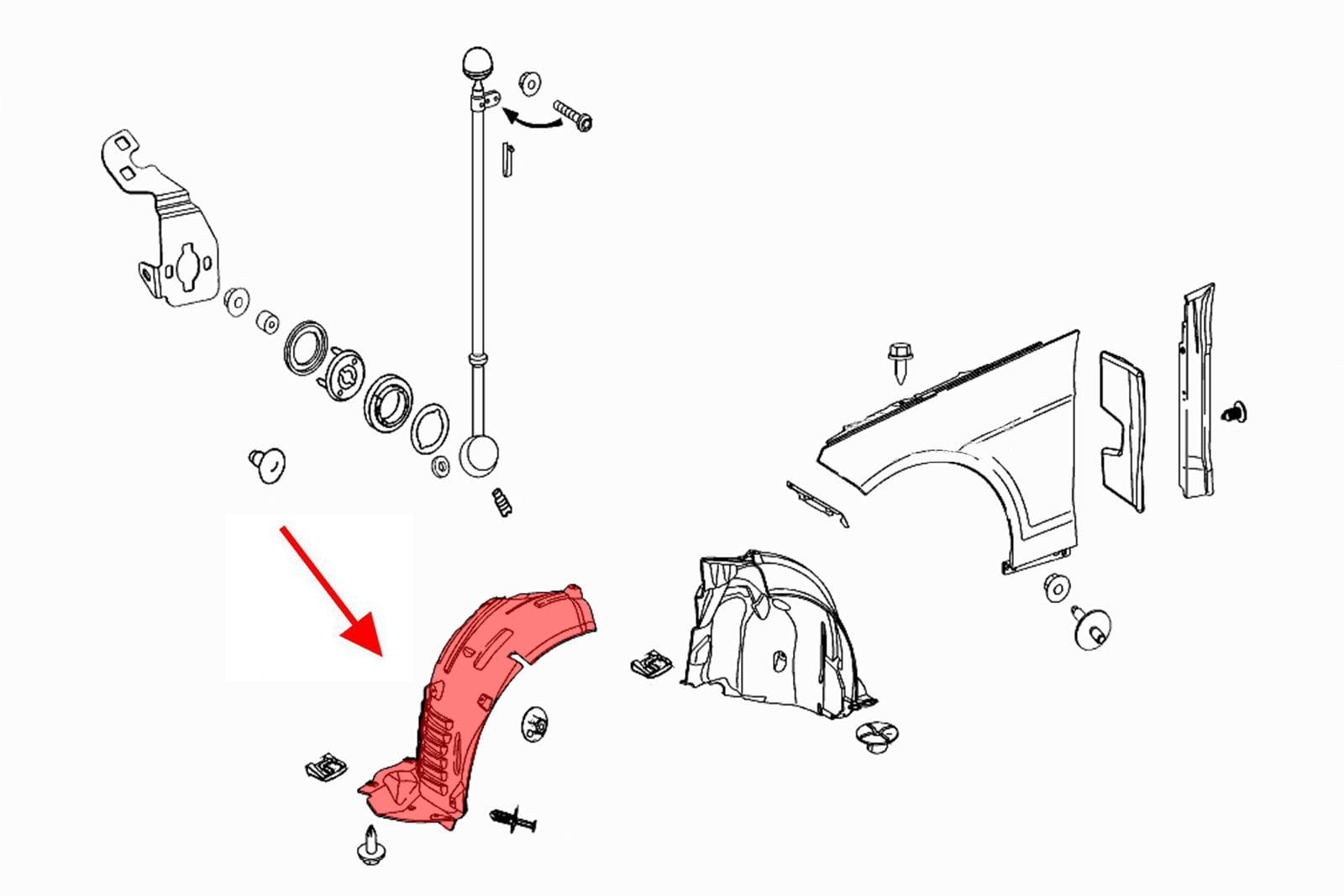 Wewnętrzne nadkole przednie lewe (część przednia), dla MERCEDES KLASA E (W212) 2009-2013 (wersja przed faceliftingiem). Nie pasuje do wersji AMG.