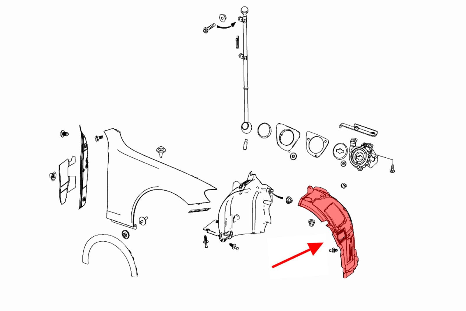 Wewnętrzne nadkole przednie prawe (część przednia), dla MERCEDES E-CLASS (W213) 2016-2020 (wersja przed liftingiem). Pasuje również do wersji z pakietem stylizacyjnym AMG (AMG Line).