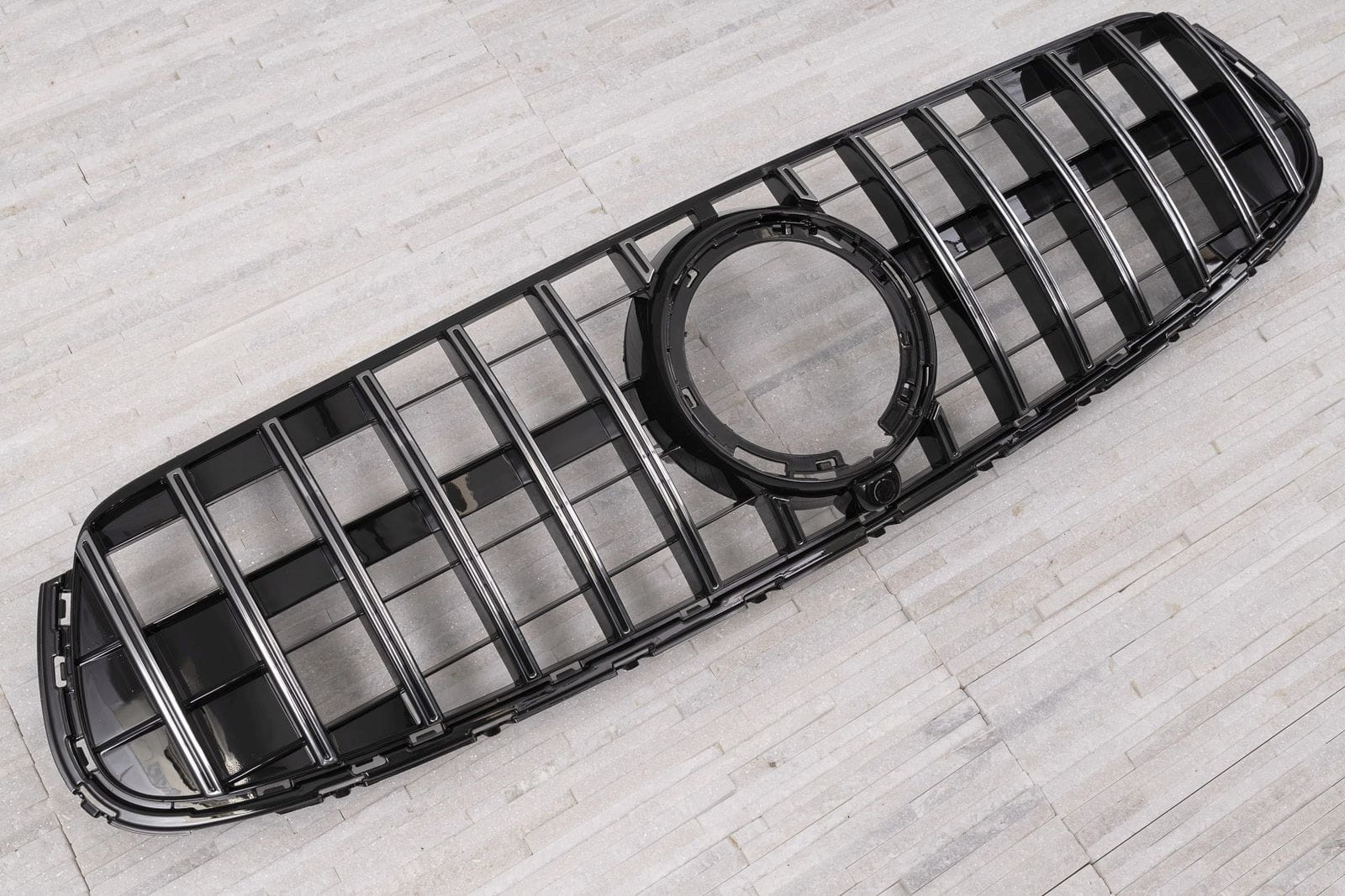 Grill przedni, model GT / PANAMERICANA zaprojektowany dla modelu MERCEDES GLC COUPE C253 2019+ PO LIFTINGU (WERSJA Z FABRYCZNĄ KAMERĄ). Pasuje do wersji z pakietem stylizacyjnym AMG (AMG Line).