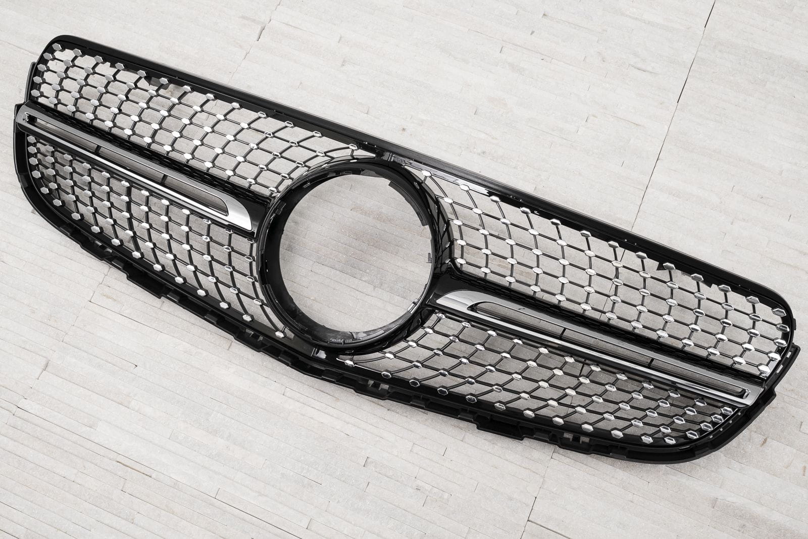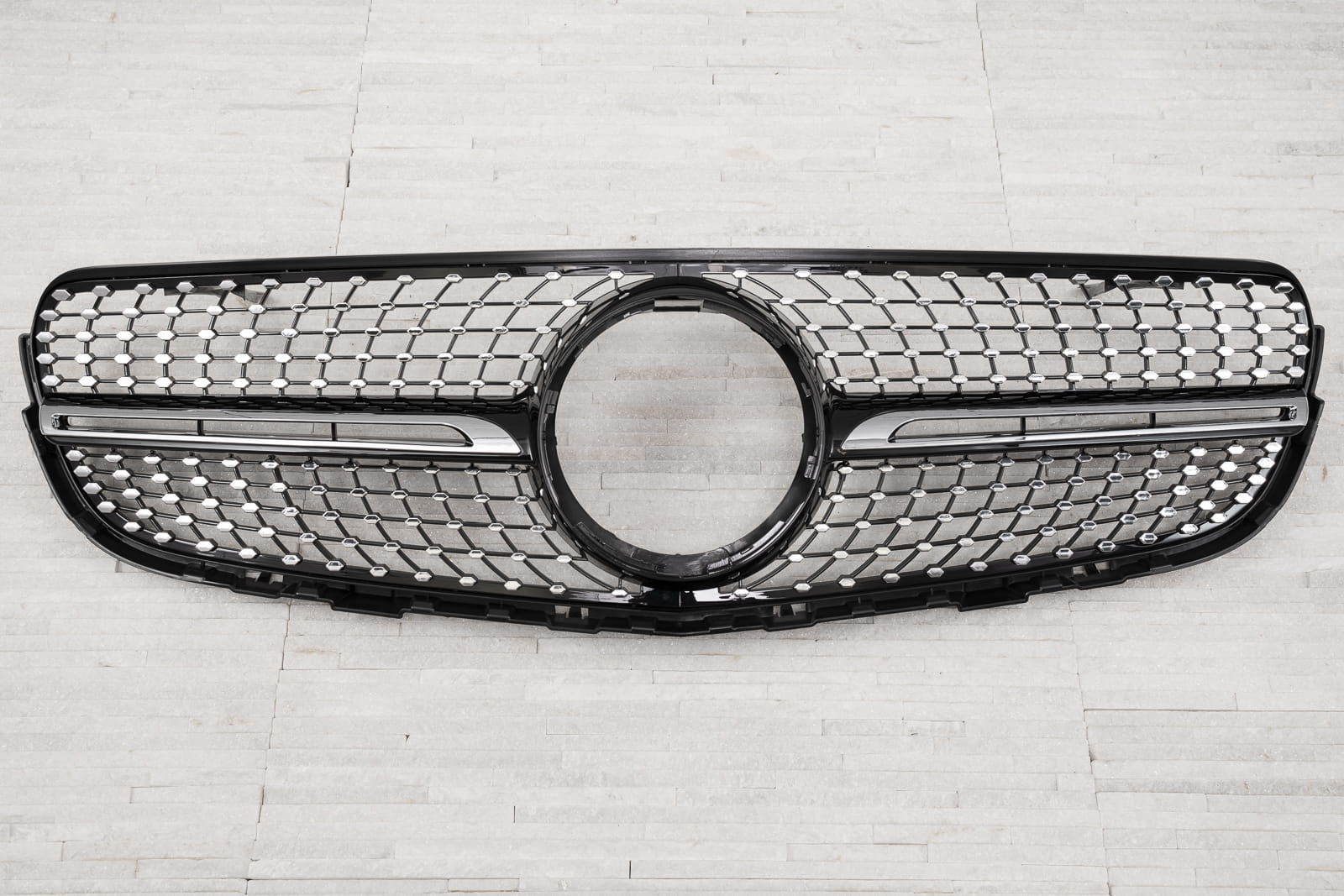 Dedykowany grill zaprojektowany został tak, aby idealnie współgrać z wyrafinowanym designem Mercedesa. Siatka grilla ozdobiona została pinami w srebrnym kolorze, które rozchodząc się promieniście po obu stronach elementu, nadają mu imponujący oryginalnością styl, typowy dla najbardziej luksusowych modeli. Wypełniają przestrzeń wokół znaku MERCEDES, otaczając go pełną elegancji ramą. Grill DIAMOND pozwala wykreować modną, nowoczesną stylizację samochodu, podkreślającą pełen klasy charakter modelu GLC.