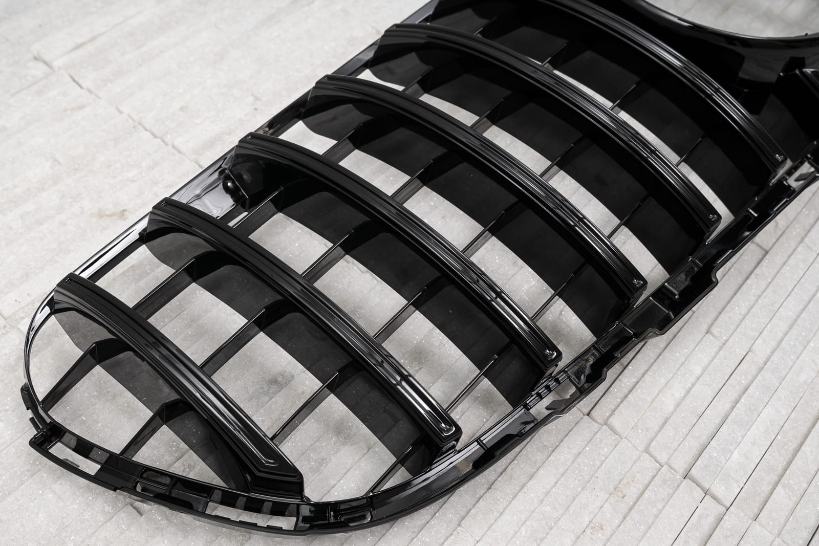 Dedykowany grill zaprojektowany został w stylu charakterystycznym dla samochodów z segmentu GT. Kratka grilla ozdobiona została szerokimi, chromowanymi poprzeczkami, które nieodzownie przywodzą na myśl budzące respekt, pełne mocy samochody z najwyższej półki. Element zachwyca sportowym charakterem, a połysk chromowanych elementów dodaje mu elegancji - dzięki czemu doskonale współgra z imponującym designem Mercedesa.