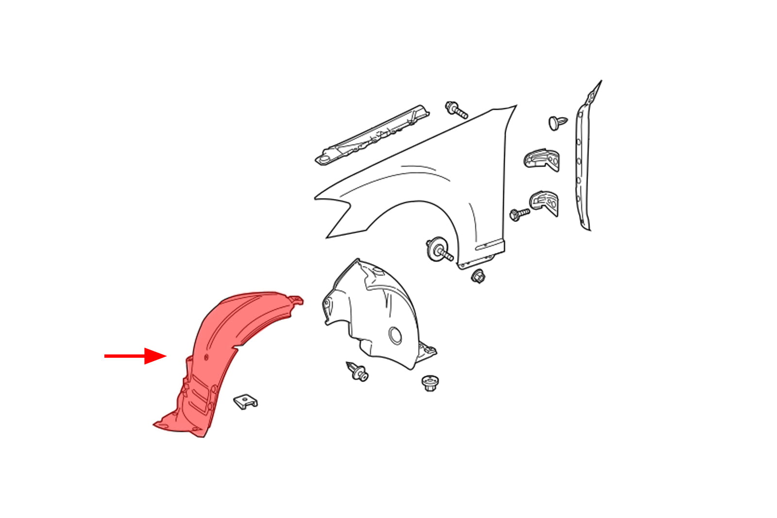 Wewnętrzne nadkole przednie prawe (część przednia), dla MERCEDES KLASY S (W221) 2005-2013. Pasuje również do wersji z pakietem stylizacyjnym AMG (AMG Line).