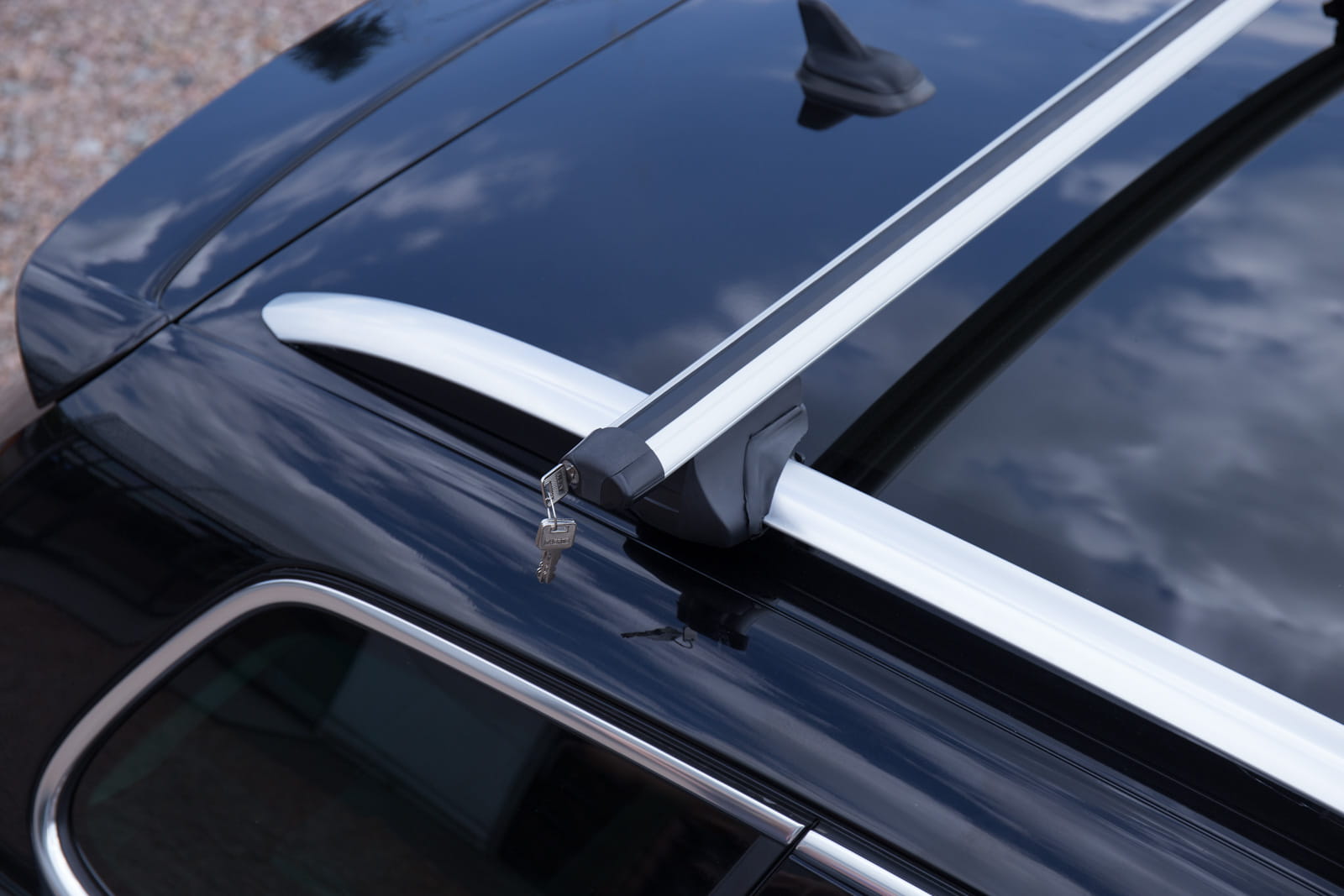W komplecie znajdują się: dwie belki aluminiowe i cztery zaciski i system zabezpieczenia z kluczykami.