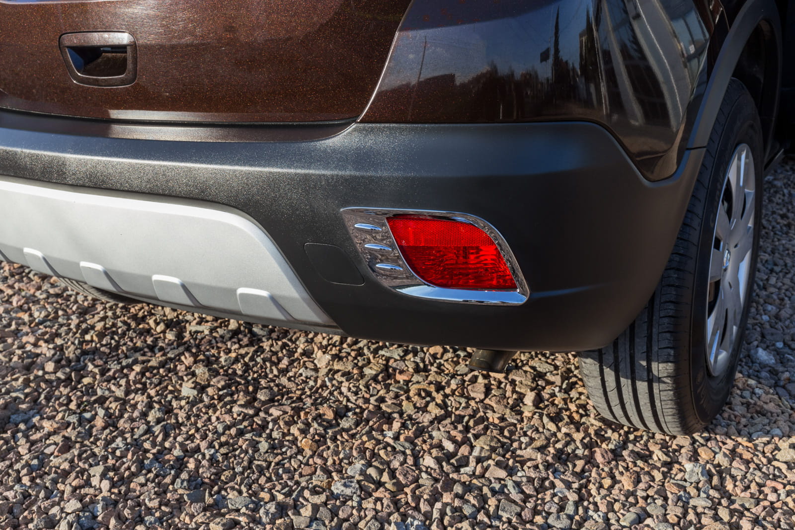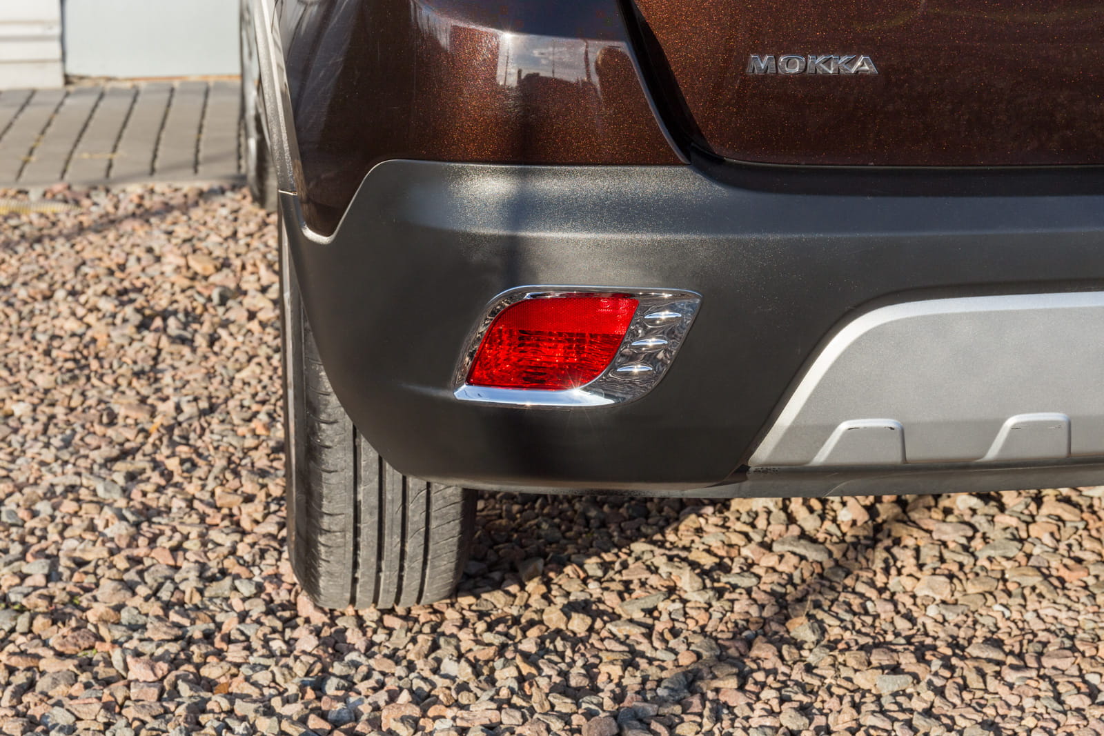 Stylizacyjne listwy podkreślają kształt ramki tylnych świateł przeciwmgielnych. Zestawienie lustrzanego połysku chromowanej powierzchni z dynamiczną, ostrą linią nakładek sprawia, że światła zyskują stylową ramę, doskonale pasującą do charaktrystycznego stylu modelu Mokka. Listwy znakomicie komponują się z innymi elementami wykończenia Opla, dzięki czemu ich zastosowanie pozwala uzyskać spójną, wyróżniającą samochód stylizację.