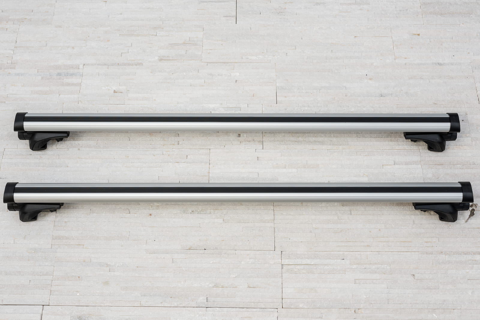 W komplecie znajdują się: dwie belki aluminiowe i cztery zaciski i system zabezpieczenia z kluczykami.