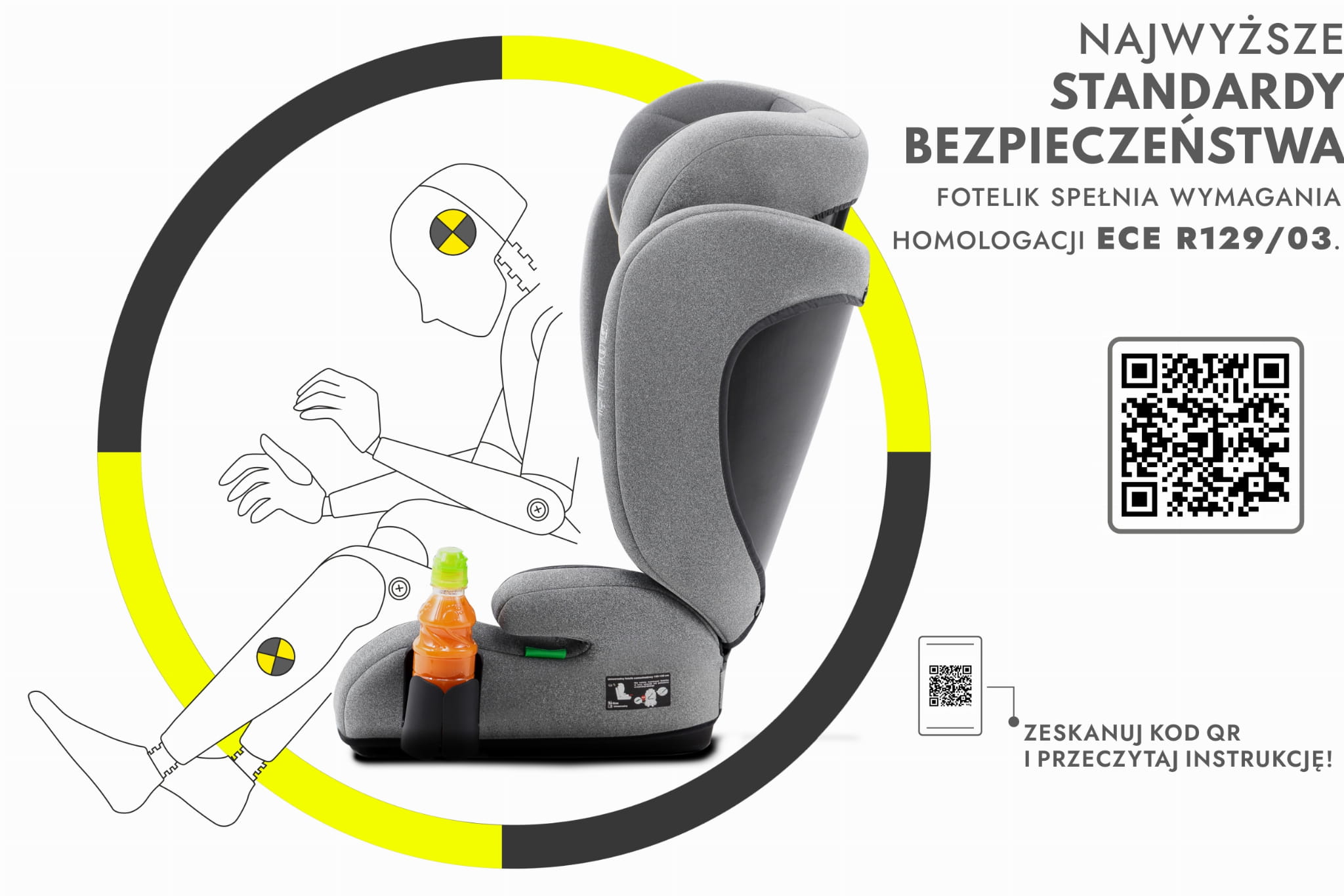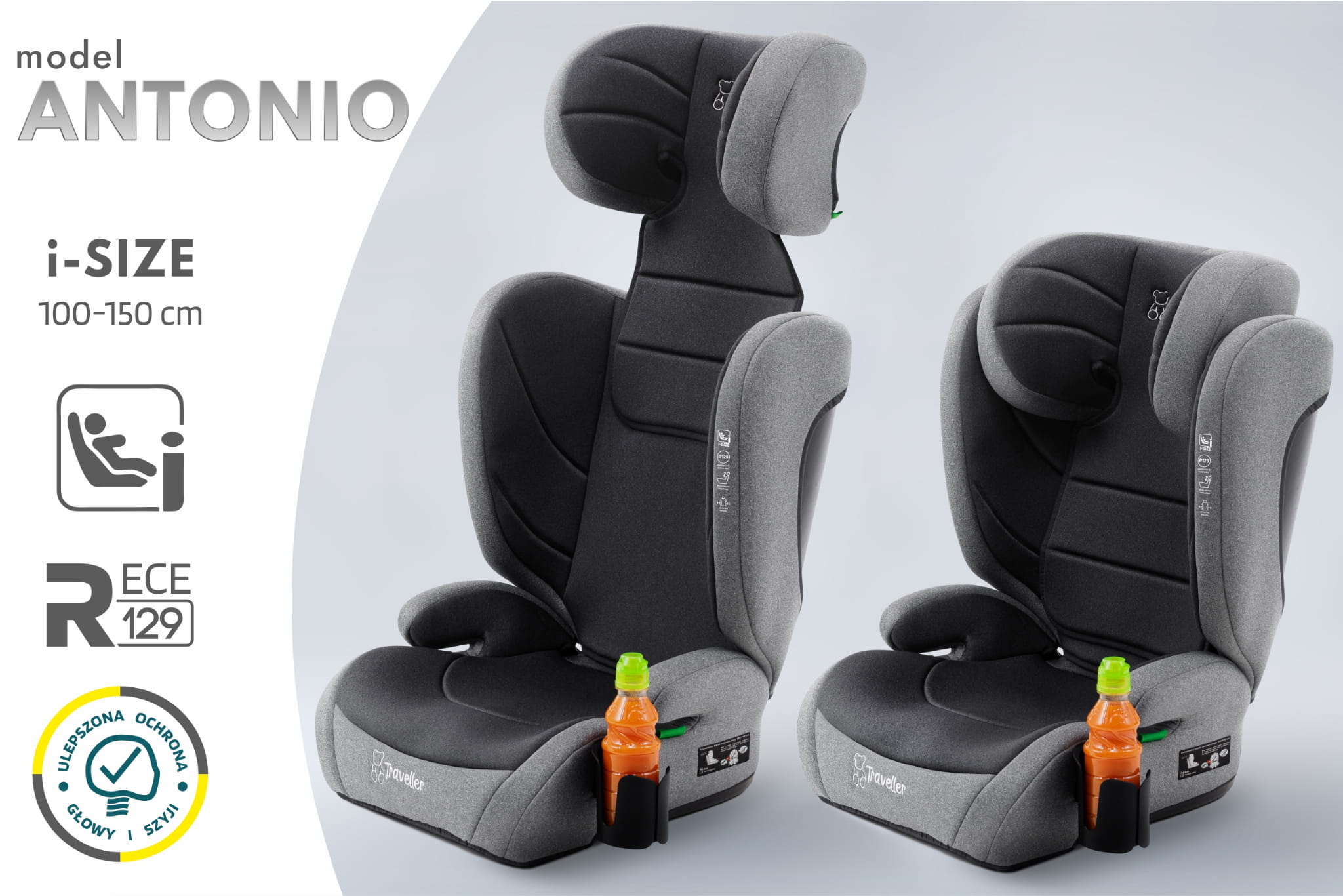 Certyfikowany fotelik samochodowy - model ANTONIO, zgodny z najnowszą normą bezpieczeństwa R129 i-Size, dla dzieci o wzroście 100-150 cm (3,5 - 12 lat).