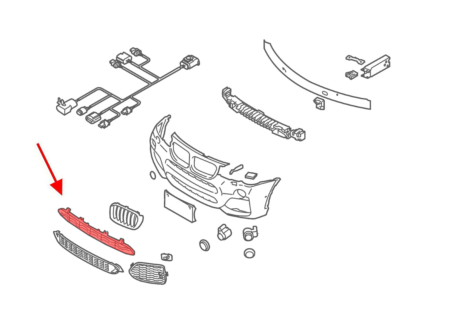 Kratka środkowa przedniego zderzaka, górna, dla BMW X4 (F26) 2014-2018. Pasuje tylko do wersji z pakietem aerodynamicznym M-Pakiet.