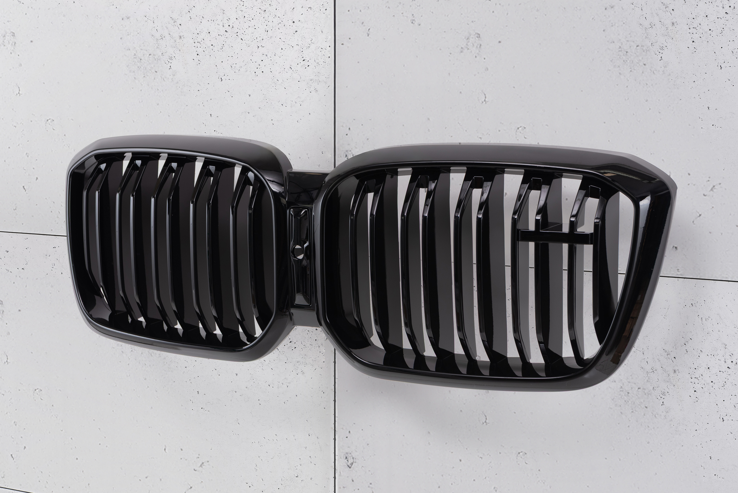 Grill czarny, "nerki" z podwójnymi żeberkami z otworem pod kamerę, wzór M-Pakiet, do BMW X4 (G02) 2021+ (po faceliftingu). Grill pasuje do wszystkich wersji wyposażenia indywidualnego, także do wersji M-PERFORMANCE.