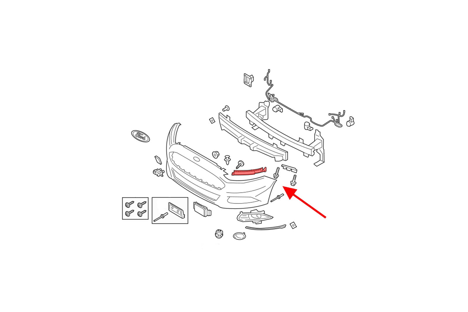 Element mocujący poszycie zderzaka przedniego, ślizg lewy, dla FORD MONDEO MK5 V 2014-2019 (wersja przed liftingiem).