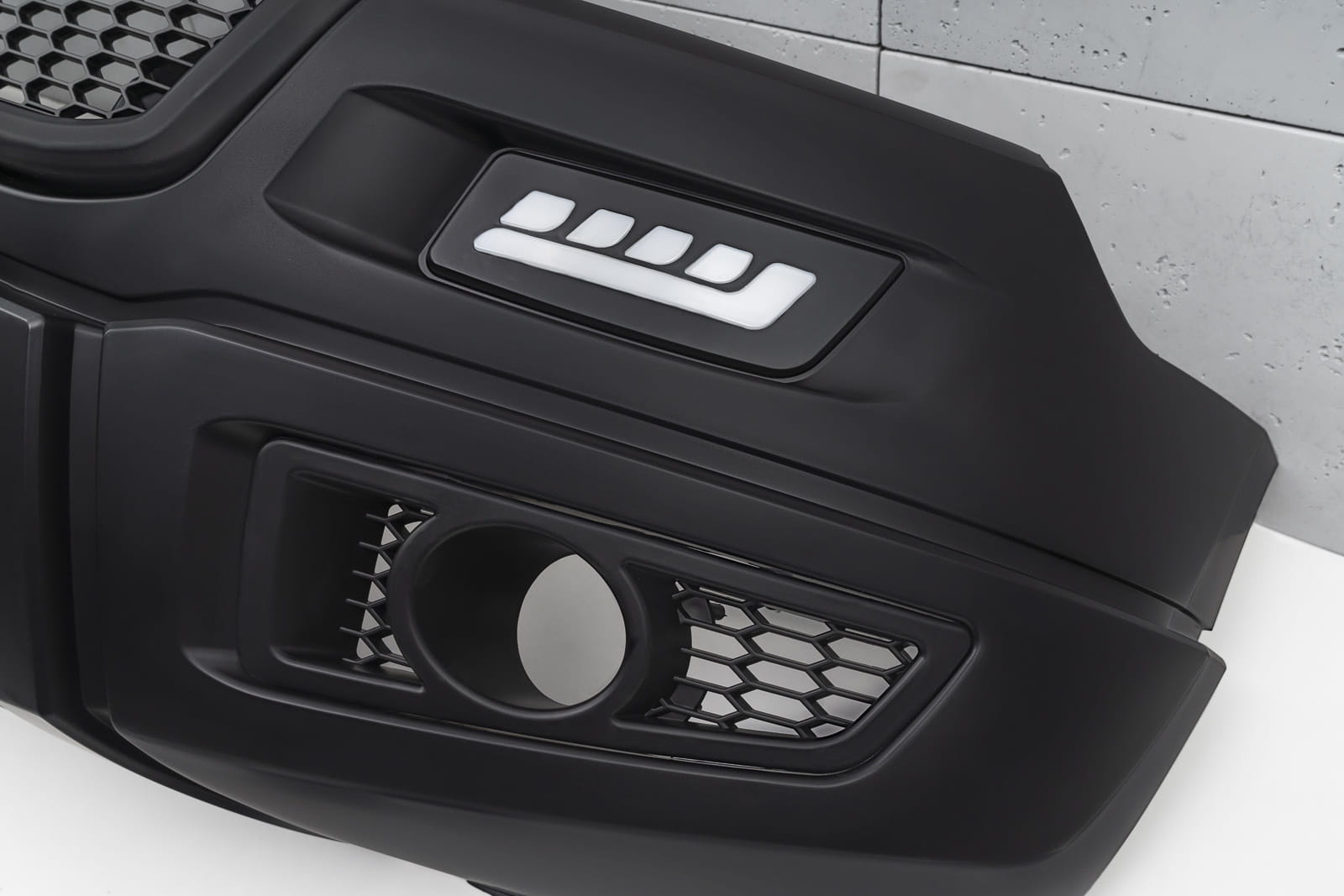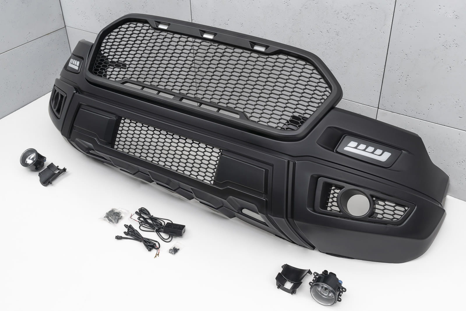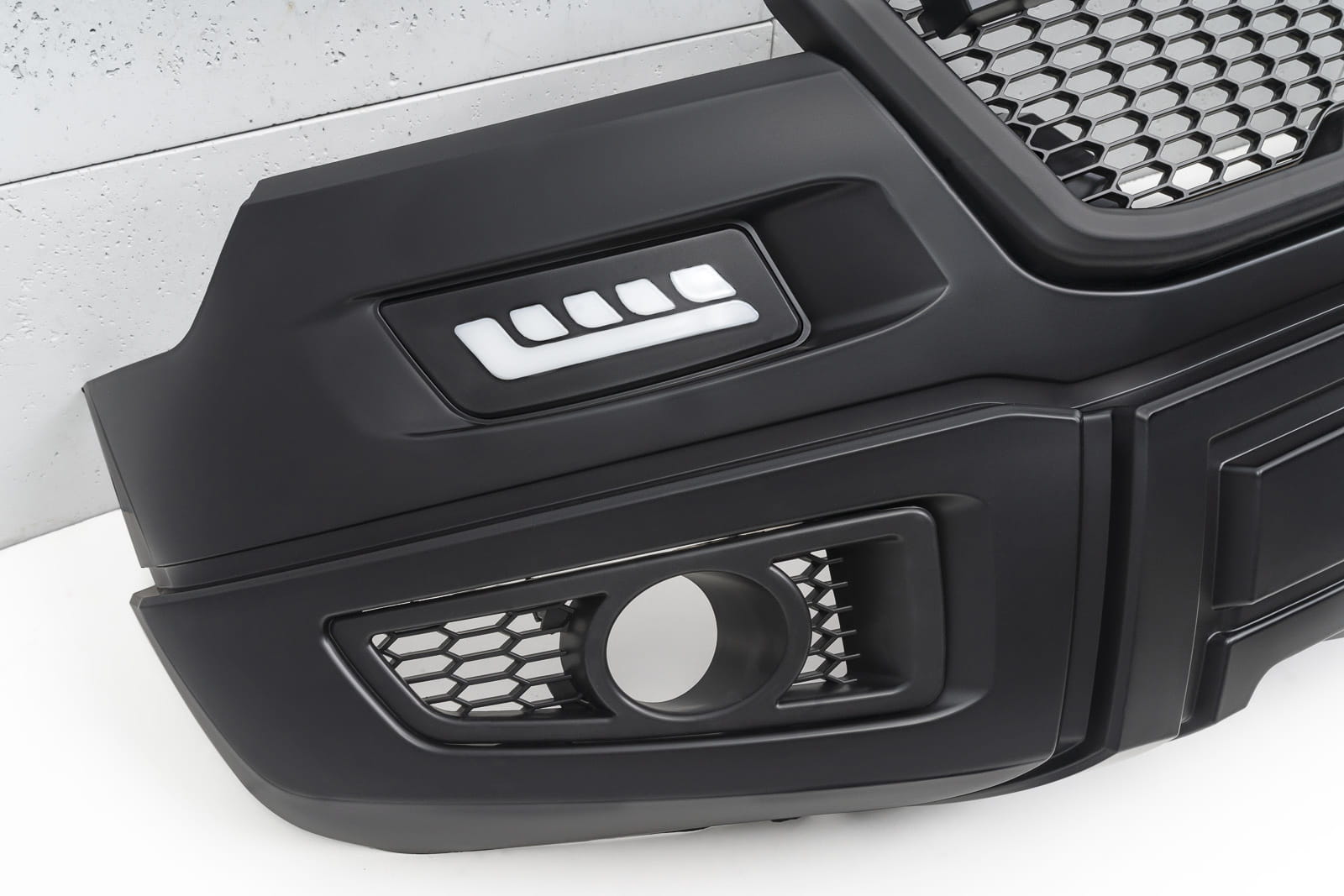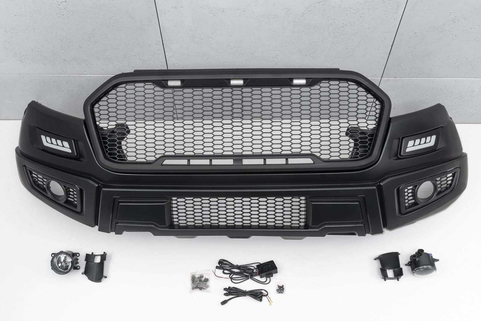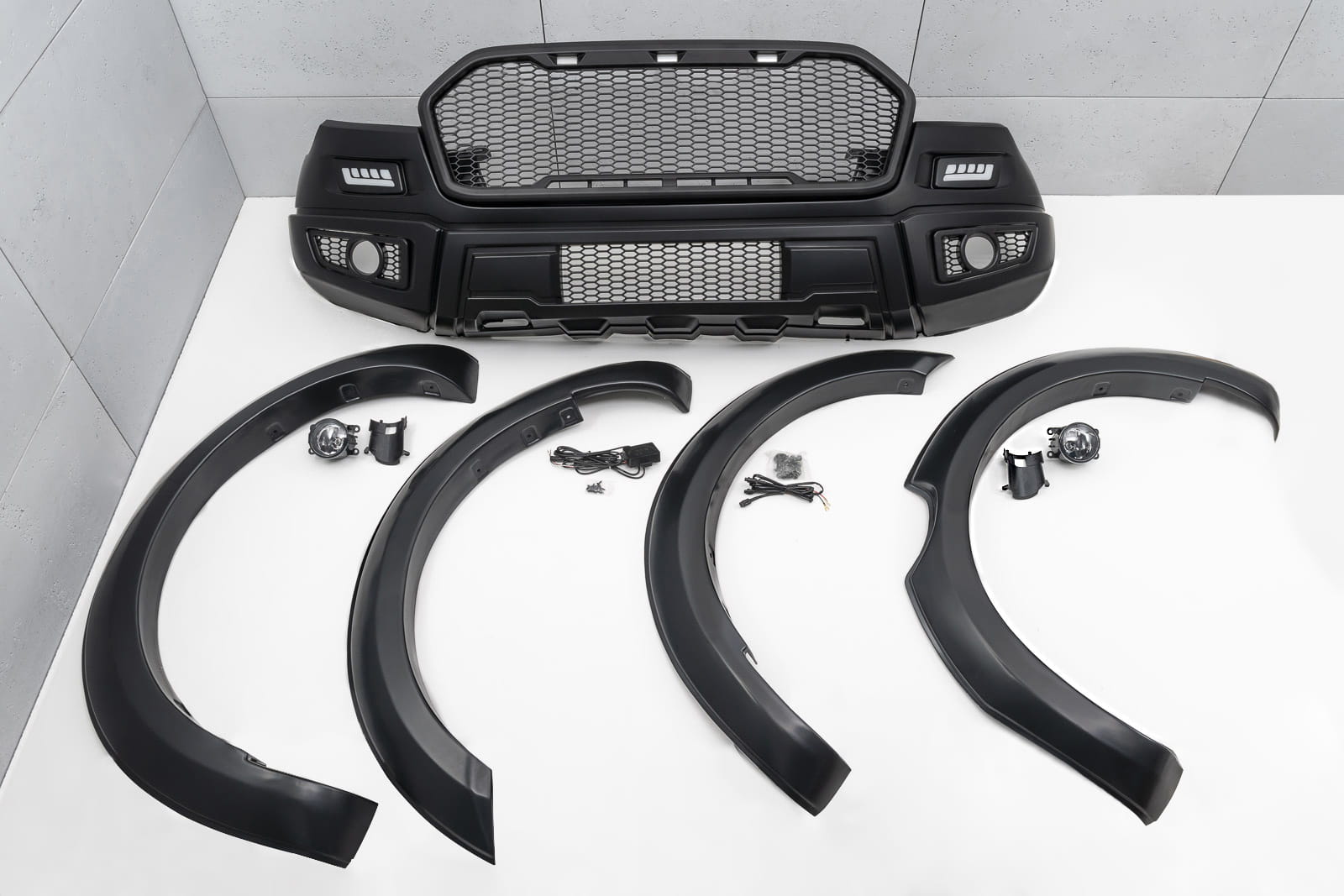 Body Kit - tuningowy pakiet stylizacyjny, dedykowany do modelu FORD RANGER T7 2016-2018. Pasuje tylko do wersji europejskiej. Nie pasuje do wersji USA. Kompletny pakiet stylizacyjny pozwala przemienić "cywilnego" Forda Ranger w rasową wersję RAPTOR (T8). Dzięki niemu samochód będzie wyglądać dokładnie tak jak wersja Raptor. Zyska również nietuzinkowy, agresywny styl, wyróżniając się w oryginalny sposób. Pakiet stylizacyjny zawiera wszystkie elementy jakie są potrzebne, żeby stuningować Twój samochód: