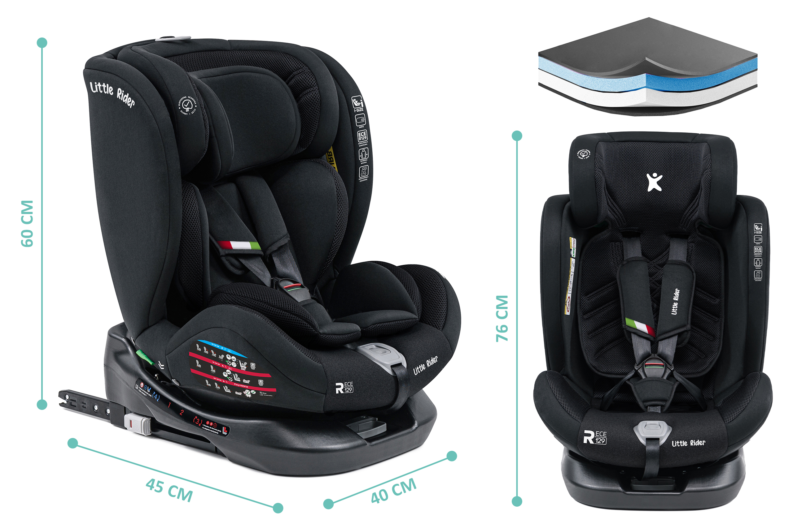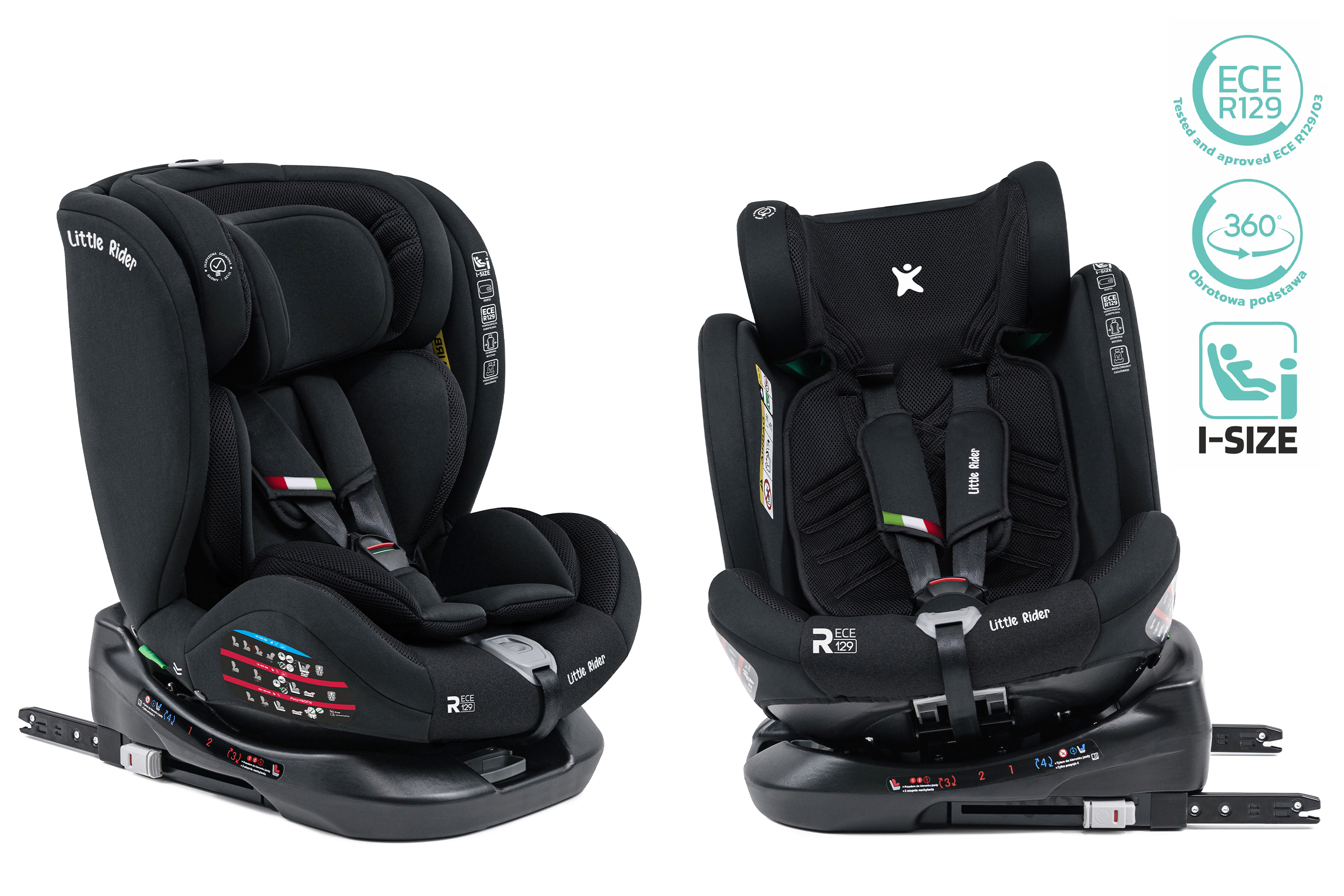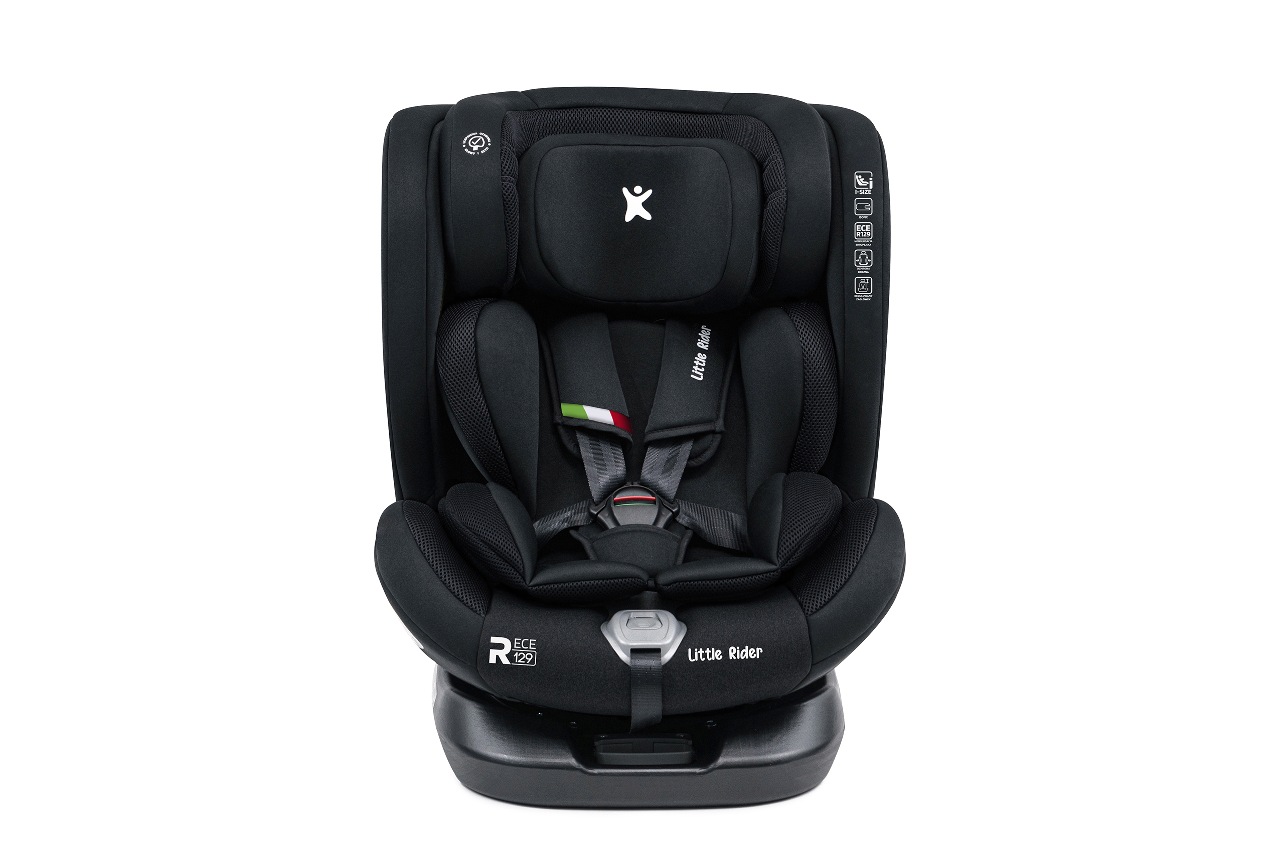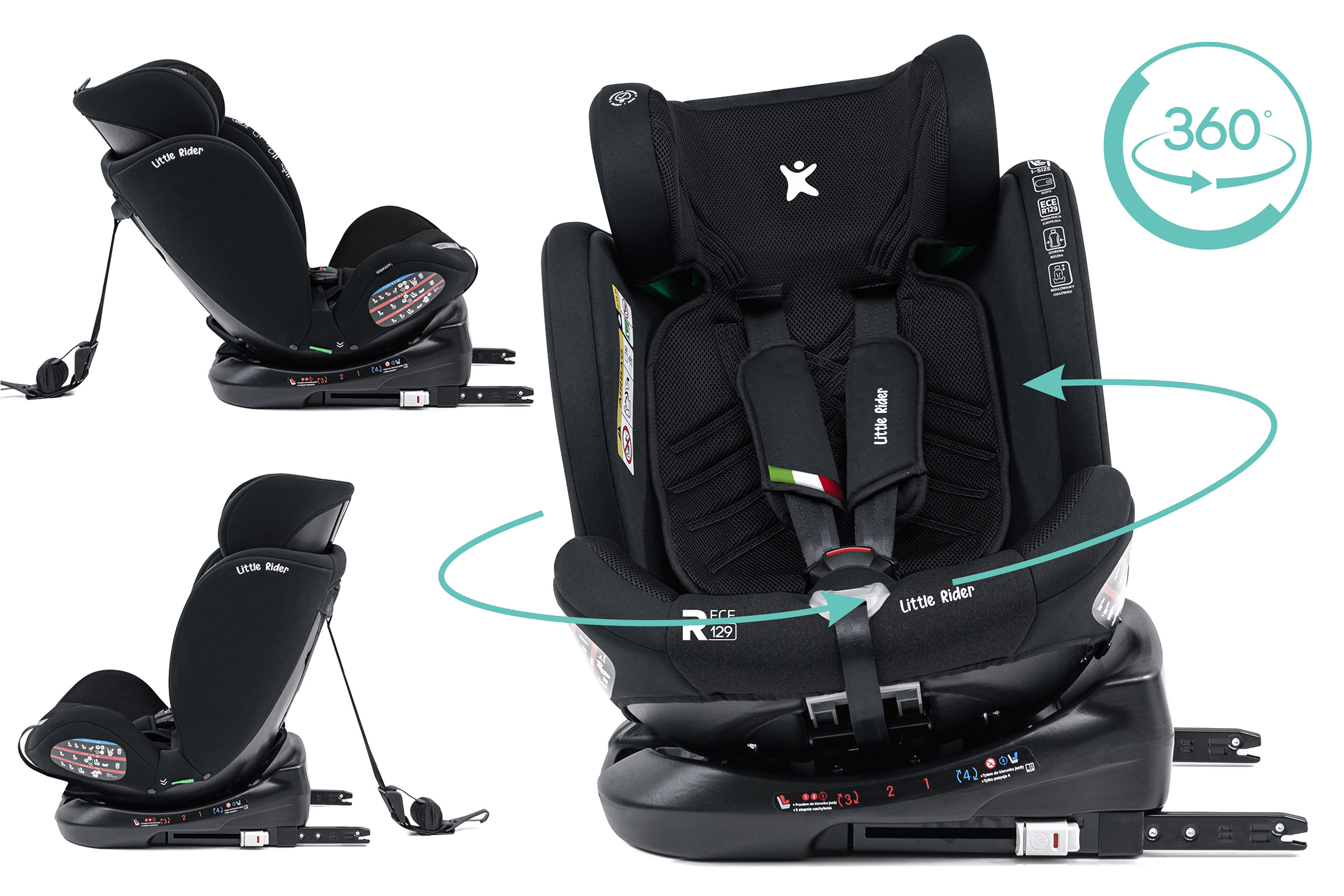 Certyfikowany fotelik samochodowy marki LITTLE RIDER, zgodny z najnowszą homologacją i-Size dla dziecka od 40 do 150 cm wzrostu. Fotelik wyposażony jest w obrotowe siedzisko 360° oraz w mocowanie ISOFIX + Top Tether.