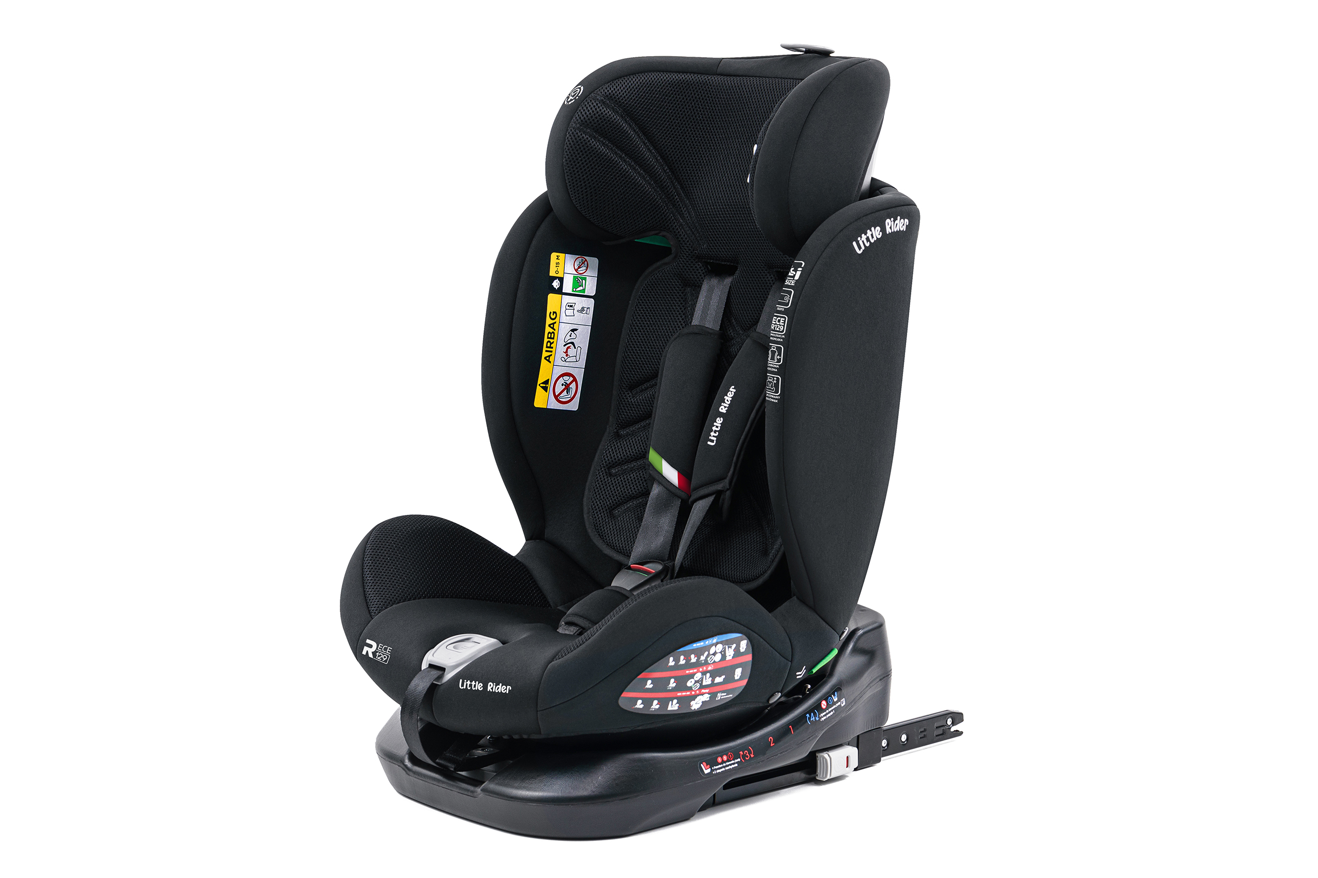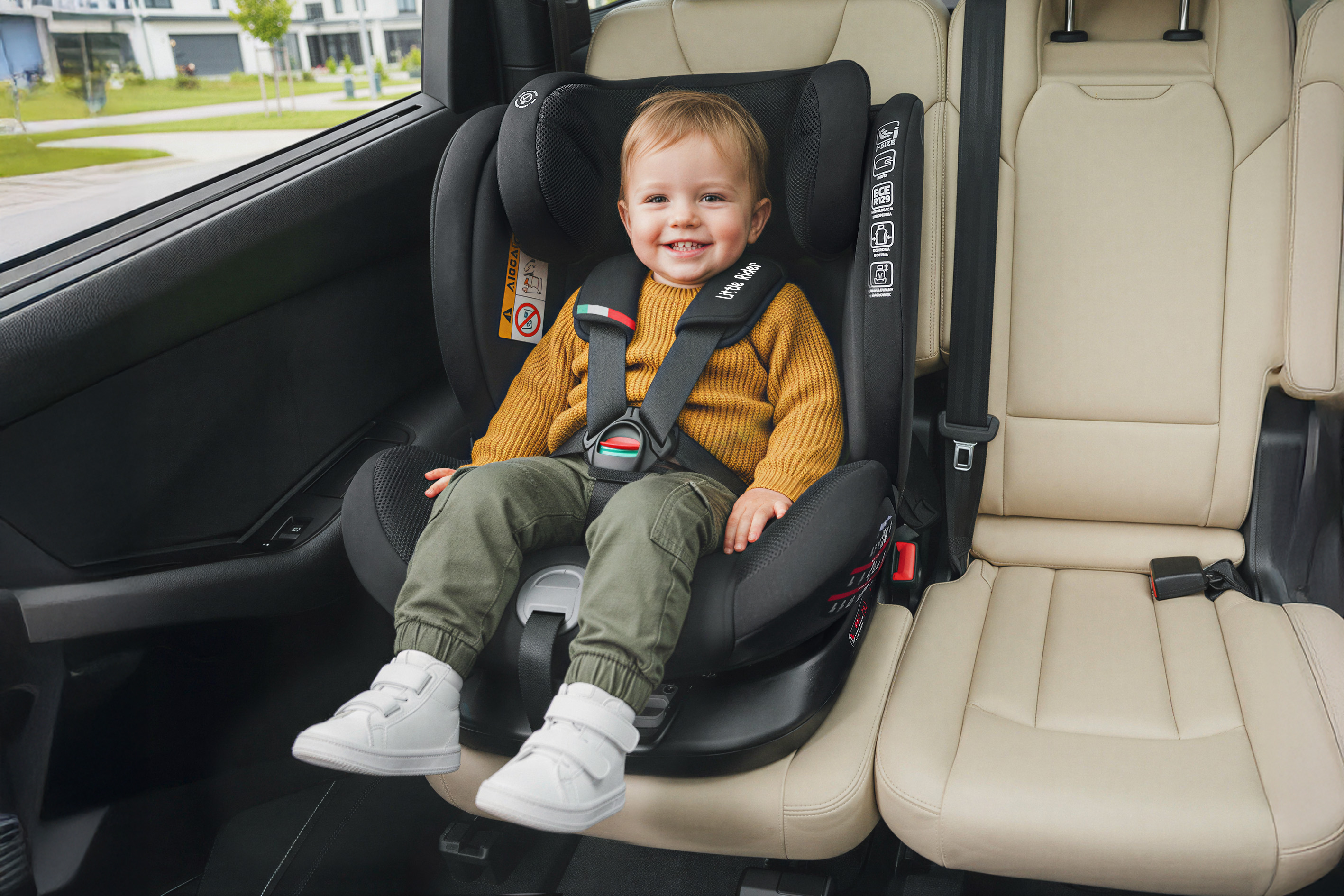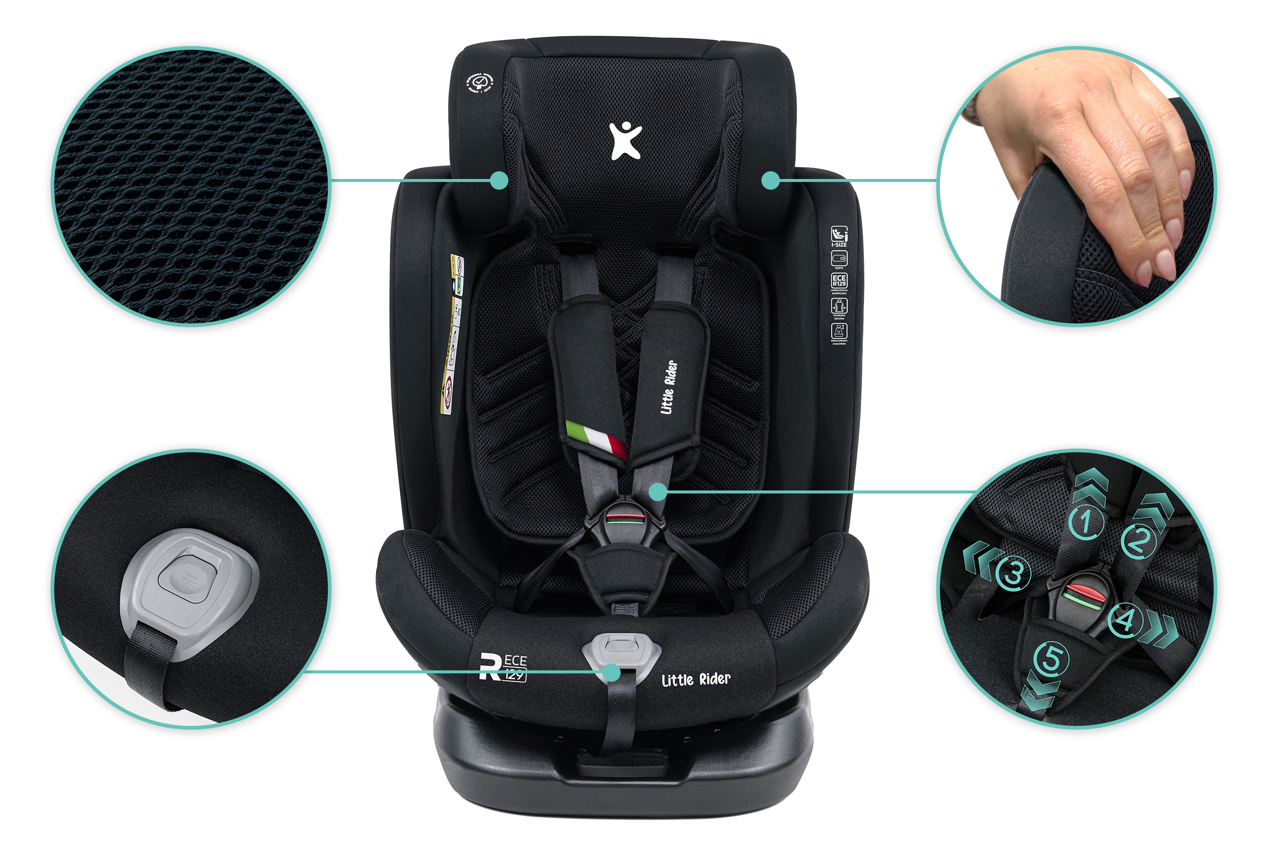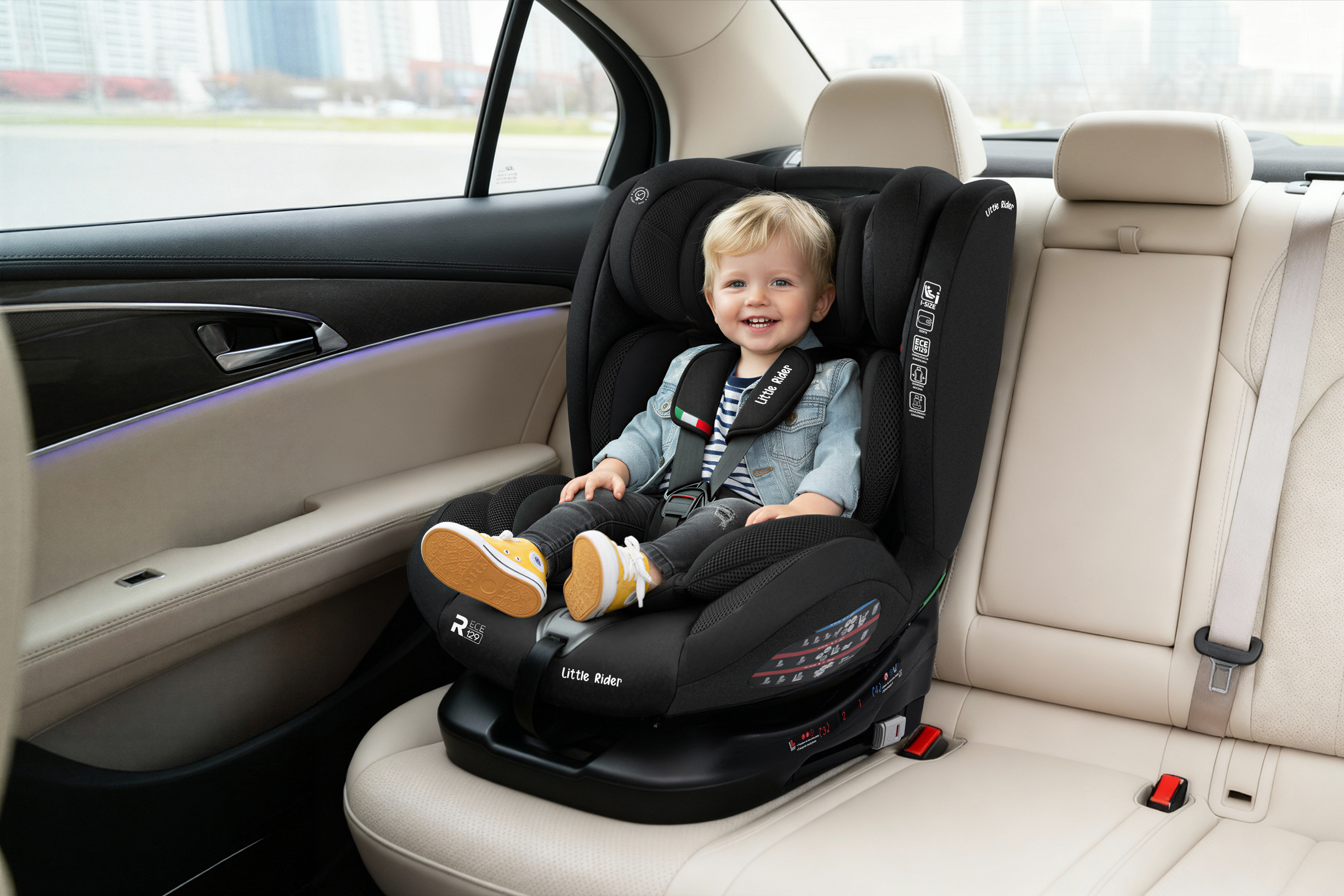 Certyfikowany fotelik samochodowy marki LITTLE RIDER, zgodny z najnowszą homologacją i-Size dla dziecka od 40 do 150 cm wzrostu. Fotelik wyposażony jest w obrotowe siedzisko 360° oraz w mocowanie ISOFIX + Top Tether.