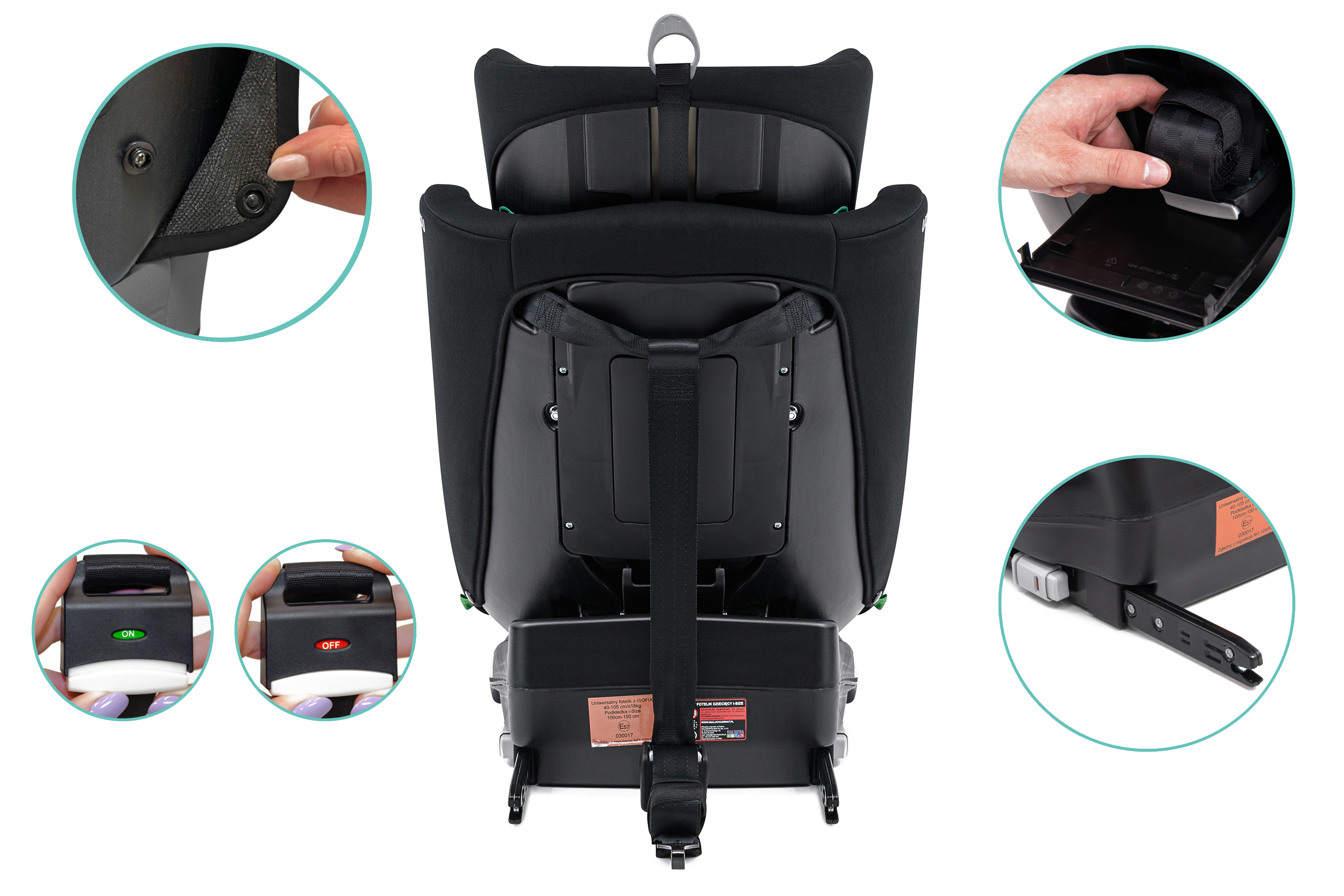Certyfikowany fotelik samochodowy przeznaczony jest dla dzieci o wzroście 40-150 cm. Może być użytkowany przez dziecko do osiągnięcia 150 cm wzrostu, czyli do osiągnięcia około 12 roku życia. Fotelik może być montowany przodem i tyłem do kierunku jazdy, w zależności do swoich potrzeb oraz bezpieczeństwa dziecka. Fotelik posiada mocowanie ISOFIX + Top Tether oraz 4-stopniowy system regulacji wysokości zagłówka. Dzięki zastosowaniu specjalnej, demontowanej wkładki odpowiadającej za właściwą pozycję dzieci, które jeszcze nie siedzą samodzielnie, fotelik "rośnie" razem z naszym dzieckiem od urodzenia do ukończenia 12 roku życia. Fotelik wyposażony został w obrotowe siedzisko 360°.