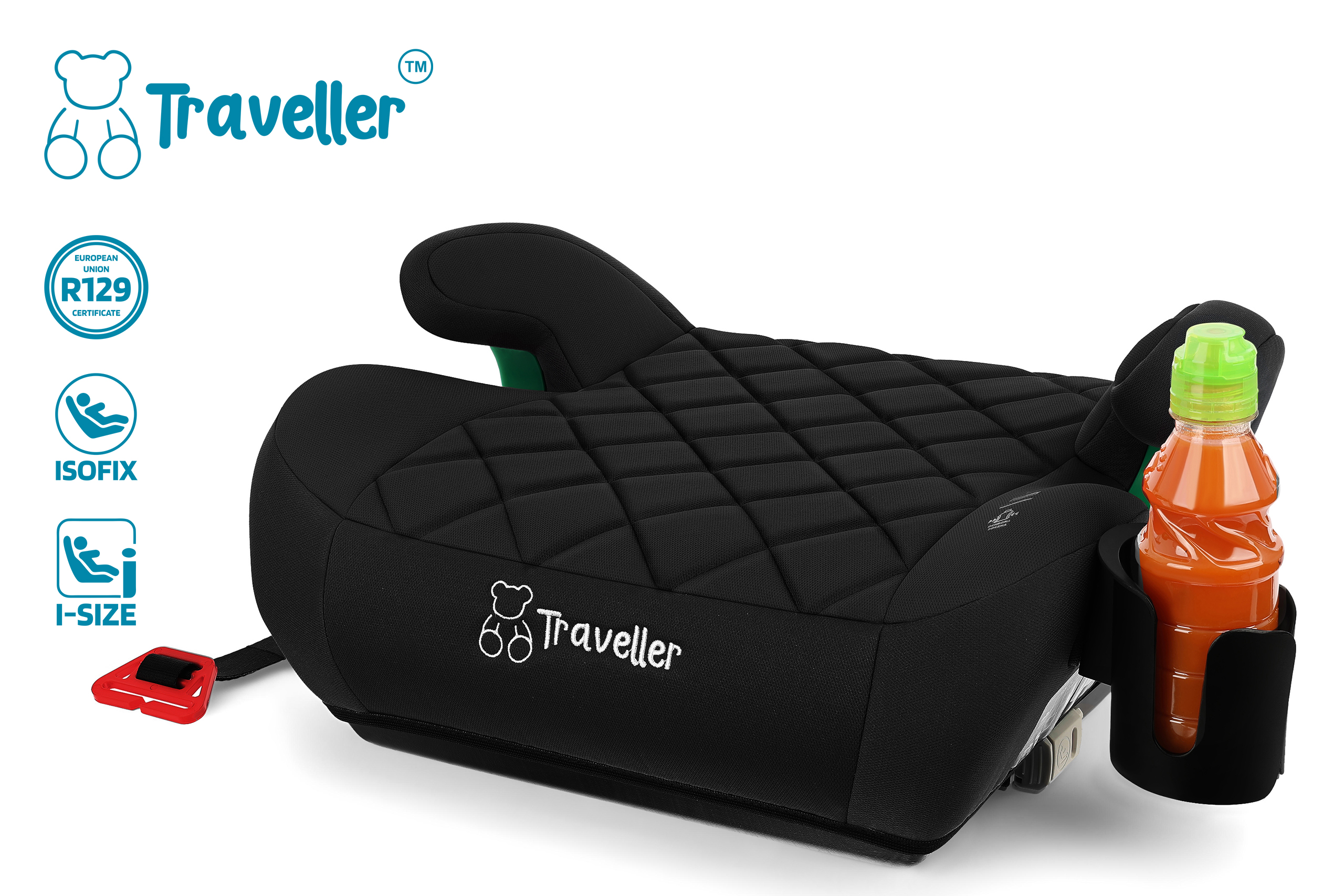 Certyfikowany fotelik samochodowy marki TRAVELLER, przeznaczony jest dla dzieci o wzroście 125 cm-150 cm. Fotelik wyposażony jest w mocowanie ISOFIX. Siedzisko spełnia wymagania najnowszej homologacji ECE R129/03.