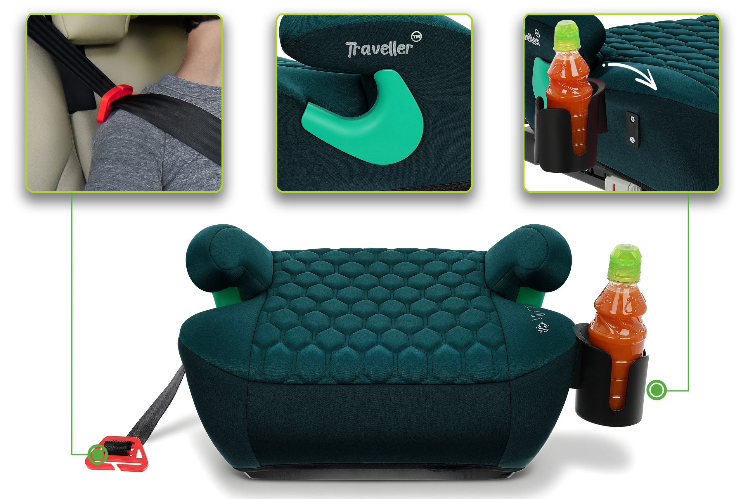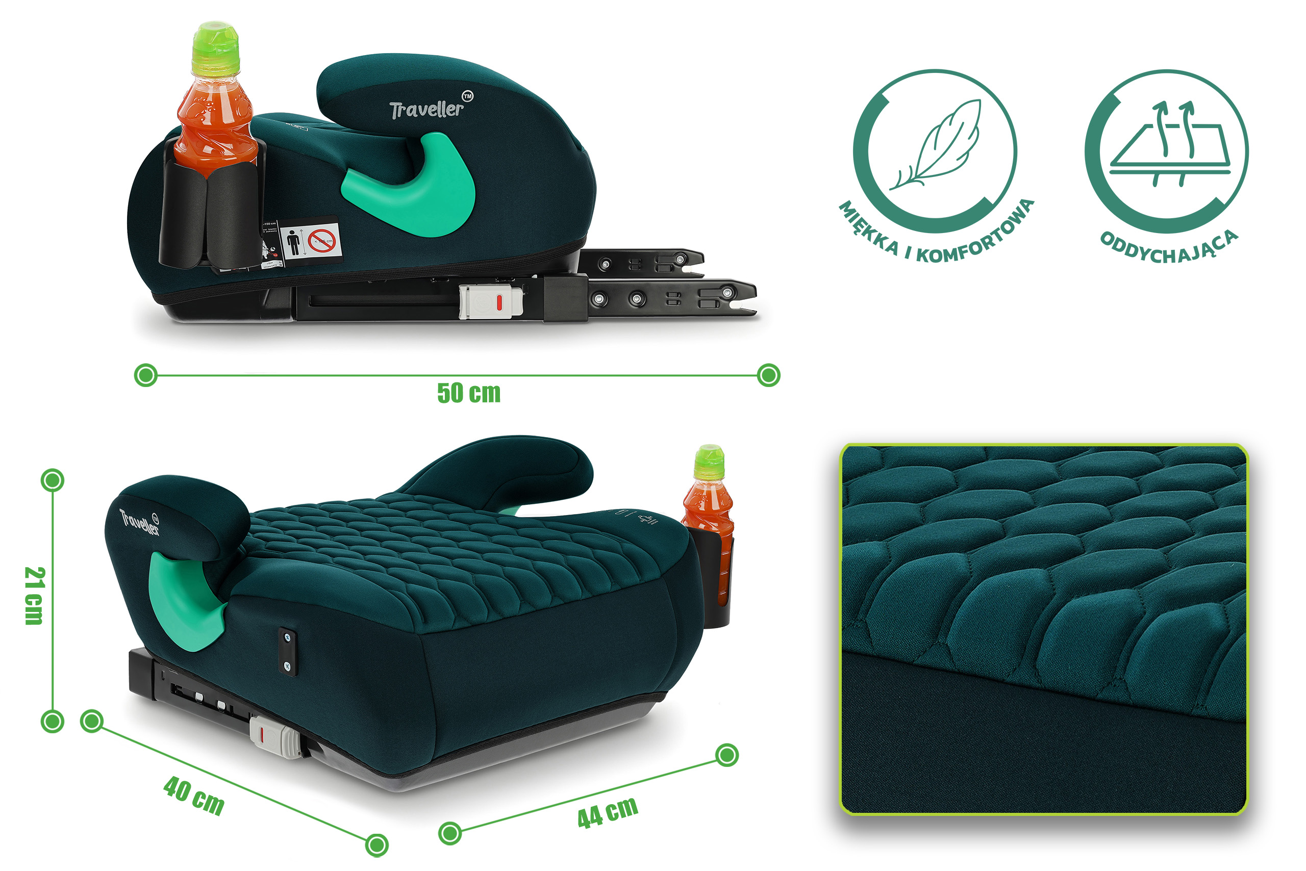 Certyfikowany fotelik samochodowy marki TRAVELLER, przeznaczony jest dla dzieci o wzroście 125 cm-150 cm. Fotelik wyposażony jest w mocowanie ISOFIX. Siedzisko spełnia wymagania najnowszej homologacji ECE R129/03.