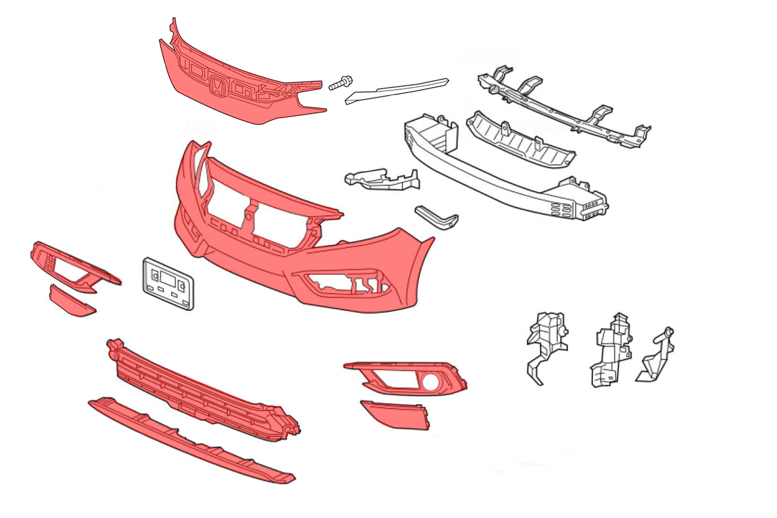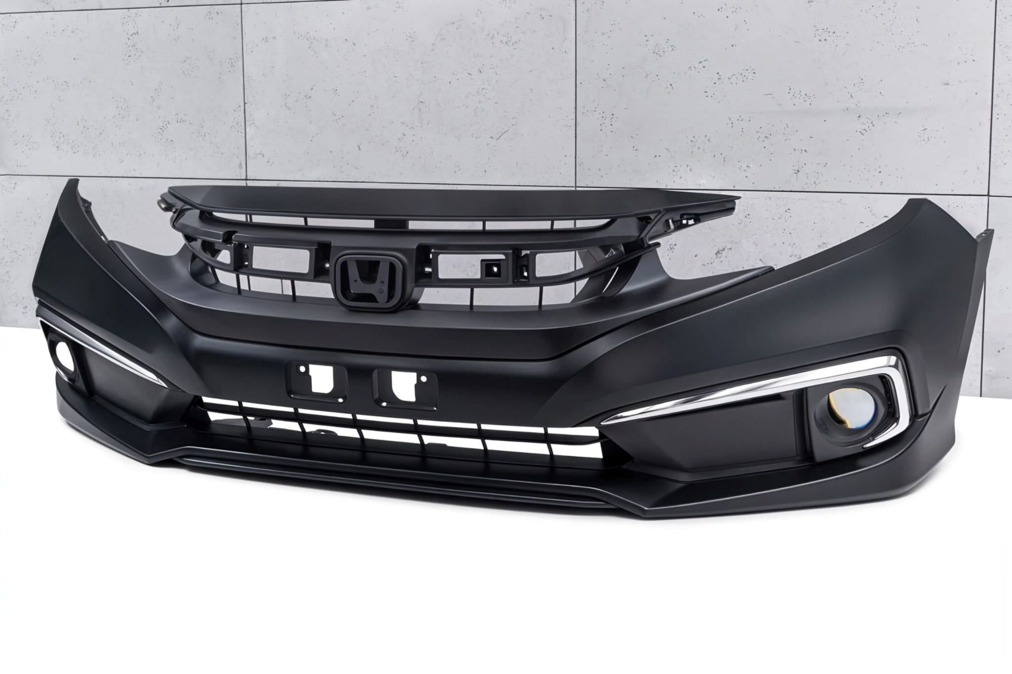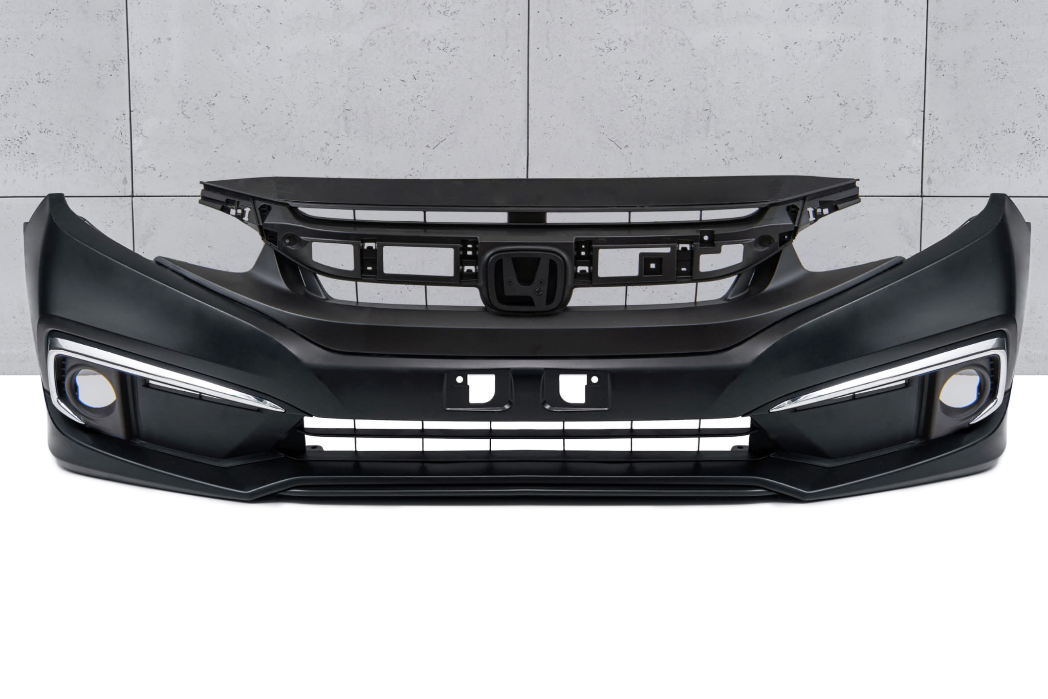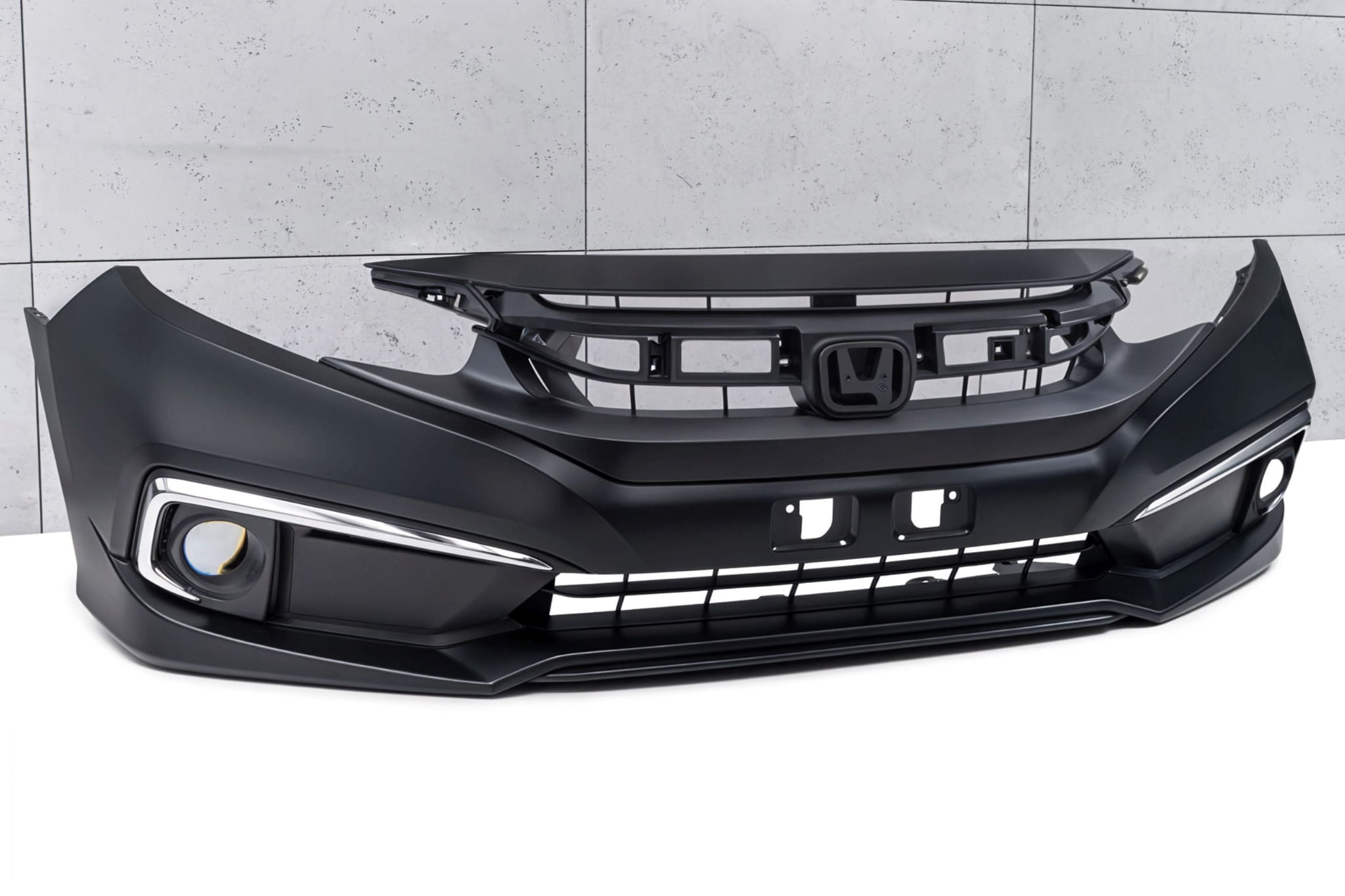 Kompletny zderzak przedni z grillem, dedykowany dla HONDA CIVIC X 2019 -2021 (wersja po faceliftingu). Wersja bez otworów pod czujniki parkowania PDC i otworów pod spryskiwacze.