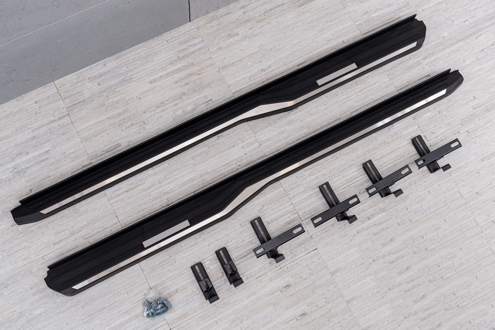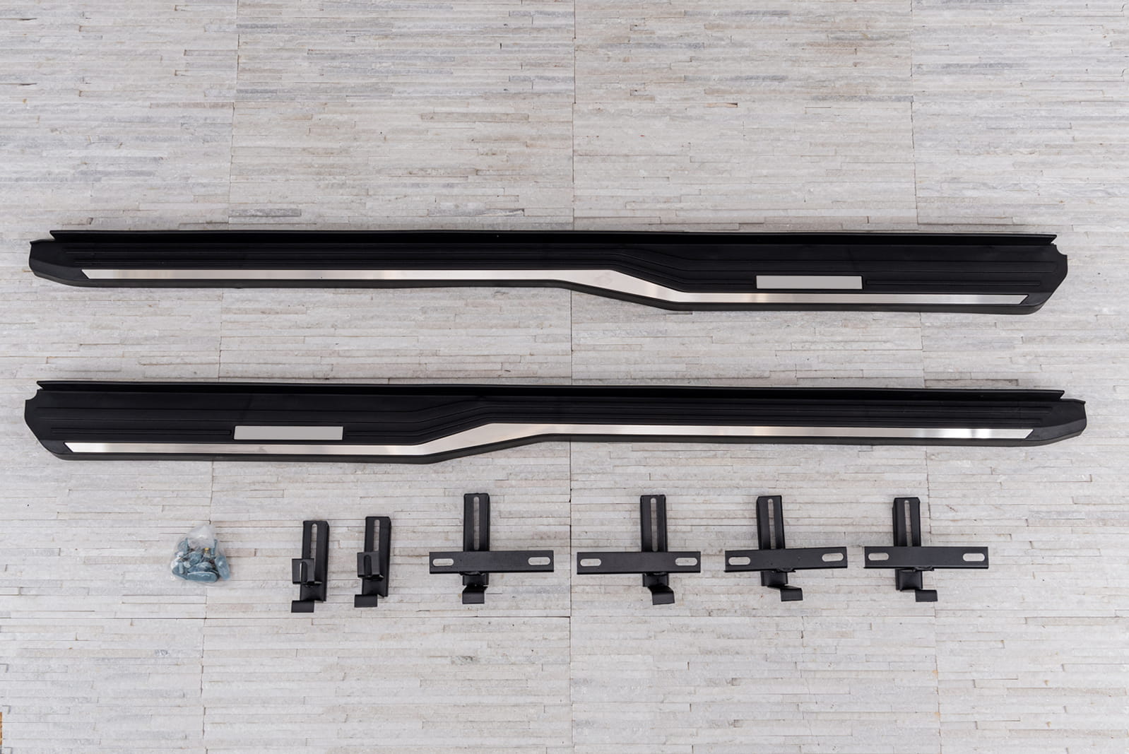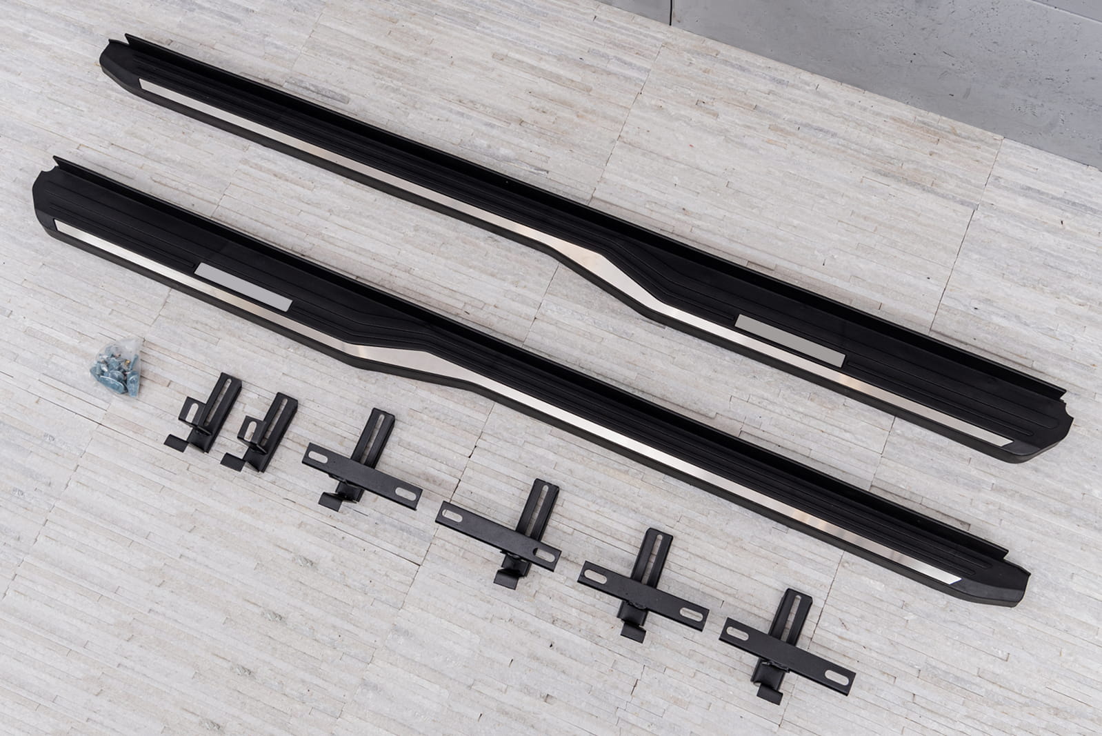 W zestawie komplet stopni bocznych (prawy i lewy), elementy montażowe oraz instrukcja. Progi montowane są na fabrycznych punktach montażowych. Montaż stopni nie wymaga wiercenia dodatkowych otworów! Zalecamy profesjonalny montaż w warsztacie (z doświadczenia wiemy że najlepiej skorzystać z usług zakładu lakierniczego lub blacharskiego ponieważ to te zakłady zajmują się najczęściej montażem listew, dokładek oraz stopni, więc montaż dla tych zakładów jest czynnością intuicyjną).