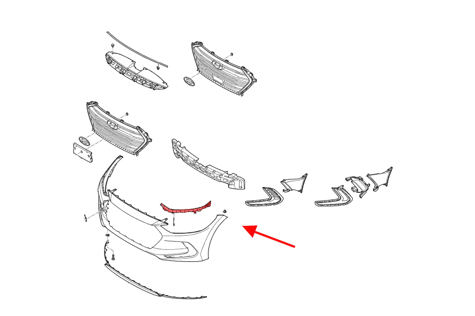 Element mocujący poszycie przedniego zderzaka, ślizg przedni lewy, dla HYUNDAI ELANTRA VI (AD) 2015-2018 (wersja przed faceliftingiem).