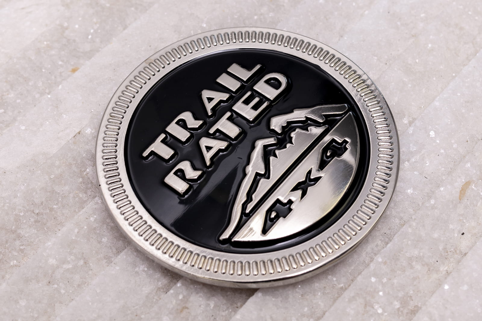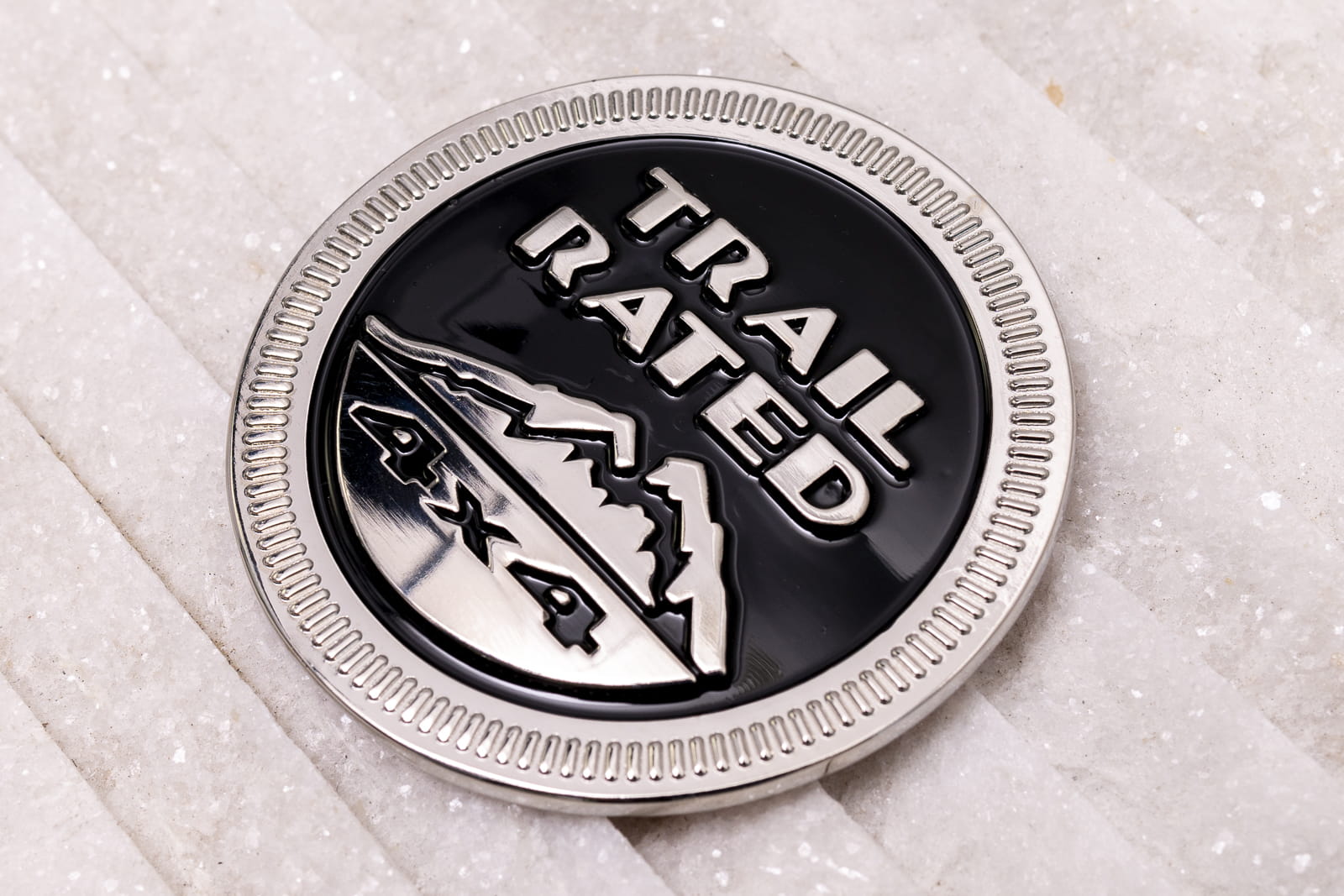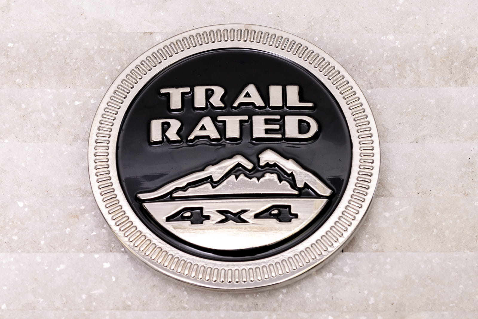 Dekoracyjny metalowy emblemat Jeep TRAIL RATED. Dedykowany do JEEP CHEROKEE III (KJ) / IV (KK) / V (KL).