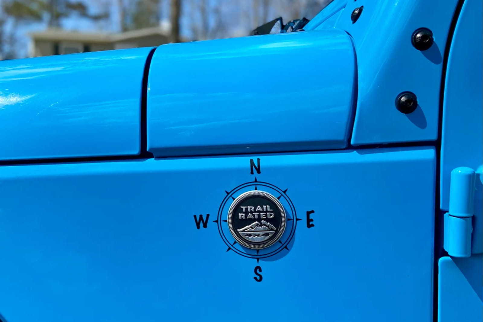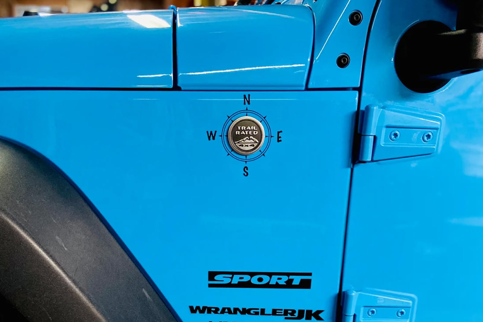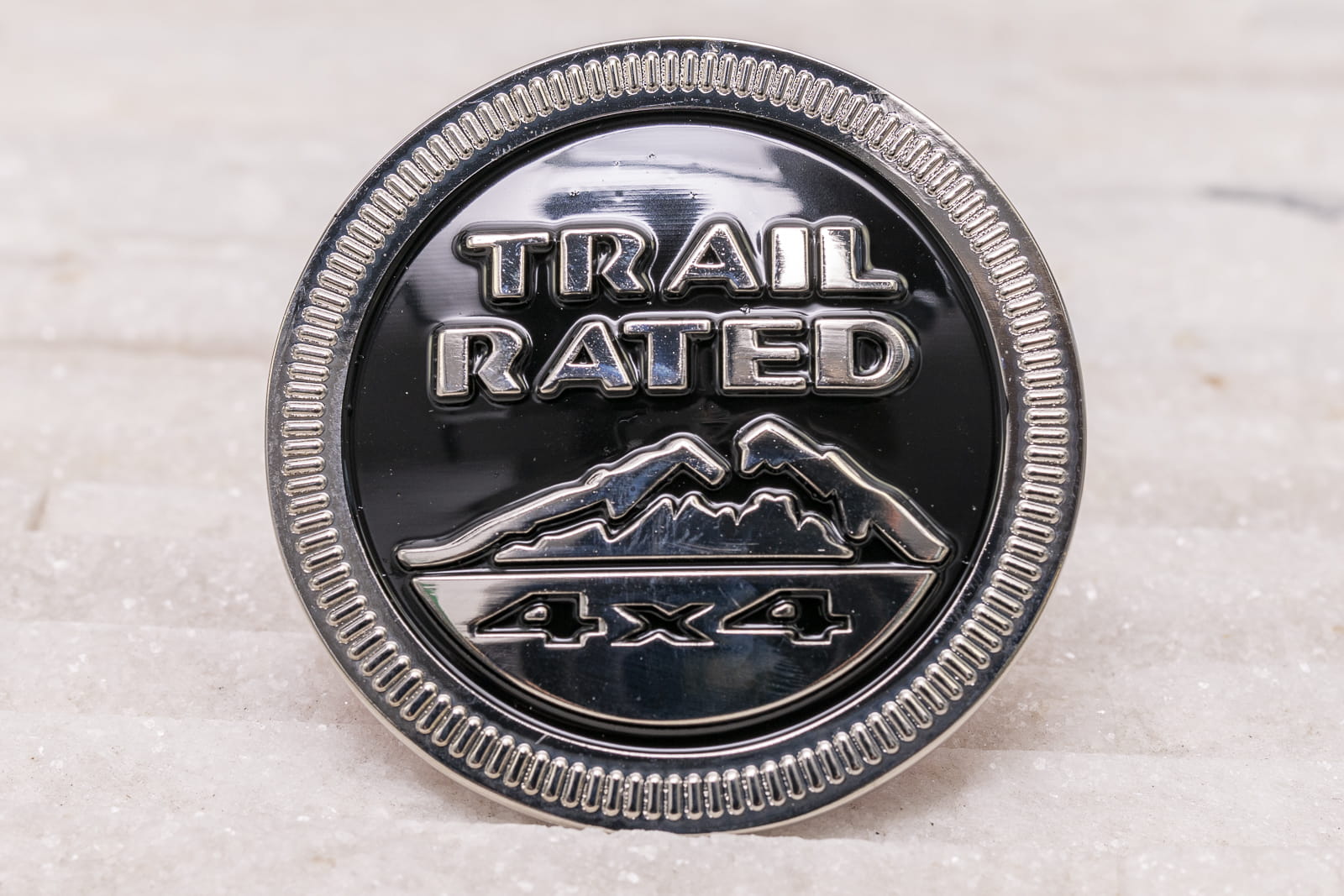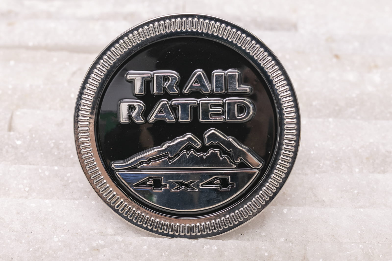 Dekoracyjny metalowy emblemat Jeep TRAIL RATED. Dedykowany do JEEP CHEROKEE III (KJ) / IV (KK) / V (KL).