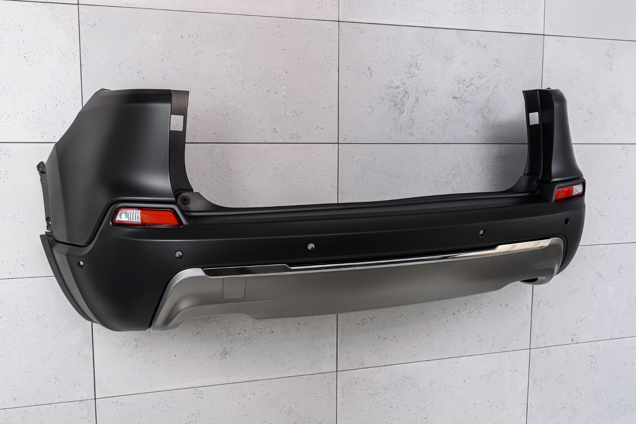 Kompletny zderzak tylny z otworami pod czujniki parkowania PDC, dla JEEP CHEROKEE V (KL) 2018-2023 (wersja po faceliftingu). Produkt posiada sześć otworów pod czujniki parkowania PDC.