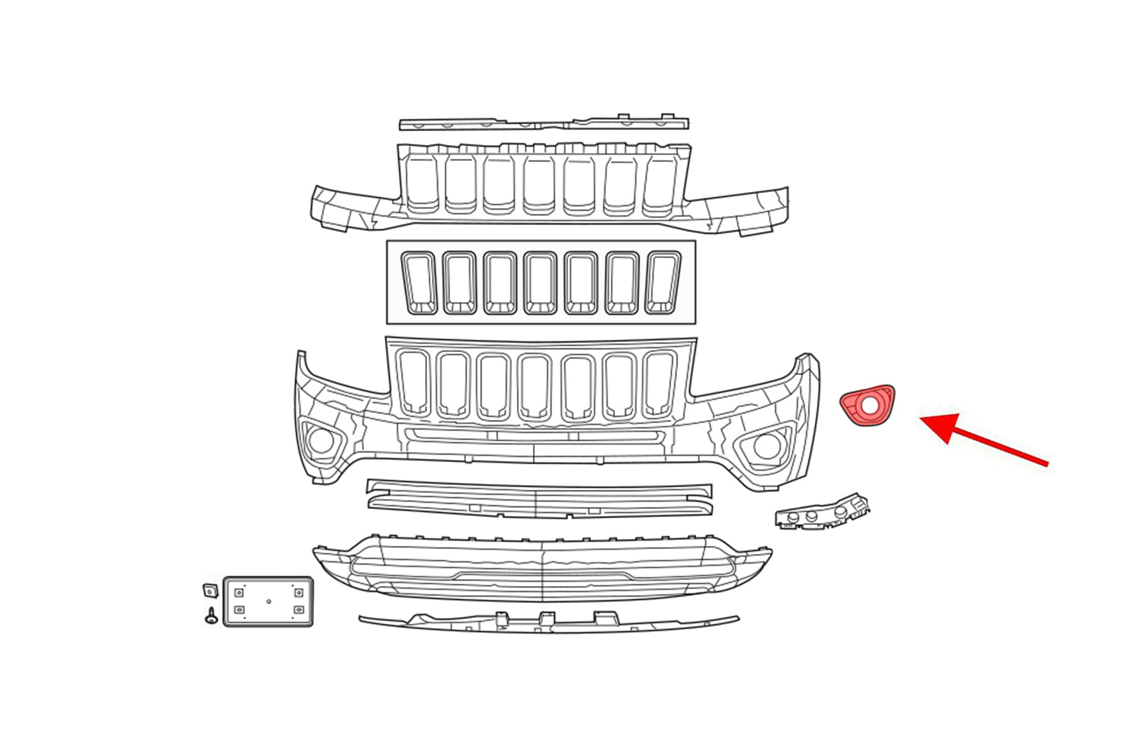 Kratka przedniego zderzaka z otworem pod lampę przeciwmgielną, lewa, do JEEP COMPASS I (MK49) 2011-2017 (wersja po faceliftingu).