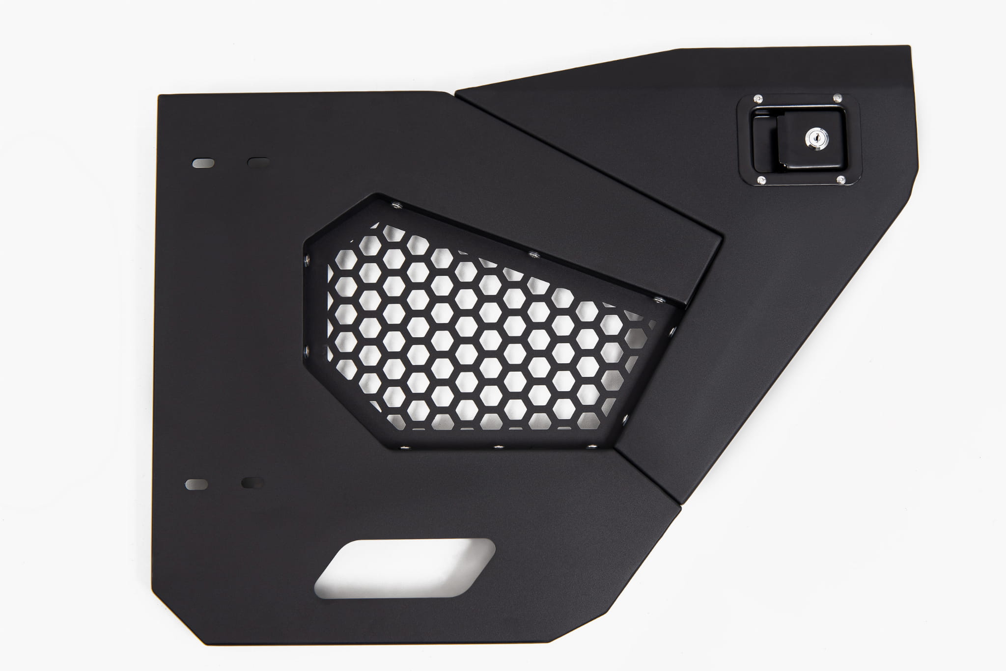 Drzwi wykonane są ze stali i pokryte są czarną farbą strukturalną. W komplecie z klamkami zamykanymi na kluczyk i kompletem lusterek. Wyróżniają się niewielką wagą i dużą wytrzymałością - grubość płyty stalowej to 5 mm!!! Doskonale spiszą się w terenie chroniąc wnętrze auta przed błotem i wodą jednocześnie dając swobodę kontroli trasy.