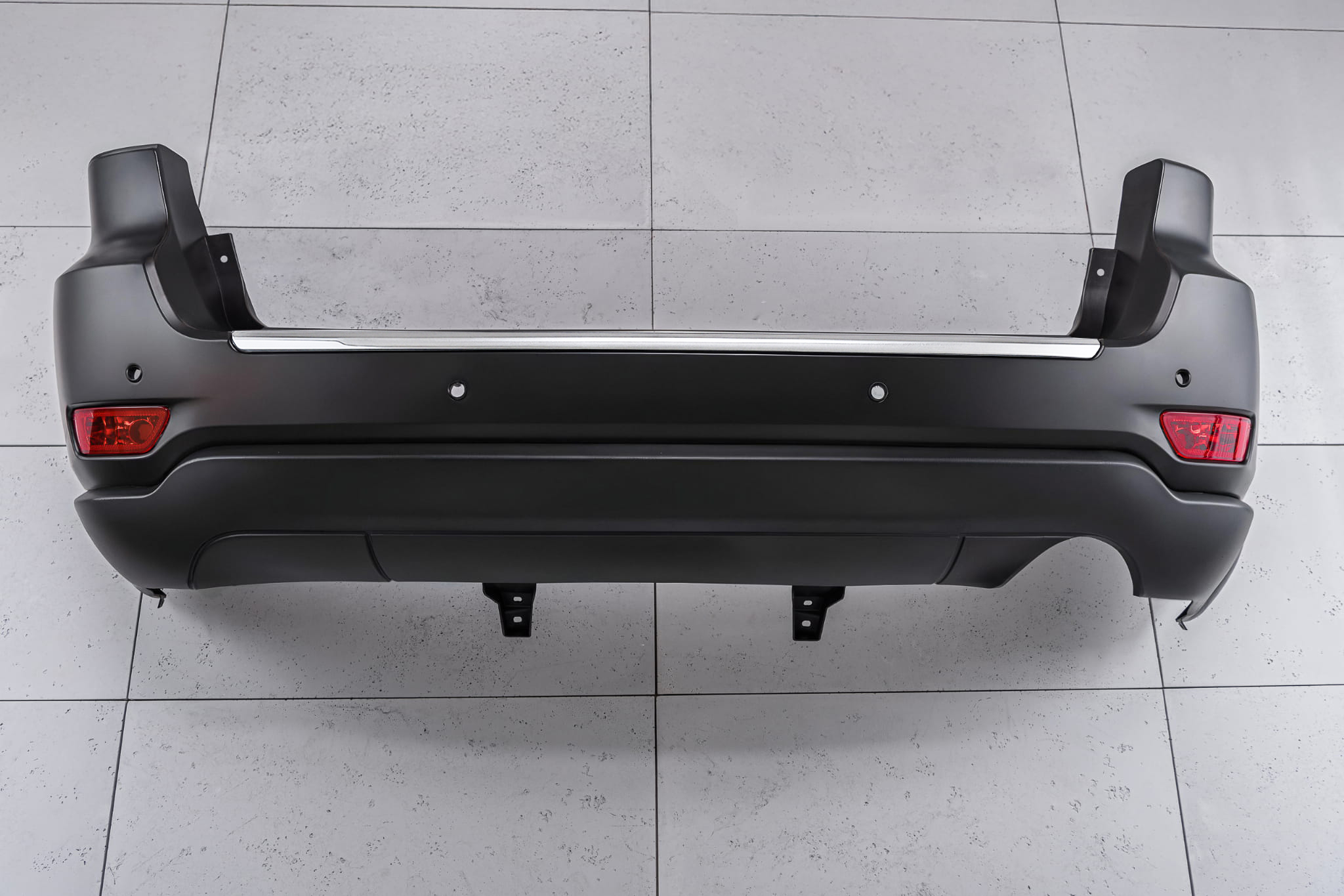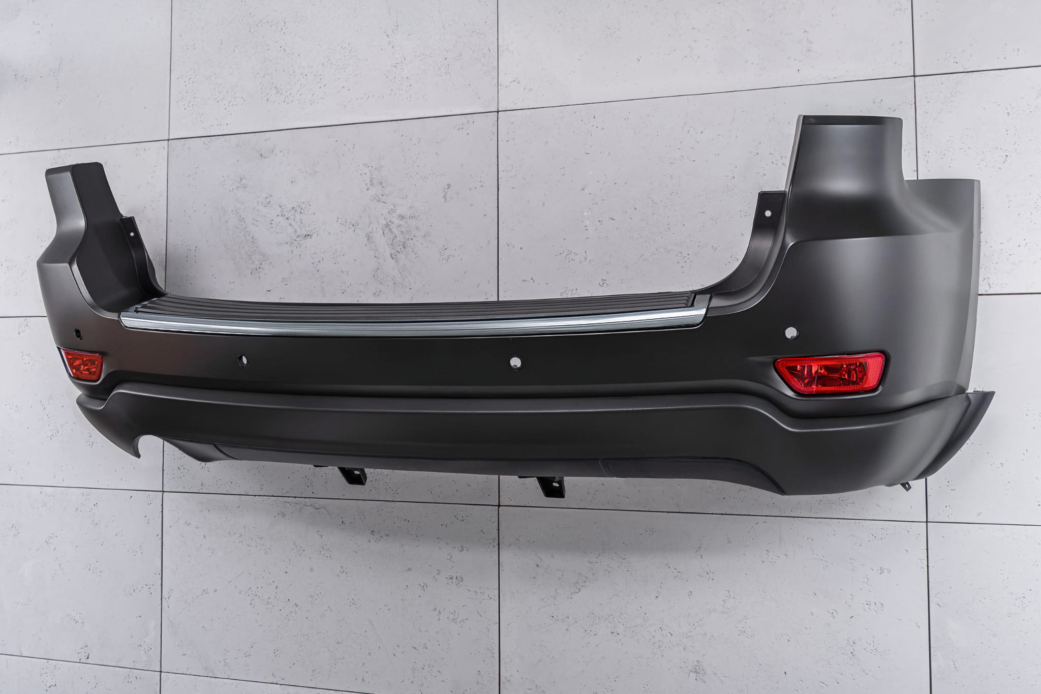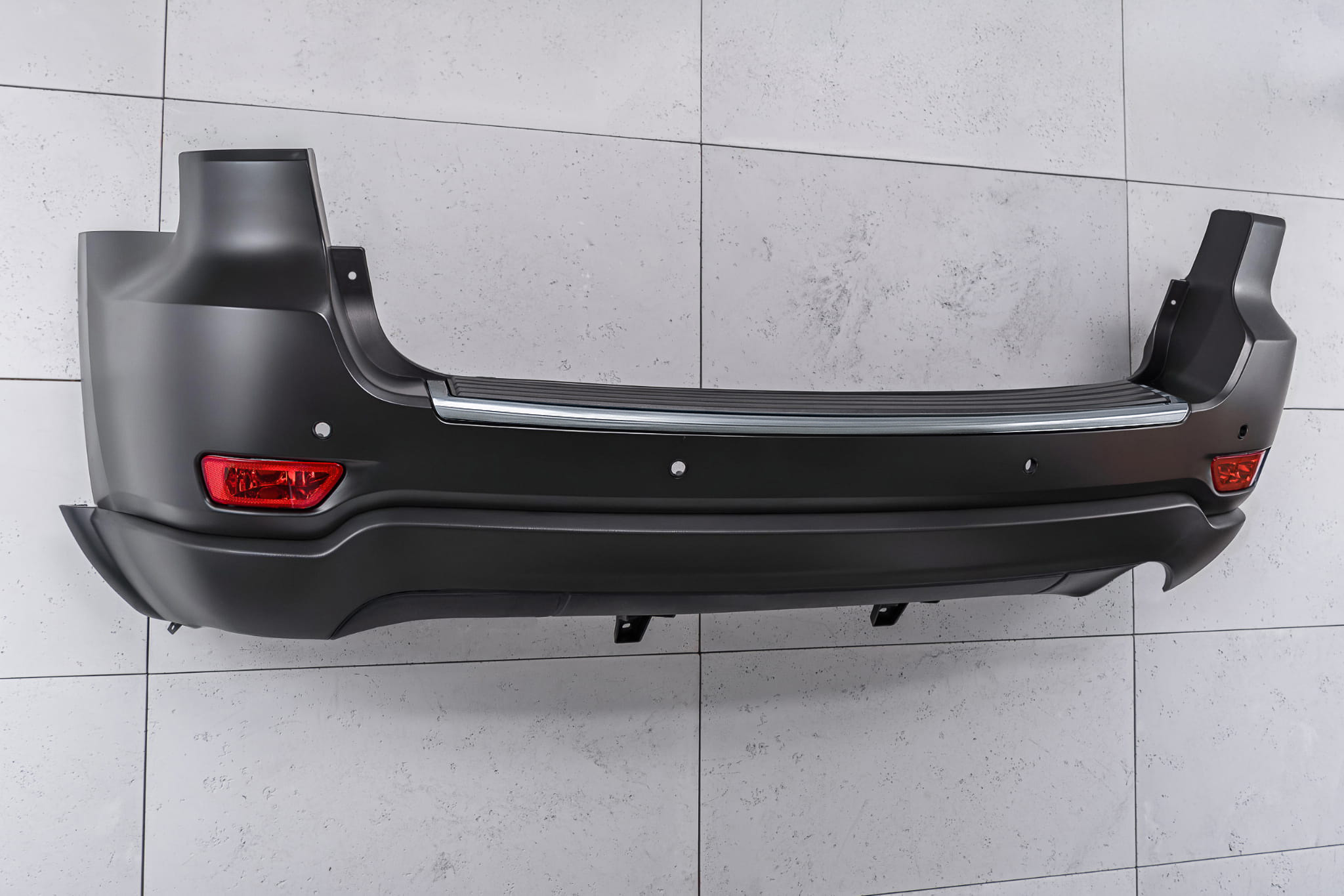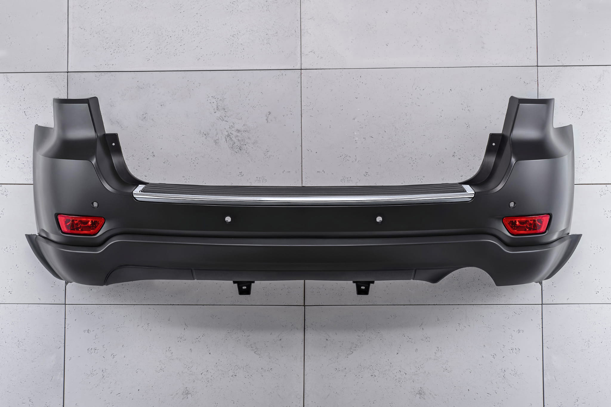 Kompletny zderzak tylny, dla JEEP GRAND CHEROKEE IV (WK2) 2010-2021. Zderzak posiada cztery otwory pod czujniki parkowania PDC. Nie pasuje do wersji SRT i TRACKHAWK.