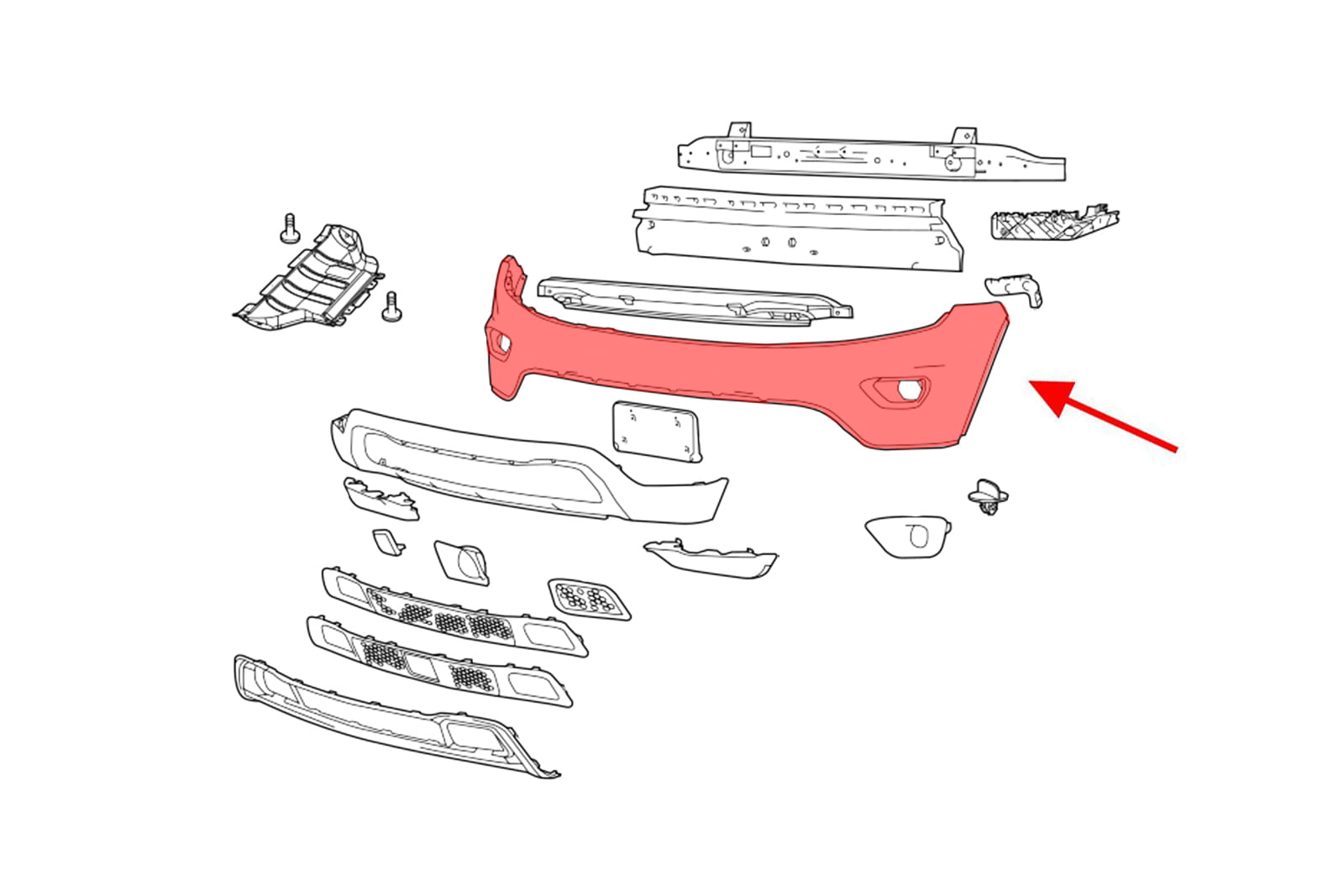 Zderzak przedni górny, dla JEEP GRAND CHEROKEE IV (WK2) 2014-2017 (wersja po faceliftingu). Wersja bez otworów pod czujniki parkowania PDC. Pasuje do wesji LAREDO, LIMITED, OVERLAND, TRAILHAWK.