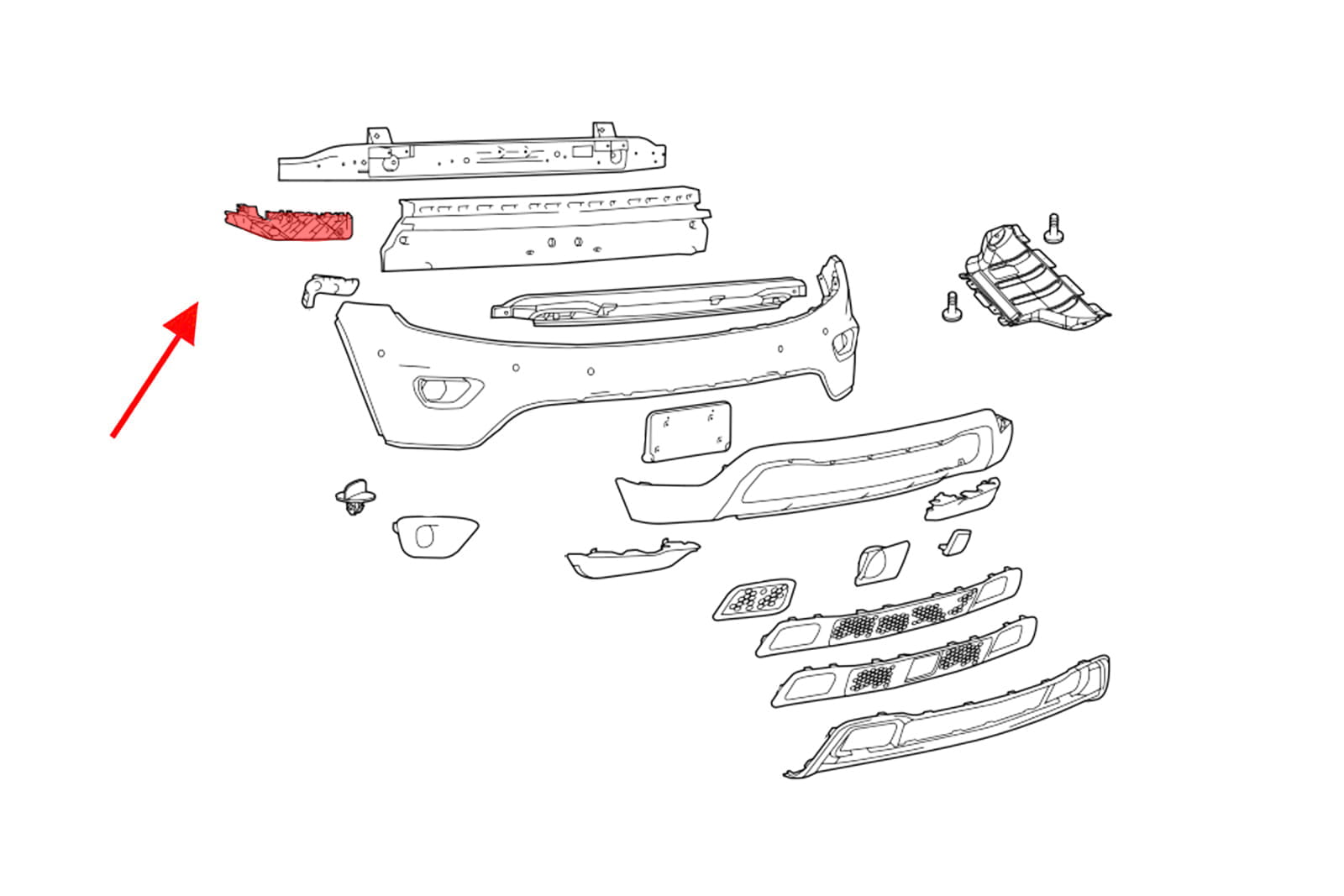 Ślizg przedniego zderzaka, prawy, dla JEEP GRAND CHEROKEE IV (WK2) 2014-2017 (po pierwszym faceliftingu). Pasuje do wersji LAREDO, LIMITED, OVERLAND i TRAILHAWK.